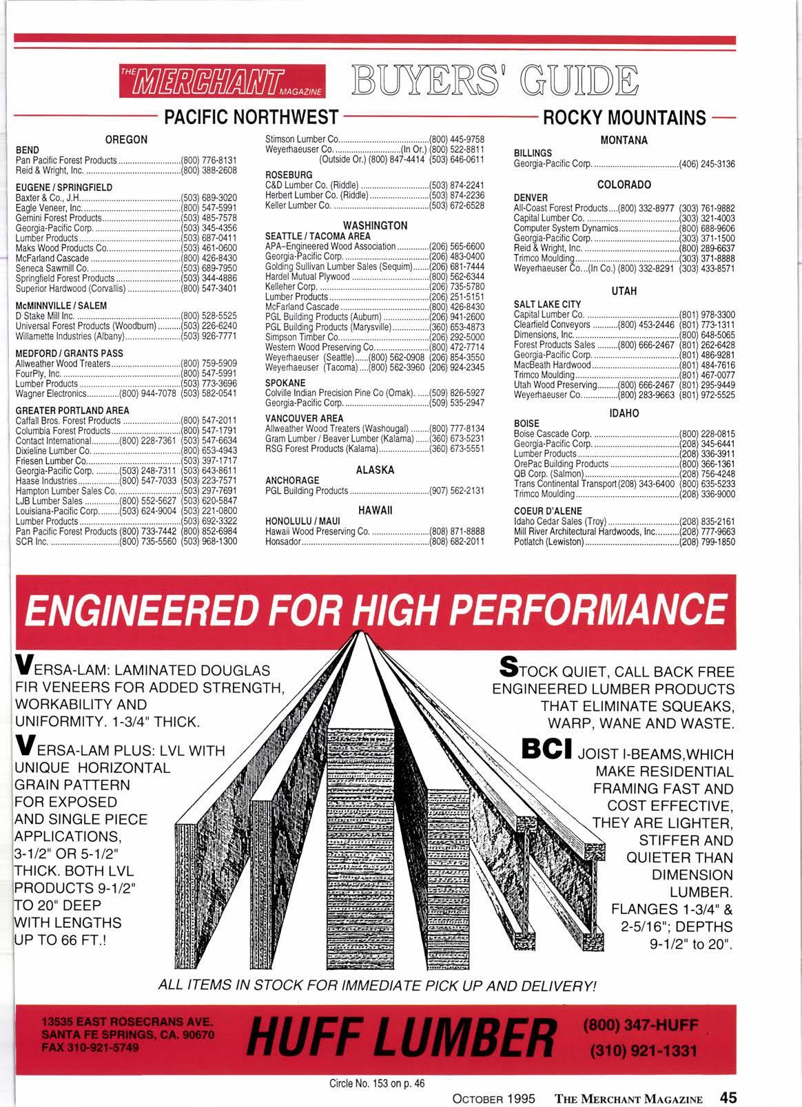 292-5000 Western Wood Preserving C0........................1800\ 472-771 4 weyerhaeuser (seartle)......(800) 562-0908 (206) 854-3550 Weyerhaeuser (Tacoma)....(8m) 562-3960 (206) 924-2345 SPOKANE Colville Indian Precision Pine Co (Omak). .....(509) 826-5927 Georgia-Pacific Corp ......(509) 535-2947 VANCOUVER AREA Allweather Wood Treaters (Washougal) ........(800) 777-8134 Gram Lumber / Beaver Lumber (Kalama)......(360) 673-5231 RSG Forest Products (Kalama).................,,...(360) 673-5551 ALASKA ANCHORAGE PGL Building Products...................................(907) 562-2131 HAWAII HONOLULU / MAUI Hawaii Wood Preserving Co. .........................(808) 871-8888 H0nsad0r................. ......(808) 682-201 1 ROCKY MOUNTAINSMONTANA BILLINGS Georgia-Pacific Corp ......(406) 245-3136 COLORADO DENVER All-Coast Forest Products....(800) 332-8977 (303) 761-9882 Capital Lumber Co. .......(303) 321-4003 Computer System Dynamics..........................(800) 688-9606 Georgia-PacificCorp ......(303) 371-1500 Reid & Wright, Inc. .........................................(800) 289-6637 Trimco Moulding...... ......(303) 371.8888 Weyerhaeuser C0...(ln Co.) (800) 332-8291 (303) 43$8571 UTAH SALT LAKE CIW Capital Lumber Co. .......(801) 978-3300 Clearfield Conveyors ...........(800) 453-2446 (801) 77$131 1 Dimensions, Inc. (800) 648-5065 Forest Products Sa|es.........(800) 666-2467 (801) 262-6428 Georgia-Pacific Corp MacBeath Hardwood .....(801) 484-7616 Trimco Moulding...... ......(801) 467-0077 Ulah Wood Preserving.........(800) 666-2467 (801) 295-9449 Weyerhaeuser Co................(800) 283-9663 (801) 972-5525 IDAHO BOISE Boise Cascade Corp ......(800) 228-0815 Georgia-Pacific Corp ......(208) 345-6441 Lumber Products..... ......(208) 336-391 1 OrePac Euilding Products..............................(800) 3661 361 QB Corp. (Salmon).. ......(208) 756-4248 Trans Continental Transport(208) 343-6400 (800) 635-5233 Trimco Moulding...... ......(208) 336-9000 COEUR D'ALENE ldaho Cedar Sales (Troy)...............................(208) 835.21 61 Mill River Architectural Hardwoods, Inc..........(208) Z7-9663 Potlatch (Lewiston).. ......(208) 7991850 Georgia-Pacilic Corp. ..........(503) 248-731 1 (503) 643-861 1 Haas6 Indusrries..................(e00i slz-2033 (503) 223-7571 Hampton Lumber Sales C0............................(503) 297-7691 LJB Lumber Sales ...............(8001 552-5627 (503) 620-5847 Louisiana-Pacific corp.........(sosi oz+-s004 i503i 221-0800 Lumber Products..... .......(503) 692-3322 Pan Pacific Forest Pr0ducts (800) 733-7442 (800) 852-6984 SCR Inc. ..............................(800) 735-5560 (503) 968-1 300
