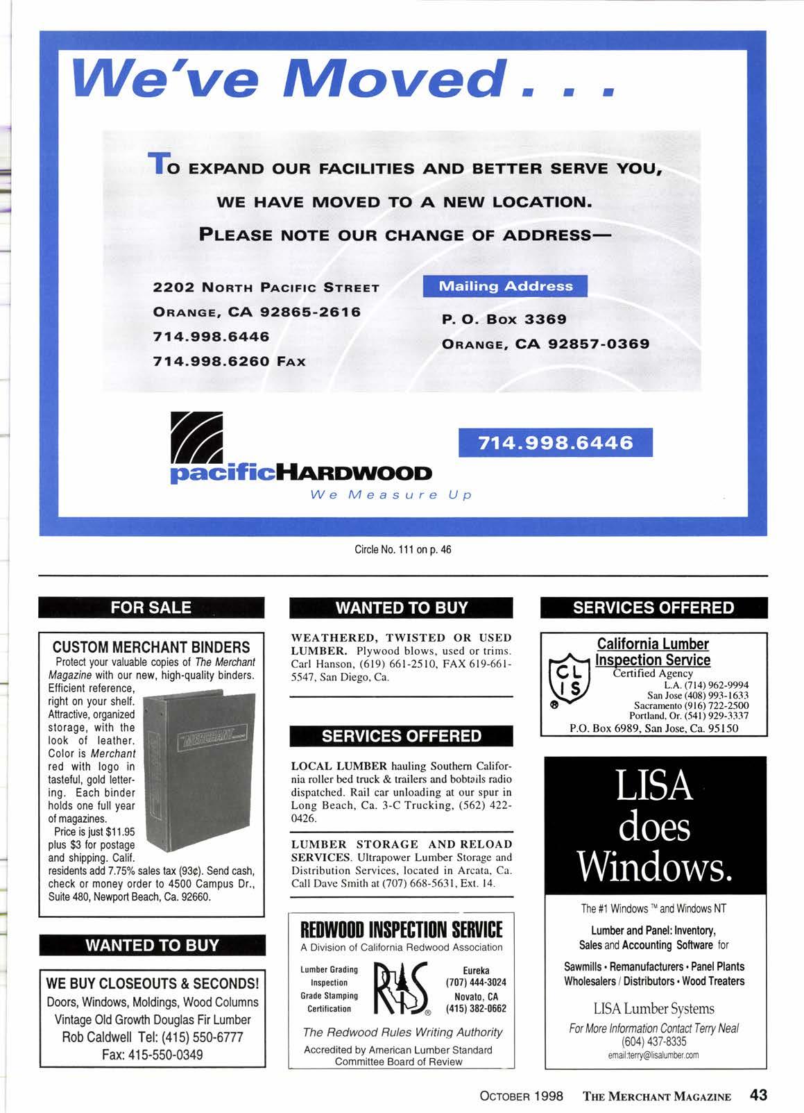 Merchant Magazine, Inc. Cover and enlire con. lsnts ate fully protscted and musl not bs reproduced in any manner without written peimisslon. All Rights Reserved. lt reserves lhe dghl to accept or reiect any editorial or advertising matler, and assumes no liability lor materials fumished to it. DEEP TRADITIOil OF QAAIIIY AIID SERVIfiE Doug fir lffP 1x2*4x12 & larger Redwood l$D S4S & patterns Redwood uppcrs & eommons Oedar lfft) STK Ro. Sd$ & patterns Cedar l,ffD C&Btr. Ro. $4S & patterns PRODUCT SRT€S CO. 2202N. Pacific (P.0. Box 4989), Orange, CA 92863-4989 (714) 998-8680 . (800) 660-8680, FAX714-921-8249 Since 1965 Circle No. 104 on p. 46 4 Ttm MpncH,c,xr MlcazlnB OcroBER 1998