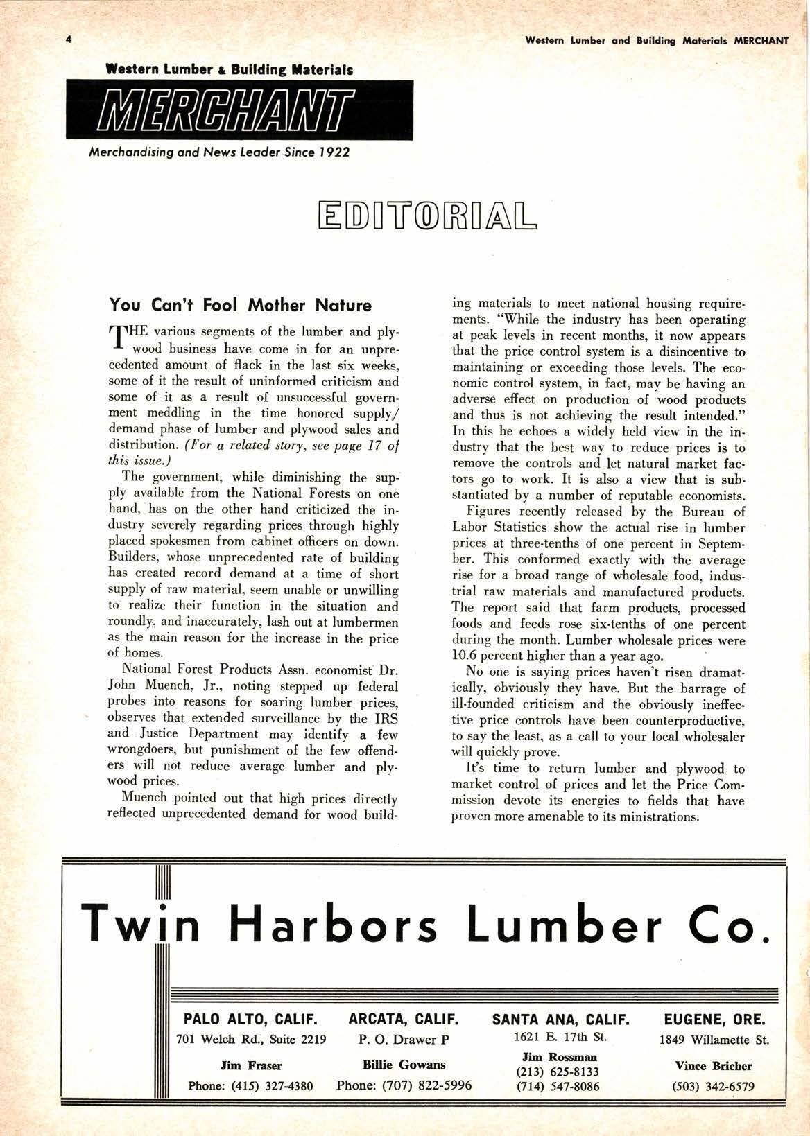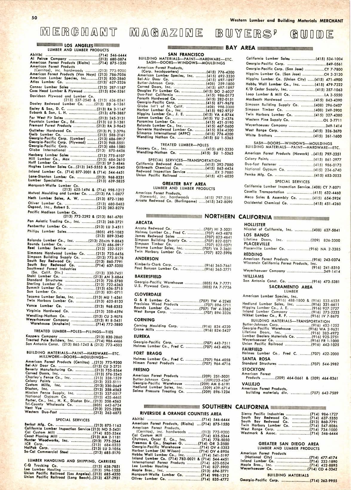 ABfTfBf .......-......-. -....................... 27 Ar. PErtcE co. ....,.-..........................-.-......_........... 22 AI'IERICAN FORESI PRODUCIS CQRP.. lUltDlNG A,IAIERtAtS DtV. .-....;............-.......... 3 A,tERICAN |U ,ISER SPECTES ...-...---,-._..___.... 36 BEf.-AtR DOOR CO. .............................-........-... 28_29 BERKOT t ANUFACTURtNG aO- ......._._._._._....... ot BEVERTY I,IANUFACIURING CO' ...._....................... 20 cAsEtlA InANSPORIATtON CO. ............-............- 36 CHARTEY'S FENCE CO. ....-....... ra3 coNNoR |-UMBER CO. ._.....-. 21 c.Q TRUCKtNG CO. ..........._.-..........-._..-.-......-....... 26 CRANE A{il.ts ........-.._..............- 33 DANI & RUSSE| I .........".-....._-.. 45 DAVTDSON prywooD co. ..-._.-...._....,................-. ao DUKE CtTy tuMEER CO. ...-...... 33 quo-rAsT FASTENETS ...-.........- 32 E$lEy q soN, D. c. ...............-.................-....,.. 35 FrEfiONt FOREST pRODUCTS ........-............-......-... 4l GEOIGIA-PACIFIC CORP.................-........-...- Covcr I G & I LUMBET CO. -.-..................-....................,... 52 HEDTUND tur BEt co. ........-... 43 HEXBERG TUMBER CO. ..........._- 5l Hltt lurilBER co., l{Ax ......._..20 HOBBS WArI lUl,tBER CO. ........-......-:............-...... ?3 tlotilES LUl,tBER CO., FRED C. .-....-......-....-.-..--... 3,a HUFF lUl,lEER CO. ..-................_.....-_......-.....-...-..... 3l TNtAND IUMBER CO. ......._.........-..................... t4.t5 TNTERNATTONAt. FORESI ptoDUCrs .................-.. 37 TAMON tUMBEt CO. ..................._.._._.-__.._.-..... 3l t!,E TUMBER HAUT.|NG ...........- 2 lltEIlME DOORS, tNC. ...."..... 4r IOOP lUir,lBEt & l,ll l.l, CO. ..--..............-...-.._......... /a2 rt^ARflNGAt E pApER CO. -......... 40 T ARQUART.WOIFE TUMBER aO. .._.._._.___.-._.. 3a A{lSSlON FENCE SUPPLY. tNC. ...................._....,1? r UTUAI ilOtDtNc & lur 8ER CO. -........-........... rz NATfONAf. GypSUM CO. ..........._......_.............._ 6_7 NETH T.UMBER SAtES, A.W. ..........._................... 52 NtcolET OF CAUFORNTA .........-..-..-........-.....-.... 35 NTKKEt rUA,{BEt @,. R.F. ..........-.......-..........-...... I oscooD, rNC., ROBERT S. .........................._...,(,( PAC|f tc A4AD|SON lUA4BEn CO. ..-.....-....-............,25 PAN ASrATlC rrADtNG @. ....._.-..-........-........... 48 PAUt BUNyAN tUMStR CO. ......-..---...-......-....,.....- 39 PENBERTHY tUnBER CO, __...__..___.-..._... Cqvs tl PH|lrps LUI,tBER SAT ES .................-..-.-................... 43 ROTANDO IUTBER CO. __.-.-.- 37 sAN ANTONTO CONSTRUCTTON CO. ...............-._ 5 SELl,lA PRESSUTE TnEATtNG ......--.-.-.....--..--.....-...,tO SOUTH BAY tUMEEt CO. Covcr ill STANDARD STRUCTURES .......-.-.. ?I STERIING LUI'IBER CO. ....-....... 5l suA,tl{rT tuAsER @. ..................-........................- 19 suN lun8ER CO. ...--.................-......................-...... 26 TACOMA tUMBEt SArES .....-._.........-.....-............... 30 rEcH.sAt ES CO. ........-...................-................_. It_12 TWIN HARBORS LUl,tBER CO. .......................-..-..... l WESTERN WOOD PRODUCTS ASSN. ............,..-.... 9 wEsT coAST tUMEER tNSp. BUREAU .-.............-.- t7