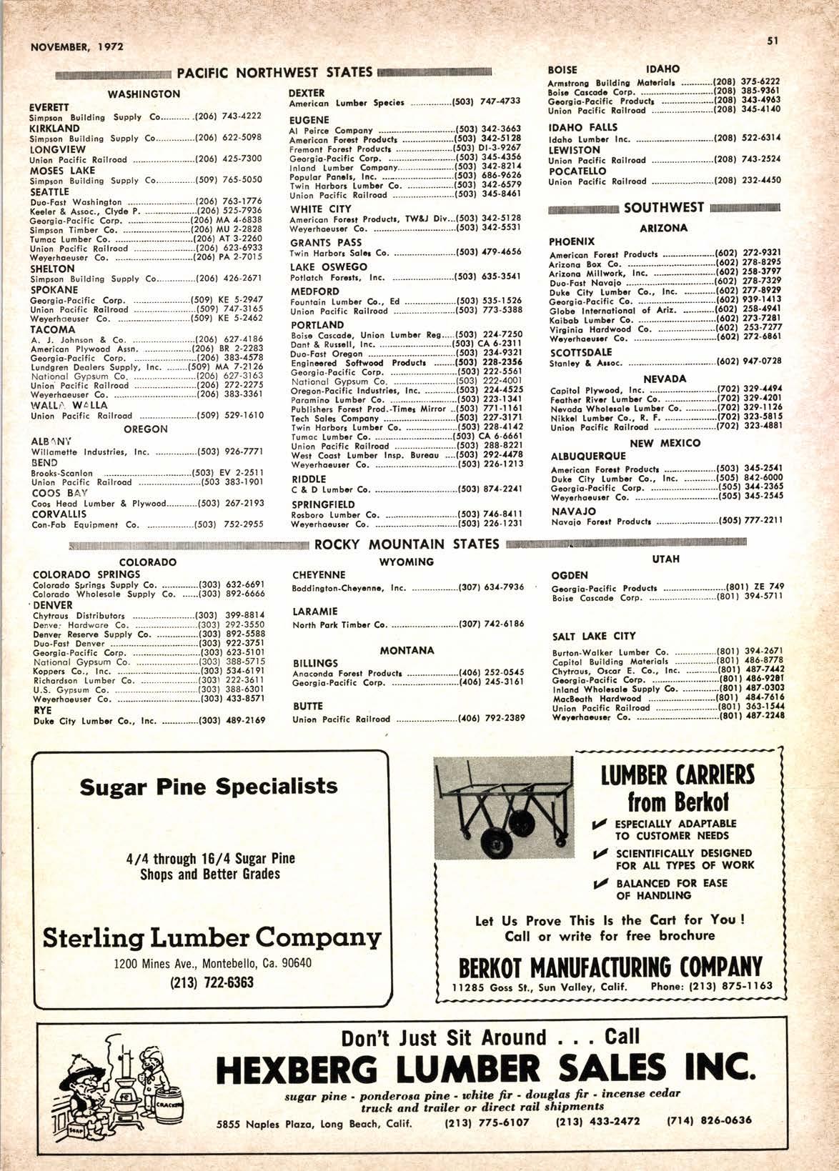 iil|lliii|illlll[lilillllllll souIHwEsT illllllllllllllllllllllllllllllllllllllllllll ANIZONA PHOENIX Amcricon Forcrt Producb -------.....-'--"'{6021 272'9321 Arizonq Bor Co. ..----.-..-..---..-...---.----....(602) 278'9?91 Arirono M I lwork, nc. ----.----.----- - -(6021 2 58-97-?7Duo-Folf Novoio .---16021278-7329 Dukc Ciiy lumbcr Co., tnc. ------..(60?l ?77'99?l Goreio-Pocilic Co. ....--.....-----.----------.--16921 ?1?-l1ll GioU-. tntqnotionol of Ariz. -.---...-...(602) 258'49''l ioibob tu.,b.t Co. .......-----.-.---..-.-.......(602) 273'l?81 virgiiio Hqrdwood Co. -...-...-.--.----.-16021 2t?'7?77 W.io.ho.u.., Cc. -.-..-----.---------.-----.-..16021 272-6861 scoITSoAU Stonfcy & Artoc. -.----..--....-.-.--...-.-.----..(6021 917'0728 NEVADA Cqpitol Pfywood, lnc. ........--.-..-.--.-.---.l7O2l f29-1111 Fcothcr tiior tunbcr Co. ----.-.----------.--17021 329-f201 Ncvodo Wholorolc lumb.r Co.-----.--.-'-(202) 329-l | 26 Nikk.l tunb.r Co., t. f. .-...---.--------..t2021 323'5815 Union Pacific Rqilrod ..----.----..--..------.(2021 323'4881 NEW 'l^EXtCO ATBUQUENQUE Am!.icon Forqf Productt ...-.--......-.....(5031 3'a5'2541 Duk. City Lunbcr Co., Inc. ....-.-.-'..15051 812-qgOq Gcorsio-Pocifi< Corp. ---...-...-.-..'-........-(505) 311-2365 Weycihocurcr €o. -.-.----......---.-----------.--(5051 315-25a5 NAVAJO Novoio Fo.c.l Producb --...--...---..........-15051 777'221| UTAH OCDEN Gorgio-Pccific Producls --.-..-.------.----.--..(801) ZE 7'19 EoisJ Corcodo Corp. ..----.-...--.----....---'(801) 394-5711 SAIT IAKE CITY Eurton-wolkor lumbor Co. -......--""'(801) 39''-2671 Cooitol Buildins rrlorcriolt -.....--...----(8011'186-8778 Ciirou., orcoi E. co., Inc. ..---.......(8oll ry7-7!a? Gqeio-'Pqcific Corp. ...........-..-..-.----.--(801) 49q'??q! lnlond Wholqolc Supply Co. -.--.-...--.--(8Oll /t8t'0303 MocBqth Hordwood .--.------.-.--------....(8011484'7616 Union Pocific Roilroqd --...----'---'.-'-.-.--(801 I 363't5'l'' Wovrrhocutcr Co. --.------------..---.------.--(801 ) 18f -2?1E 1UMBER ORRITRS lrom Berkof y' especlAt|' ADAPIA8LE TO CUSTOMER NEEDS y' scrENTrFrcALtY DEstcNEo FOR ALt IYPES OF WORK y' BAI,ANCED FOR EASE OF HANOtll,lG let Us Prove This ls the Cqrt for You ! Coll or write for free brochure BERI(OI MAilUTAfiURIlIO (Oi,IPAIIY Sugar Pine Specialists 4/4 through 16/4 Sugar Pine Shops and Better Grades Sterling Lumber Company 1200 Mines Ave.. Montebello. Ca.90640 (213) 722-6363 Don't Just Sit Around HEXBERG LUMBER ...Gall SALES INC. Eugar pine - ponderosa pine'white fir - ilo,ug-las fit ' incense ceilar truck and irailer or ilircct rail shipmen s 5855 Noples Plozo, tong Beoch, colif. t2l3l 775-6107 l2l3l 433-2472 l7l4l 825'0636 I1285 Goss St., Sun Volley' Colif. Phone: (213f 875-t153