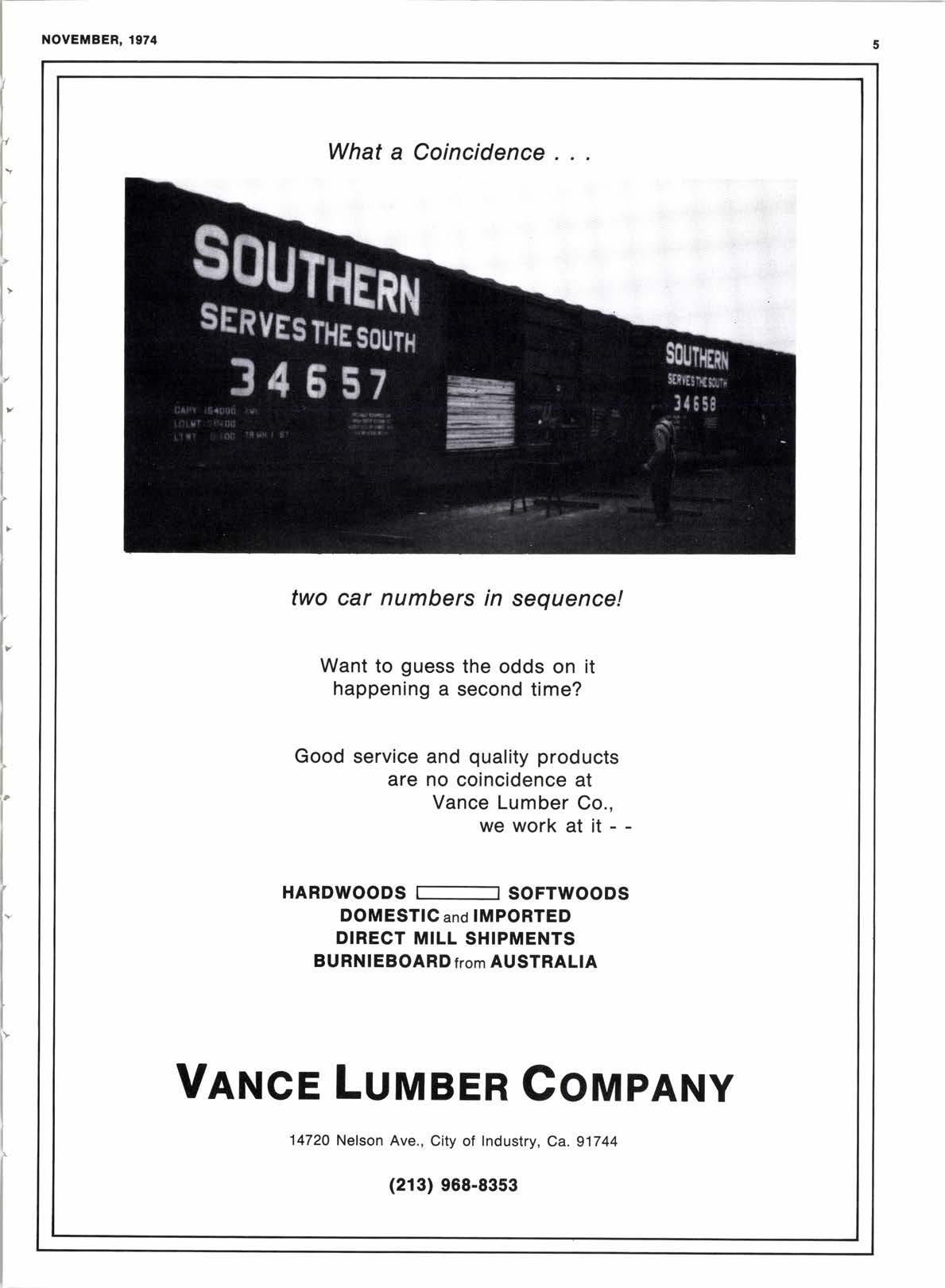 Want to guess the odds on it happening a second time? Good service and quality products are no coincidence at Vance Lumber Go., we work at it -HARDWOODS r--l SOFTWOODS DOMESTIGano IMPORTED DIRECT MILL SHIPMENTS BURNIEBOARD trom AUSTRALIA VnNcE LuMBER GoMpANy 14720 Nelson Ave., City of Industry, Ca. 91744 (213) e68-8353