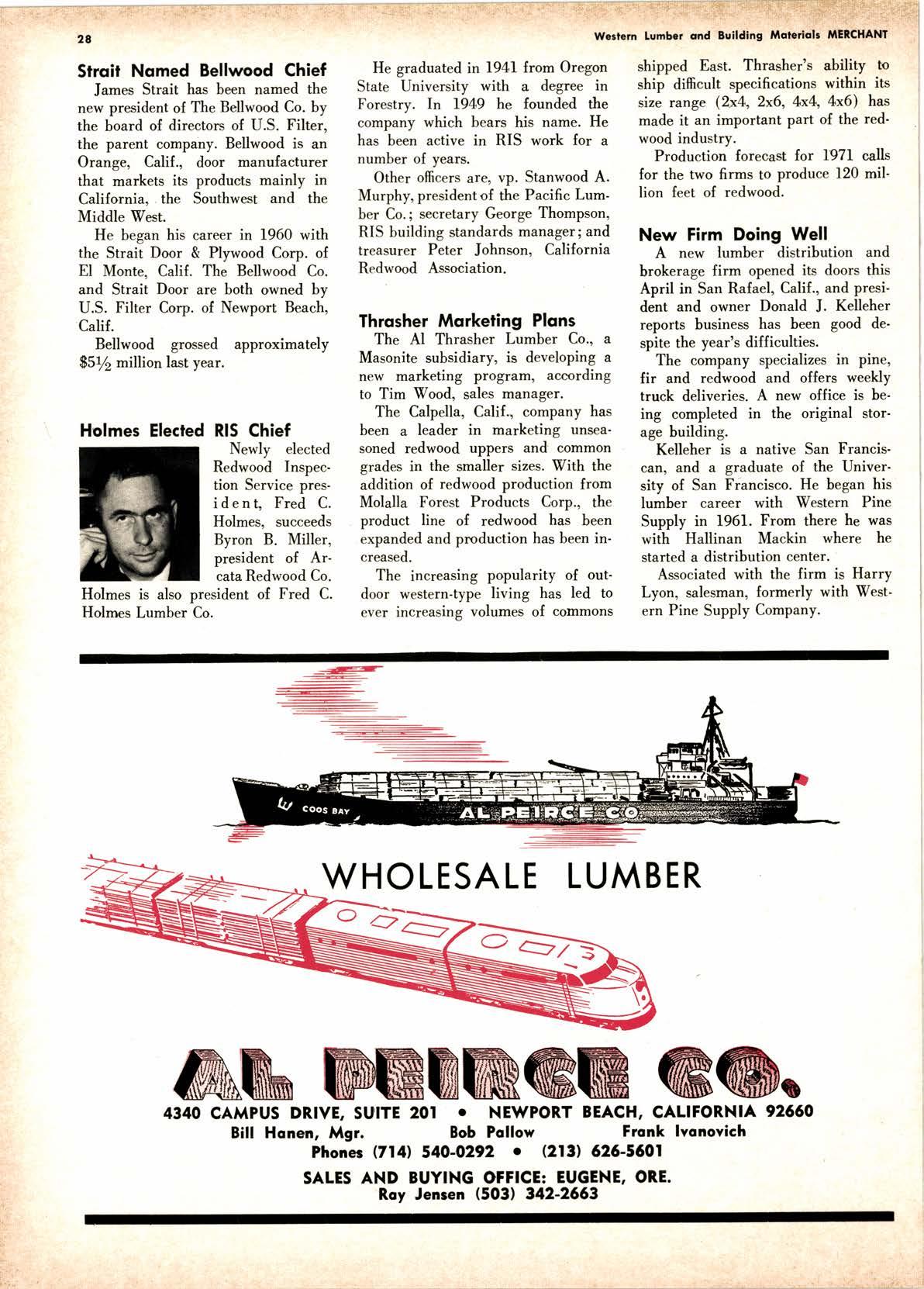Newly elected Redwood Inspection Service president, Fred C. Holmes, succeeds Byron B. Miller, president of Arcata Redwood Co. Holmes is also president of Fred C. Holrms Lumber Co.