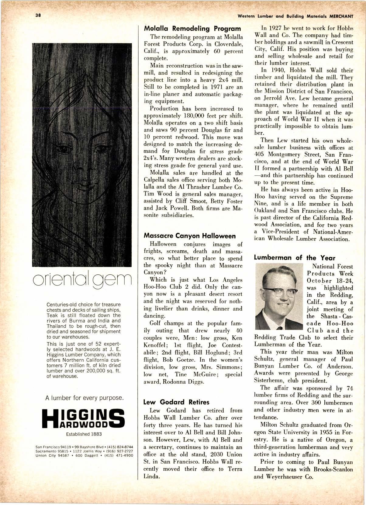 L,ew Godard has retired from Hobbs Wall Lumber Co. after over forty three years. He has turned his interest over to Al Bell and Bill Johnson. However, Lew, with Al Bell arrd a secretary, continues to maintain an office at the old stand, 2030 Union St. in San Francisco. Hobbs Wall recently moved their gffice to Terra Linda.