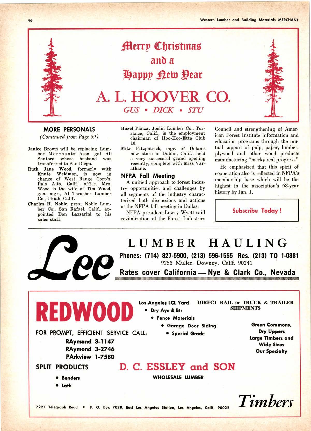 Ruth Jane Wood, formerly with Knute W'eidman, is now in charge of West Range Corp's. Palo Alto, Calif., office. Mrs. Wood is the wife of Tim Wood, gen. mgr., Al Thrasher Lumber Co., Ukiah, Calif.