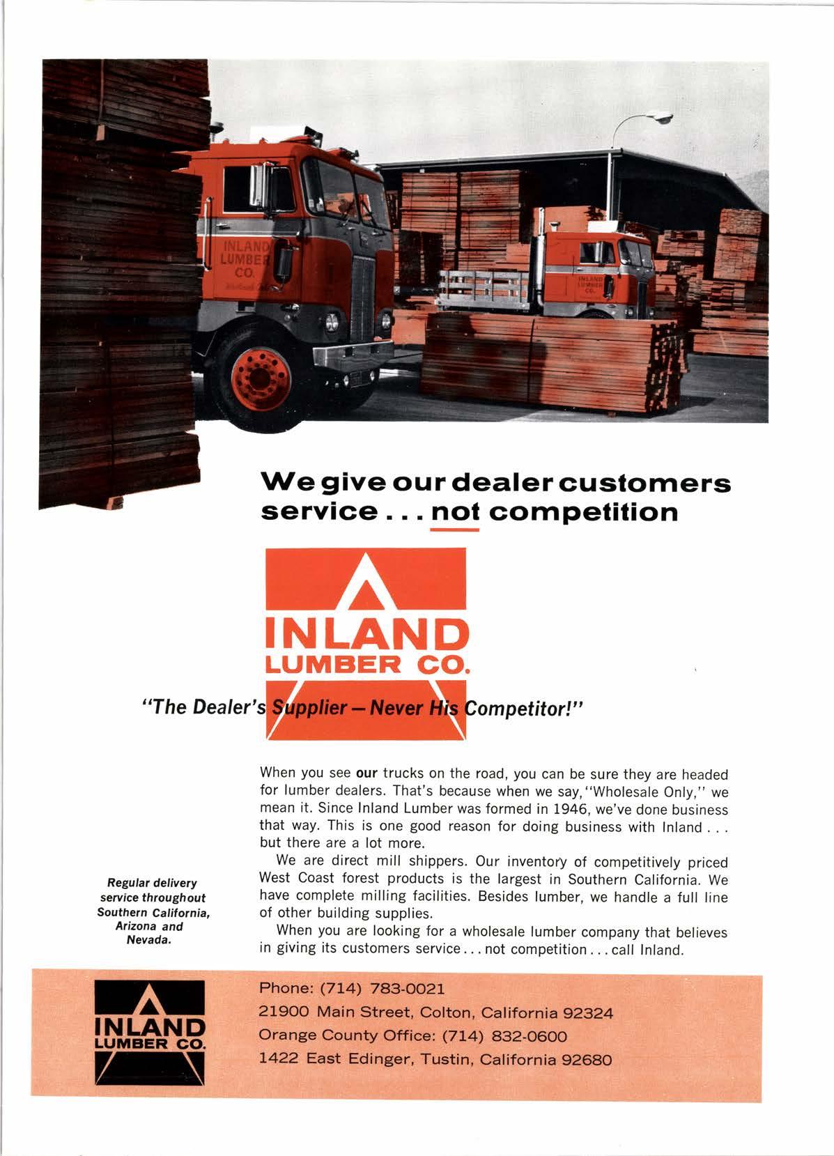 When you see our trucks on the road, you can be sure they are headed for lumber dealers. That's because when we say,"Wholesale Only," we mean it. Since Inland Lumber was formed in 1946, we've done business that way. This is one good reason for doing business with Inland... but there are a lot more.