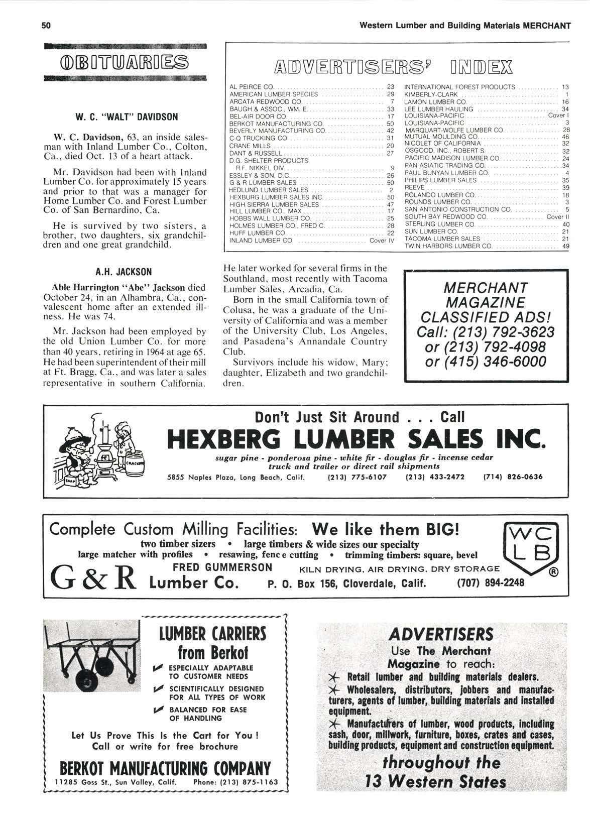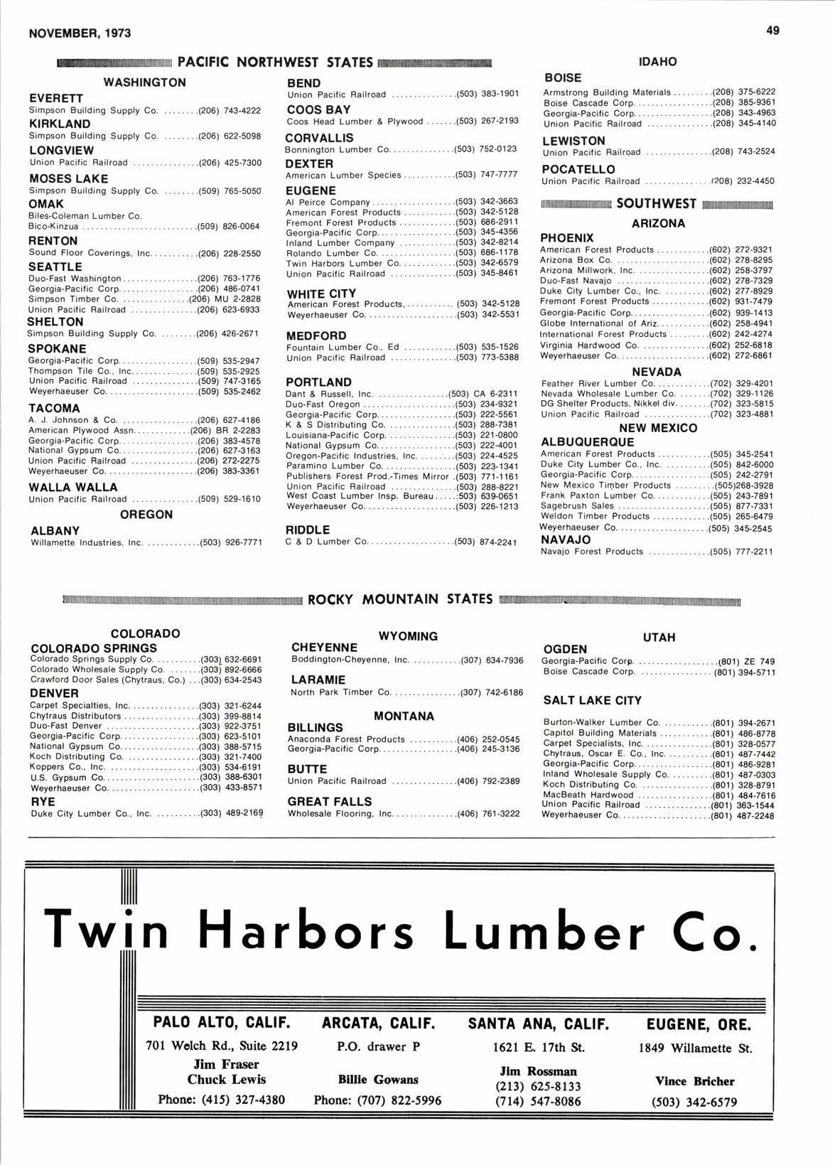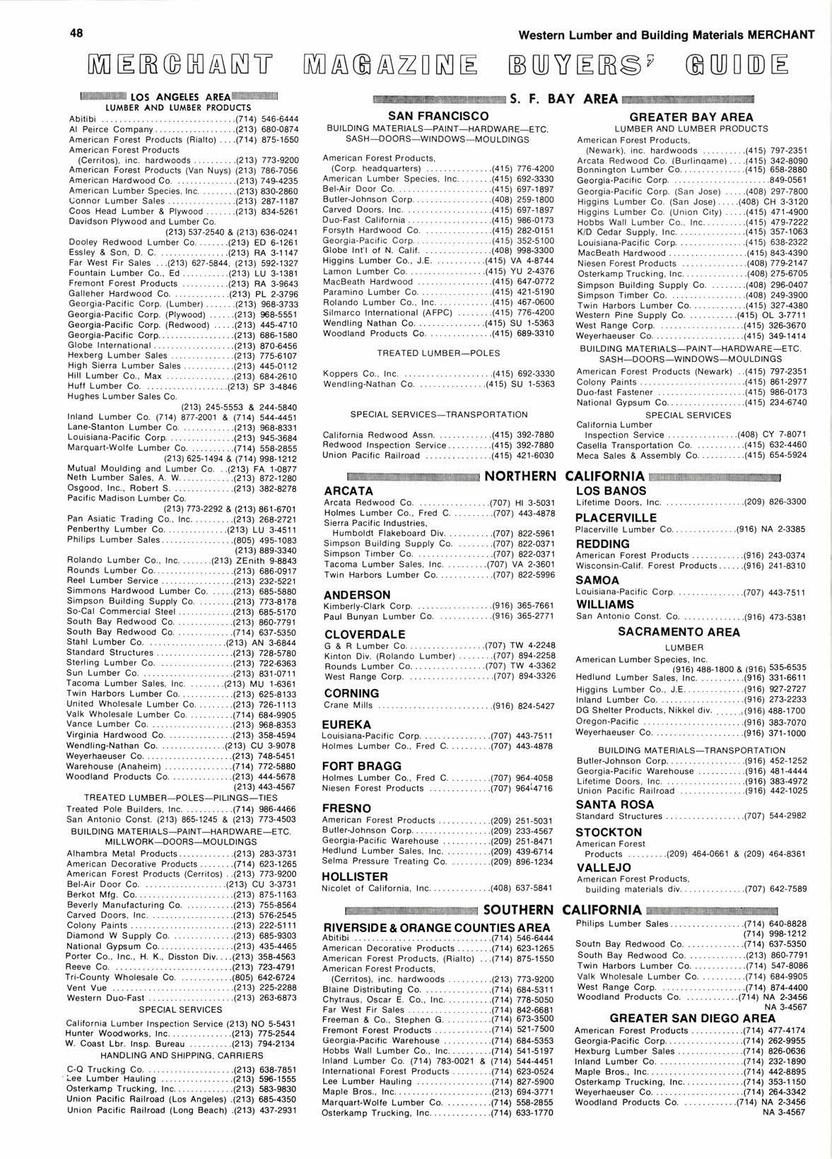 CALENDAR CLASSIFIED ADS BUYERS CUIDE ADVERTISERS INDEX THE SOUTHLAND PERSONALS NEW PRODUCT NEWS NEW LITERATURE LETTERS SECTION OBITUARIES EDITORIAL PAGE NEWS BRIEFS MONTANA NEWS NORTHWEST NEWS LMA NEWS & VIEWS ARIZONA SCENE 26 32 36 45 46 50 Iledlrrnd Lrrrnber Salesr fnG. 5550 ROSEV|ILE ROAD PHONE (916) 331-6611 . NORTH HIGHLANDS, CAUF. 95660 I Western Woods: gsf,avpinefirhem fir Z Speciolized lumber lor the mobile home rnanulacturers Z Laminated beams and arches Z Treated lumber I Redwood TRUCK AND RAIL DELIVERY