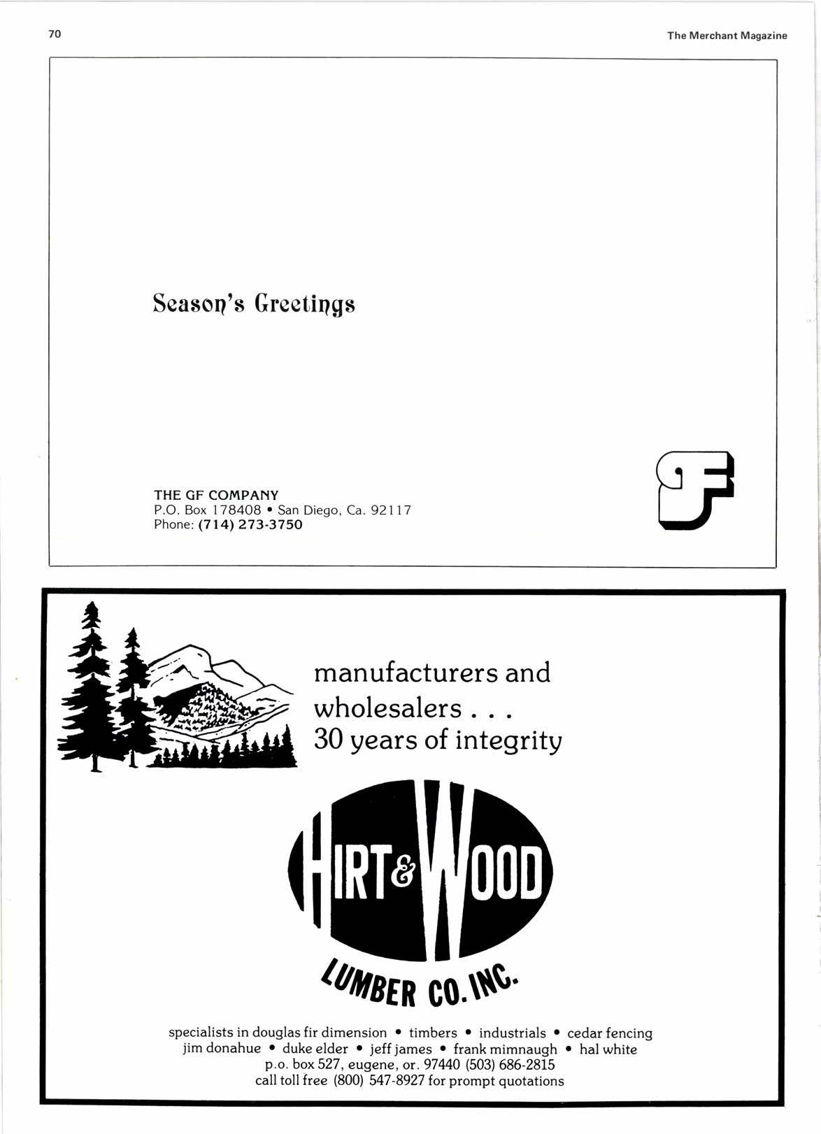 fonnot ALL COAST FOREST PRODUCTS. . 43 AL PTERCE CO... 90 AMERTCAN HARDWOOD CO.. I 17 BAKER HARDWOOD....... 't9 BEACHWOOD FOREST PRODUCTS.............. l0l BEAVER LUMBER CO....... ........... 99 BEL-AIRDOORCO....... ..............23 BEVERLY MANUFACTURING CO,, 98 BONNINGTON LUMBER. .....,.,..... 90 BOWMAN LUMBER SALES.., .,...... 106 BURNSLUMBER CO........ ............3 BYRNE TRUCKINC........ Cover ll CALIFORNIA BUILDERS SUPPLY.,.........,.... 65 CALIFORNTA REDWOOD SALES................. 86 CAL.PACIFIC MANUFACTURING CO...,.....,.. 38 CAPITOL PLYWOOD. 52 CARDWELL FOREST PRODUCTS, , , 54 CARROLL MOULD|NG. ............... 99 cHozEN TRUCKINC.. ...93 coAsT wooD PRESERVINC. 88 COLUMBIA CALIFORNIA LUMBER SALES.. 45 CoMPASS LUMBER PRODUCTS.................. 20 CONNOR LUMBER SALES... o CoNTACT LUMBER CO.. . 51 CRANE MfLLS.. .............26 cRowN plywooD......... 25 cRowN REDWOOD CO..... .......... 84 DANT & RUSSELL. tNC..... ........... 40 DE DOORS. 56 DELAH TIMBER PRODUCTS.. ......... 2I DELTA FOREST PRODUCTS.. ......... 94 DMK-PACIF|C. 36 DOOLEY REDWOOD CO........ tol DENVER RESERVE SUPPLY CO.. 92 EELRIVER SAWMILLS. 104 EMERSON HARDWOOD.. 98 ESSLEY & SON. D.C... ......... 95 FEATHER RIVER MOULDING.............,,.... 9I FIR & PINELUMBER CO... 100 FLOOR SERVTCE SUppLy.. ......... 85 FOREST PRODUCTS TRANgPORTATION....,,.. IO5 FOUNTATNLUMBER CO.. 8D... .. .. .. .. 5 FREEMAN & CO.,STEVEN c... ....... 83 FREMONT FOREST PRODUCTS.. 48 GALLEHER HARDWOOD CO.................... 107 GFCO... 70 GLOBEINTERNATIONAL... COLDINGLUMBERSALES...,..................63 IO5 J. E.HTGGINSLUMBER CO....................... 69 HILL LUMBER CO.. MAX... 46 HIRT & WOOD.. 70 H & M WHOLESALE. INC.... .......... 6t HOBBS-WALL LUMBER. J4 HUFFLUMBER CO....... ............. 95 JERSTEDTLUMBER CO.. 57 JUSTUS LUMBER SALES... ............ 58 KELLEHER LUMBER SALES.. Cover I KINZUA CORP.. 32 KNOLLWOOD CORP.... ........... ,..73 LAMON LUMBER CO........ ...........5l LARRY LARSON LUMBER CO.. ......... 72 LEWISCO..PALMER c........................... 64 LUMBERMENS CREDIT ASSN... 109 LUMBER PRODUCTS. ............... 109 MACBEATH HARDWOOD CO.. 20 MANKE LUMBER CO.. ... ...... .15 MARTNERS FOREST PRODUCTS. 67 MARQUART-WO1FE......... ........2'l MARY'S Rf VERLUMBER CO........ 22 MEDFORD CORP... 73 MERRILL LYNCH WOODMARKETS. INC.........89 MUTUAL MOULDINC & LUMBER CO......, .... I I2 NEWPORT INTERNATIONAL 59 NlcAL, tNC.... 106 NIKKEL CORP.. 49 NORFIELD MANUFACTURING.................. 29 NUDOOR. tNC....... l? oREGON LUMBER EXPORT CO.................. 46 oscooD, RoBERT S....... 88 PACIFIC MADISON............ ........ 39 PANASIATTC TRADINC CO...................... 5l PARAMTNOLUMBER CO......................... 67 PARRLUMBER CO.. 80 PAUL BUNYAN LUMBER CO..................... 34 PENBERTHY LUMBER CO.. 7 PHILIPSLUMBER SALES..... ..,.....4I P.R.O.D.WHOLESALE....... ..........12 PRODUCTSALES CO.. 4 PSF, INC.... 24 QUIRIN TRUCKING........ ............99 RAINTREE LUMBER..... ,.,..........22 REDWOOD EMplRE. .. 58 REELLUMBER SERVICE.. 108 REID & WRICHT. I 12 R & L WOODPRODUCTS CO.. t08 ROCKLTN FOREST PRODUCTS.. 9? ROLANDO LUMBER CO............ ............ 108 ROUNDSLUMBER CO....... ........ 60.61 ROYFORESTPRODUCTS... ..........31 sAN ANTONIO CONSTRUCTION CO.. l9 SCHMIDBAUER LUMBER CO.................... 104 SEQUOIASUPPLY... ?8 SIERRA PACIFIC INDUSTRIES.. ,.,..,. 42 srMMoNs HARDWOOD LUMBER CO............. 94 SIMON.CRABTREE & RYAN. .,....,... 28 SOUTH BAY FOREST PRODUCTS.......... Cover lll souTHwEsT FoREST INDUSTR|ES. 50 SPECIALTY FOREST PRODUCTS. 9l STANDARD STRUCTURES.. Cover lV STAR LUMBER. 103 STIDHAM TRUCKING. ,..... E7 suMwooD. INc...... t03 TACOMA LUMBER SALES.... ...... IO7 TIMBERLANE FOREST PRODUCTS. ......62 TTMBER PRODUCTS SALES CO... 8l TREATED POLE BUILDERS. ...,,...... 47 TW|N HARBORS LUMBER CO.................... 28 TWOOXTRADERS. 100 VALLEY WOOD PRESERVING.. ......, 85 WALDRON FOREST PRODUCTS.. . 93 WEAVER FOREST PRODUCTS.... .. .. .. 72 WENDLING-NATHAN......... ....... ll8 wlscoNstN-cALIFORNtA. 66 JN Wholesalers of lTest Coast Forest Products 25411 Huntington DrivG 541 Pierce Road San ilarino, CA.9ll08 ltledford,0re. gTSlll (213) 287.0497 (503) 772.7083 ilain 0ffice 504 ltlartet St., San Francisco, CA. 94lll4 (415) 781.5303