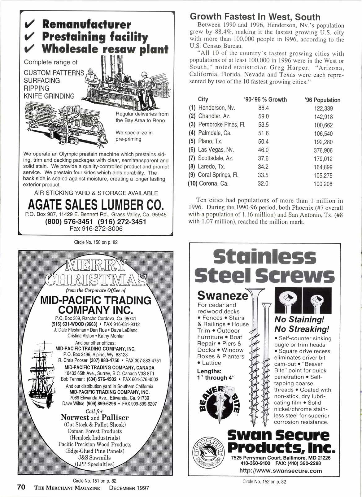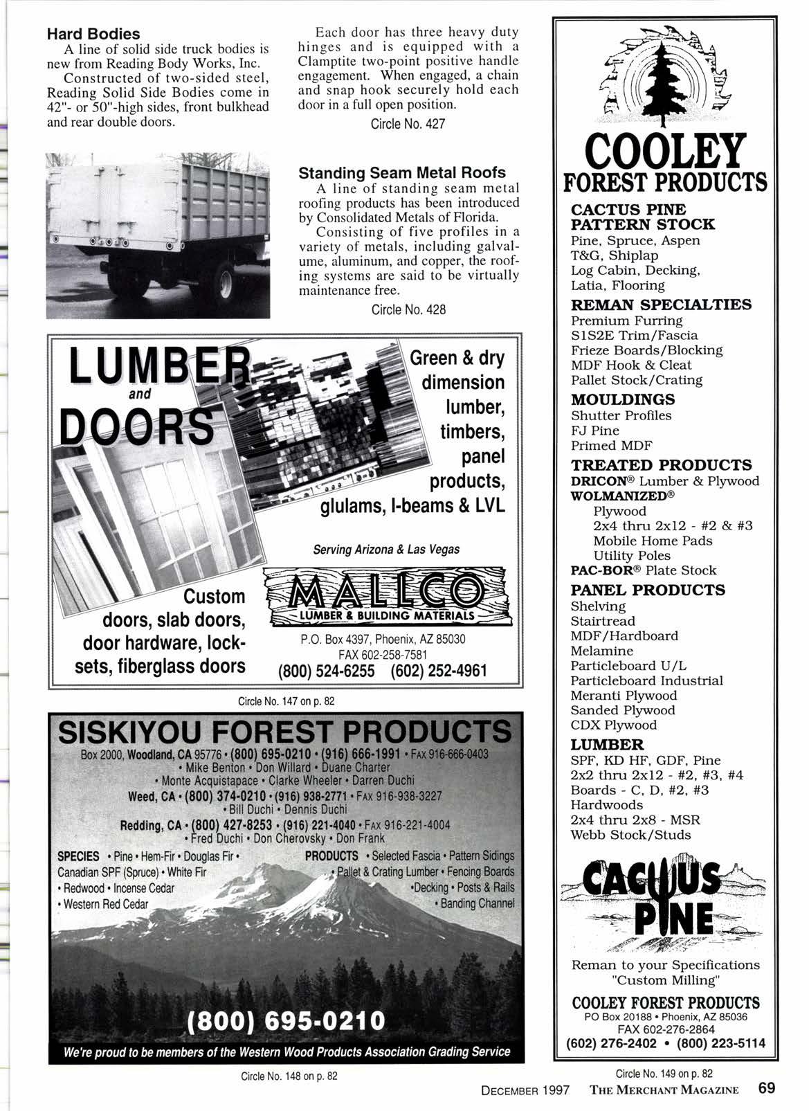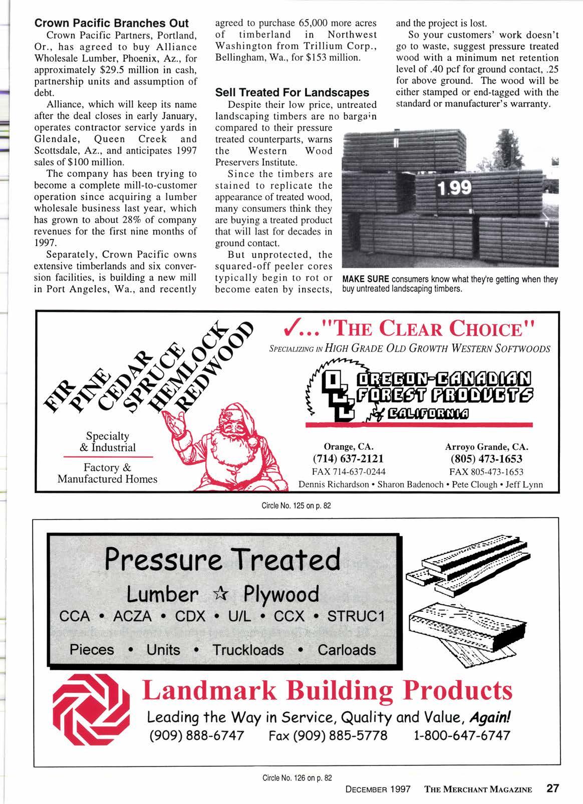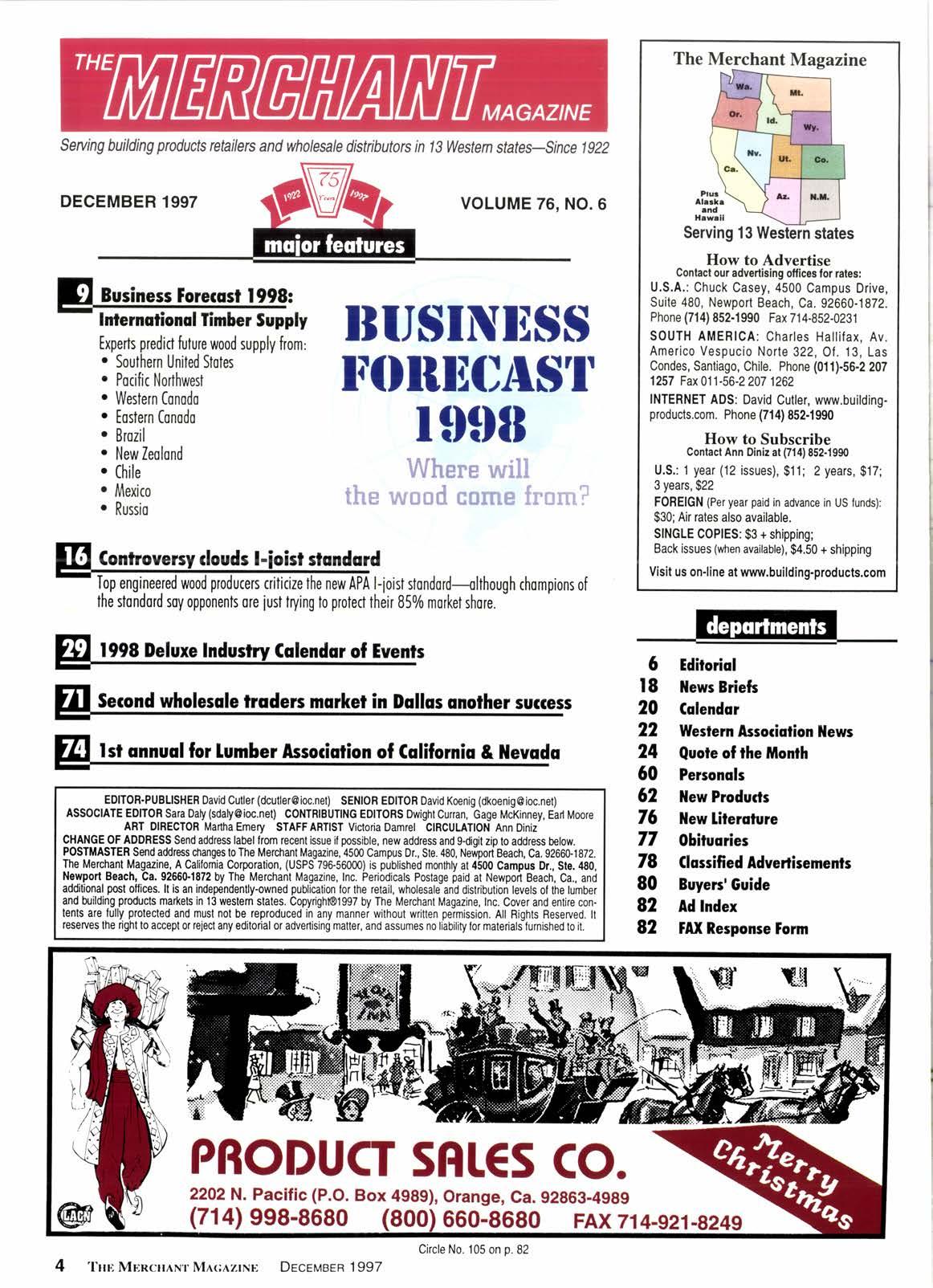 On our 75th anniversary, the staff of The Merchant Magazine extends to all our readers Best Wishes for a Happy Holiday and a Successful New Year, 3.C TRUCKINC First Class Lumber Haulerc (sez1 422-0426 FAX 562423.6283 RAII CAR UNTOADIIIG UNION PACIFIC 2380 E. Curry, Long Beach, Ca.90805 Ckcle No. 107 on p.82 6 Thr MnncHlnr Mlclzrxn DEcEMBER 1gg7