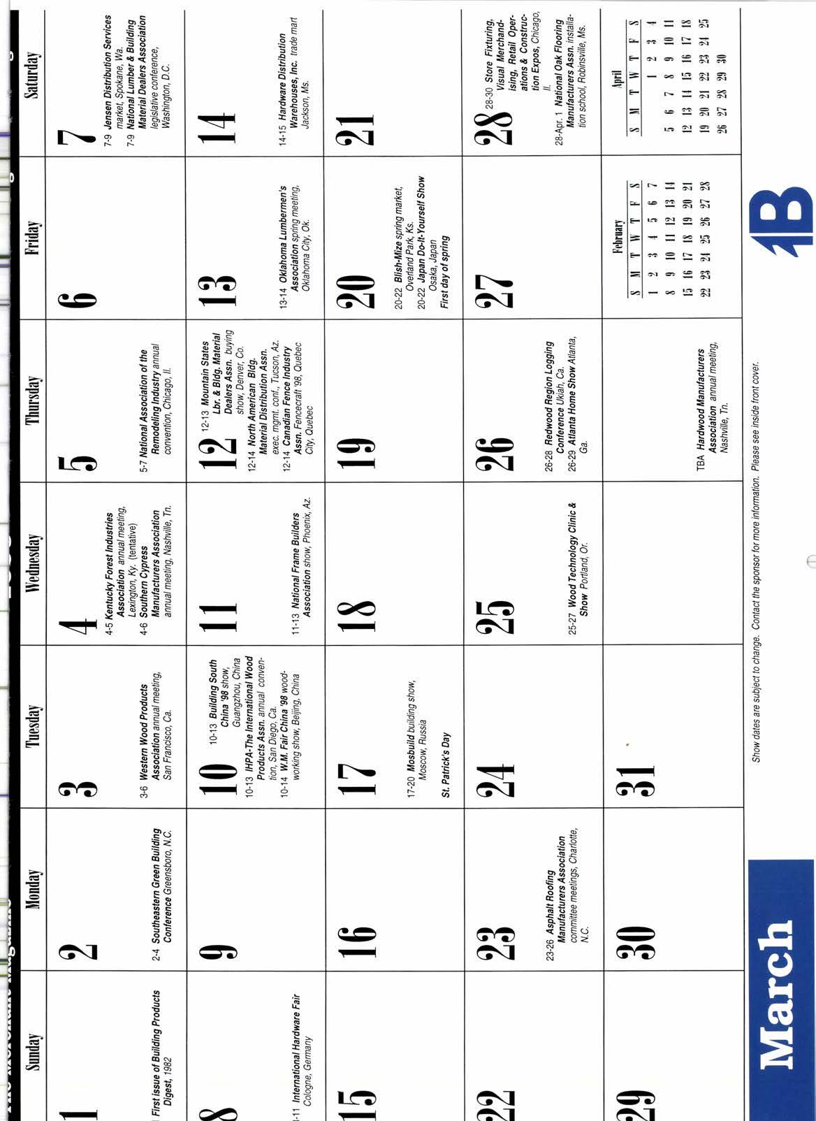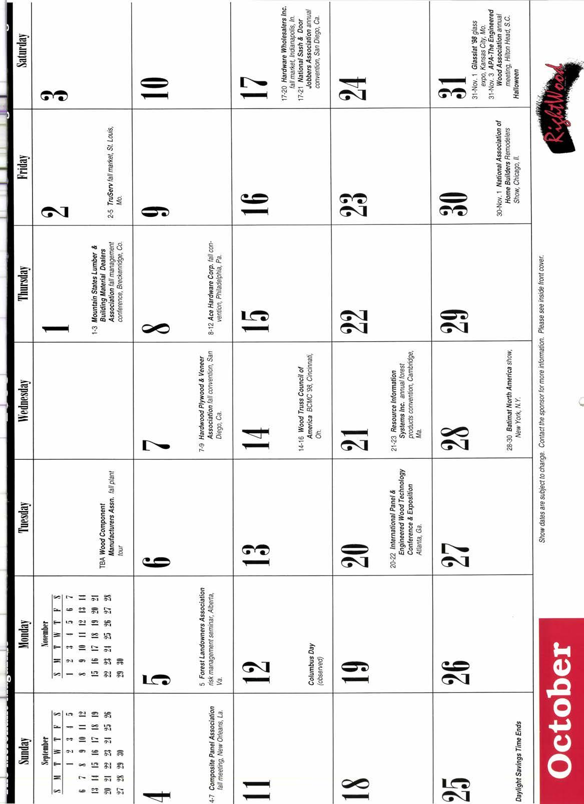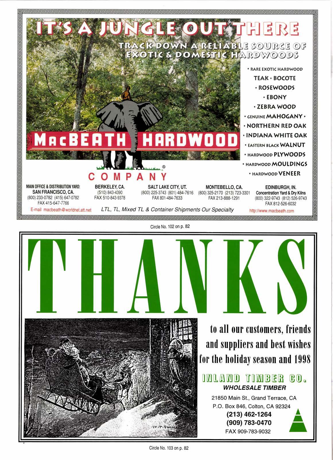 ilAlll 0FRCE & DFfRlEllll0t{ YAflD: SAN FRANCISCO. CA. (800) 233-0782 (41 5\ U7 -07 82 FAX 41 5-647-7766 COMP BERKELEY, CA. (51 0) 8434390 FM 510-843-9378 ANY SALT LAKE CITY, UT, (800) 225-3743 (801 ) 484.7616 FM 801-484-7633 HERE $@URCE @F RDW@@D9 ' RARE EXOTI( HARDWOOD TEAK'BOCOTE ROSEWOOD' EBONY 'ZEBRAWOOD ' cENUTNEMAHOGANY' 'NORTHERN RED OAK 'INDIANAWHITE OAK EAsTERN BTACKWAINUT ' HARDwooD PLYWOODj xrnowoopMOUtDlN6t r HARDWOODVENEER MONTEBELLO,CA, EDINBURGH,IN. (800) 325-21 70 (21 3) 723-3301 Concentation Yad & fty Kilns FM213-888-1291 (800)322-9743(812)526-9743 FM 812-526-6032 E.mail macbeath@worldnet.att.net LTL, TL, Mixed TL & Container Shipments Our Specialty htp://www.macbealh.com Circle No.102on P. 82 THAN to all our mstomer$, friends and $uppliers and best wishes for the holiday $ea$on and 1998 INLAIUE TIMtsER GO" WHOLESALE TIMBER 21850 Main St., Grand Terrace, CA P.O. Box 846, Colton, CA92324 (213) 462-1264 A (eog) 783-^'-^ r ,o^non-rrrllll I Circle No. 103 on p. 82