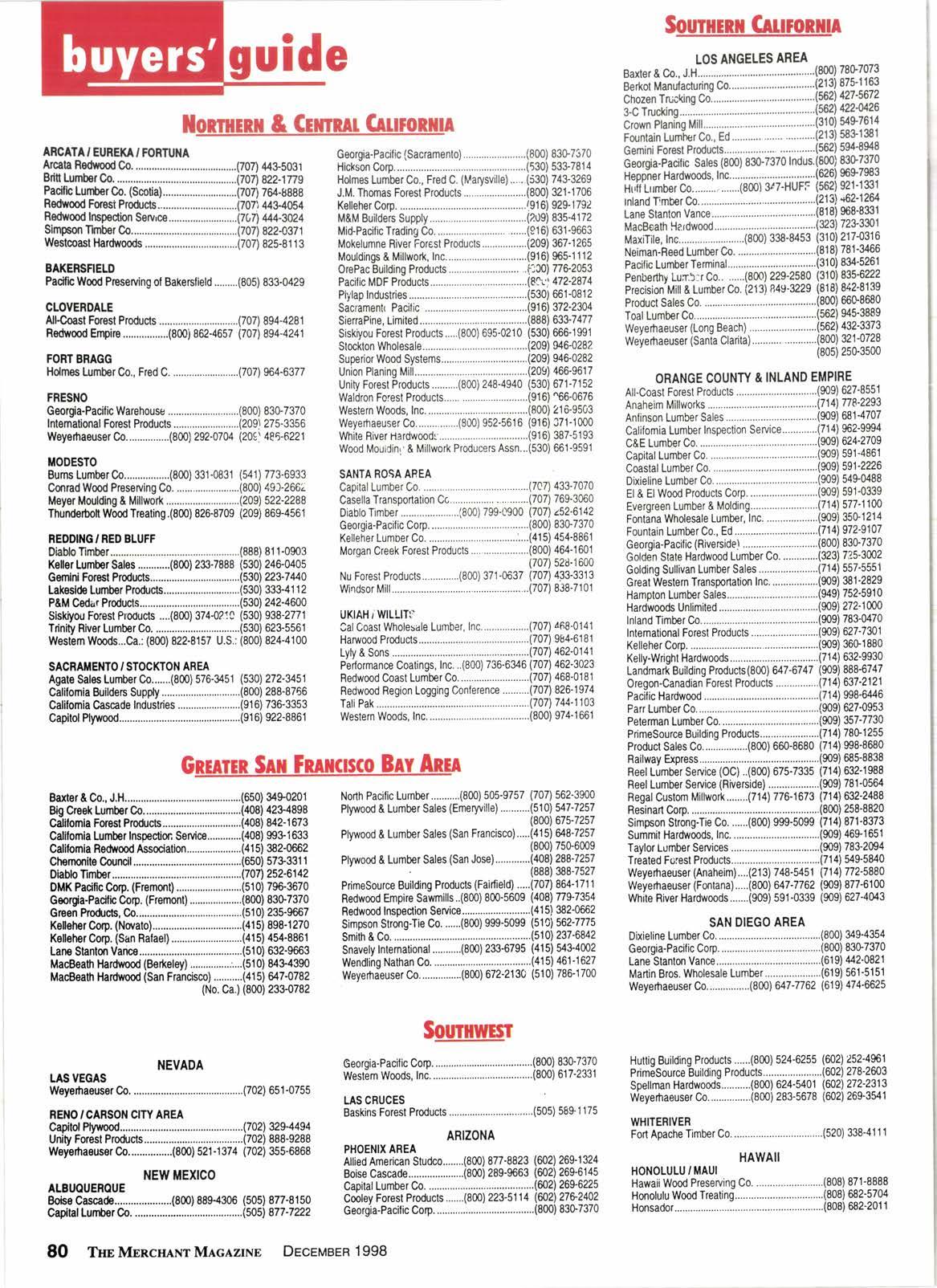 MONTANA BILLINGS Goorgia-Pacilic Corp ......(800) 83C7370 W6yerhaeuser (Butte) ....................................(888) 31 7.9730 COLORADO DEt{VER All{oast Fonst Prodrjcts....(800) 3ip-892 (303} 761-9882 Capital Lumberco.. ......(303) 28e3700 Geo@a-Paciflc Corp ......(800) 83G7370 PdmoSourcs Buildng Products......................(3011) 227.9000 TdmcoMillwo*....... ..,...(303) 371.8888 Weyefiaeusar Co................(800) 332-8291 (303) 43$8571 GRANDJUNCNON Tdmco Millwo*....... ......(970) 434-0800 UTAH SALT LAKE C]TY 8299131 821-8 t69 434-5450 n6-7n1 TIEDFORD/CRA}IIS PASS Allweahor Wood Trsaters..............................(800) 7595909 Lurnbor Produc|s.................(800) 753-3696 (541) 7&3696 Waldron Forost Products................................(541 ) 471 -8891 ]IORIH BEI{D Conrad Wood PcsaMn9...............................(541) 75&2595 874-2236 672-6528 45$4545 67S331 1 ALASKA ANCHORAGE Huttig Building Products.................................(907) 562-21 31 Goord&Padfic CoD...................................., Lumbol Prodrds.................(800) 926-8231 Whllo Wator Fo€d Prcdrrc6.1800) 31$1685 SPOTAilE Colvlllo lndan Pocblm Plno Co. (Omak) OREGON EUGEI{E ' SPRII{GFIELO ?27-1219 6534943 5516657 2+7317 8il0'7370 28$4393 261€m0 24&7305 nil-7571 297-76S1 4&7279 62G5847 6g2-33p2 692-5801 968.1300 445-9758 397,4469 n+3920 522-881 1 Lurber Products .................(800) 388-9393 MacBeah Hardwood.... Tdmc! Mlllwoft 48+2N7 zil-l311 763-8519 648-5065 262-4428 8307370 972.9393 48+7016 4f,7{on 295-9/99 972-5s25 Utah Wmd PreseNing.........(8m) 66e2467 Weyerhaeuser C0................(800) 283-9663 IDAHO BOISE COEUR D'ALEt'IE ldaho Cedar Sales (Troy)...............................(208) 835-2161 Weyefiaeuser C0.................(800) 221-3064 (208) 362-5261 miteman Lumber Co. .................................,.(208) 682-4602 l I Cleadield Conveyors ...........(800) 453.2416 Diablo Timber.......... Dimensions, Inc....... Forest Products Sa|ss.........(800) 666-2467 Stimson Lurnber Co..............:.................. United Padfic Forest Products..............,. Wostgm Wood Produc{s Association...... SomcaSawnlllCo. THANKS to all our cu$tomor$, frienils and $uppliers and best wishes for the holiday $ea$on and 1999 INLANE TIMtsER GO" WHOLESALE TIMBEB 21850 Main St., Grand Terrace, CA P.O. Box 846, Colton, C492324 (21s1462-1264 A (909) 783-C'-- r ,o*non-rr.-lll] I Orcle 1.,1o. 154 onp.82 DeceMaen 1998 Tlml\[nnonmM,tclzrxt 81