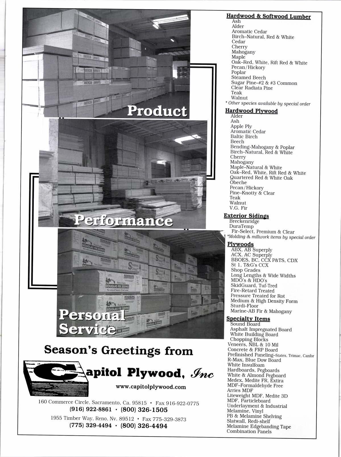 Season's Greetings from pirol Plywood, 9no www. capitolplywood. com 160 Commerce Circle, Sacramento, Ca. 9Egl5 Fax 916-922-OTZ| (er6) e22_886r . (8OO) 326-1505 1955 Timber Way, Reno, Nv. 89512 , Fax775_329-8873 (775) 32s-44e4 . (800) 326-4494