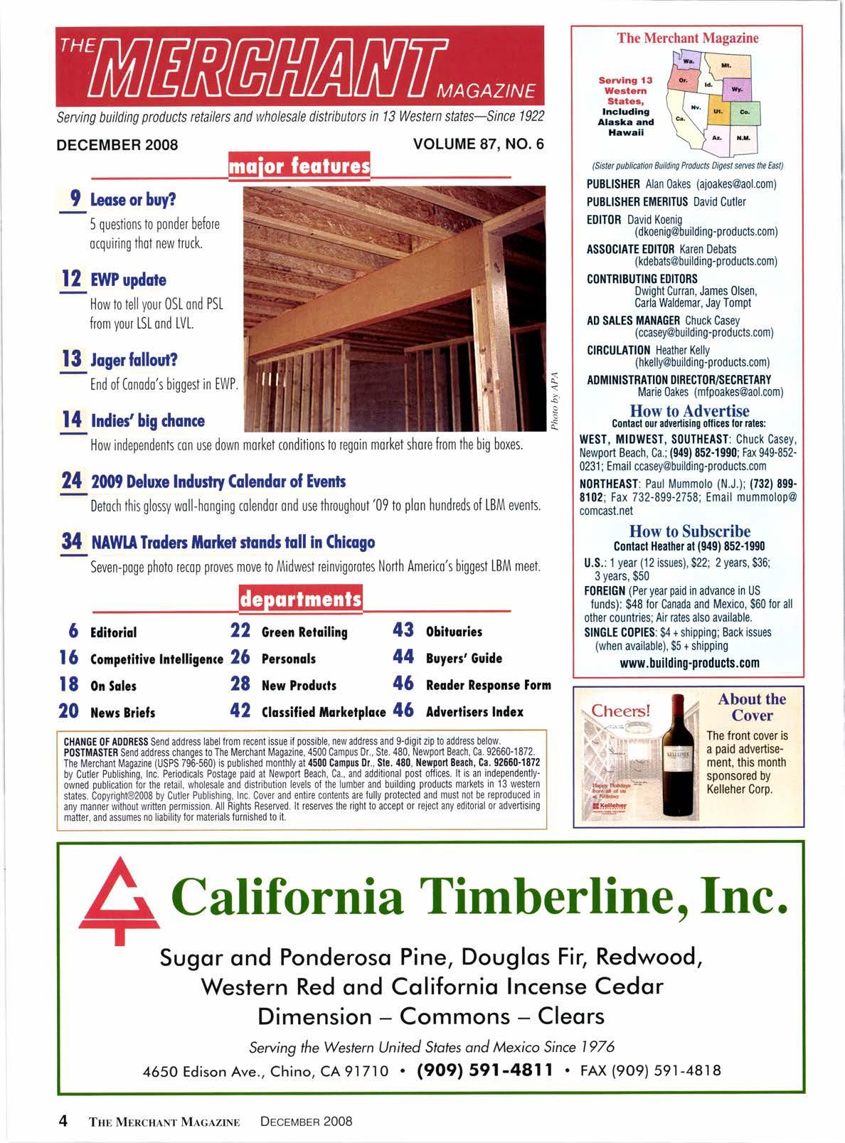 Ileose or buy? 5 questions to ponder before ocquiring thot new truck. 12 twPupdote How to tell your OSL ond PSL from vour LSL ond LVL. 13 Jogerfollout? End ofConodo's biggest in EWP. l{ tndleg big rhonce How independents c0n use down morket conditions to regoin morket shore from the big boxes. 2fi19 Deluxe lndufi Colendor of Evenb Detoch this glosy woll-honging colendor ond use throughout'09 to plon hundreds of LBM events. NAW1A Truder filo*et glonds toll In Chlogo Seven-poge photo recop proves move to Midwe$ reinvigoroles North Americo's bigge$ LBM meet. 24 34 5 Ediroriol | 5 Conpetitiuc tnlelligenrc | 8 on sol.t 20 ilews Briels Green RcloilinS 43 Personclc 44 lfew Produrtr 46 Ghssificd ilorketplore {6 0bituories Buycrs'Guide Reodcr Rc;ponse torn Adverlicers lndex About the ,Cover The lront cover is a paid advenisement, this monlh sponsored by Kelleher Corp, 22 25 28 42 CHAI{GE 0F A0DRESS Send address label trom recent issue if possible, new addfess and 9-digit zip to address below. P0STiIASTER Send address changes to The Merchant Magazine, 4500 Campus Dr., Ste. 480, Newport Beach, Ca. 92660-1872. The Merchant Magazine (USPS 796-560) is published monthly at {500 Campus Dr., Sle. 480,l{ewp0il Boach, Ca. 92660-1872 by Cutler Publishing, Inc. Periodicals Postage paid at Newport Beach, Ca., and additional post offices. lt is an independentlyowned publication lorthe retail, wholesale and distribution levels of the lumber and buildingproducts markets in 13 western states. Copyright@2008 by Cutler Publishing, Inc. Cover and entire contents are fully protected and must not be reproduced in any mannei without written permission. All Rights Reserved. lt reserves the right to accept or reject any editorial or advertising matter, and assumes n0 liability for materials furnished t0 it. NO.6 A California Timberline, Inc. Sugor ond Ponderoso Pine, Douglos Fir, Redwood, Western Red ond Colifornio Incense Cedor Dimension - Commons - Cleors Serving the Western lJnited Sfofes ond Mexico Since 1976 4650 Edison Ave., Chino, cA 91 71o . (909) 591 -481 I. FAX (9o9) 591-4818 4 Tnn MpncnaNr MncAzrNn Decgrvrarn 2008