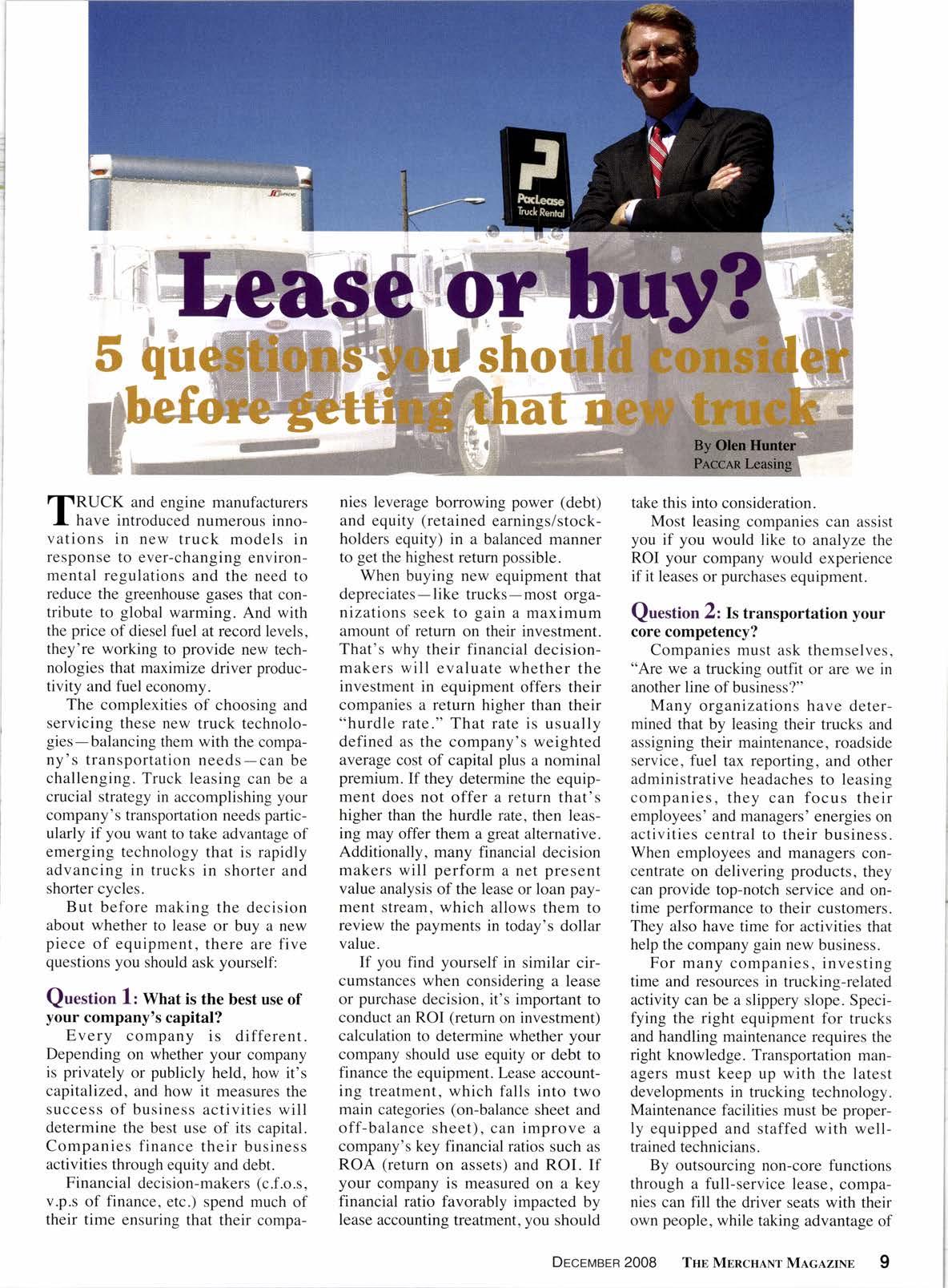The complexities of choosing and servicing these new truck technologies-balancing them with the company's transportation needs-can be challenging. Truck leasing can be a crucial strategy in accomplishing your company's transportation needs particularly if you want to take advantage of emerging technology that is rapidly advancing in trucks in shorter and shorter cycles.