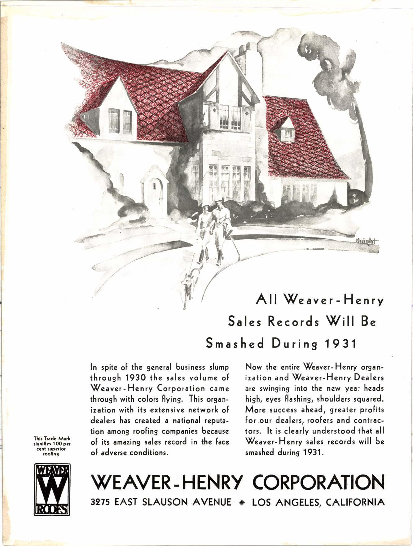 Now the enlire Weaver-Henry organization andWeaver-H enty Dealers are swinging into the new yea; heads high, eycs flashing, shouldcrs squared. More success ahead, greater profits for.our dealers, roofers and contractors. lt is clearly understood that all \(/eaver-Henry sales records will be smashed during 1931.