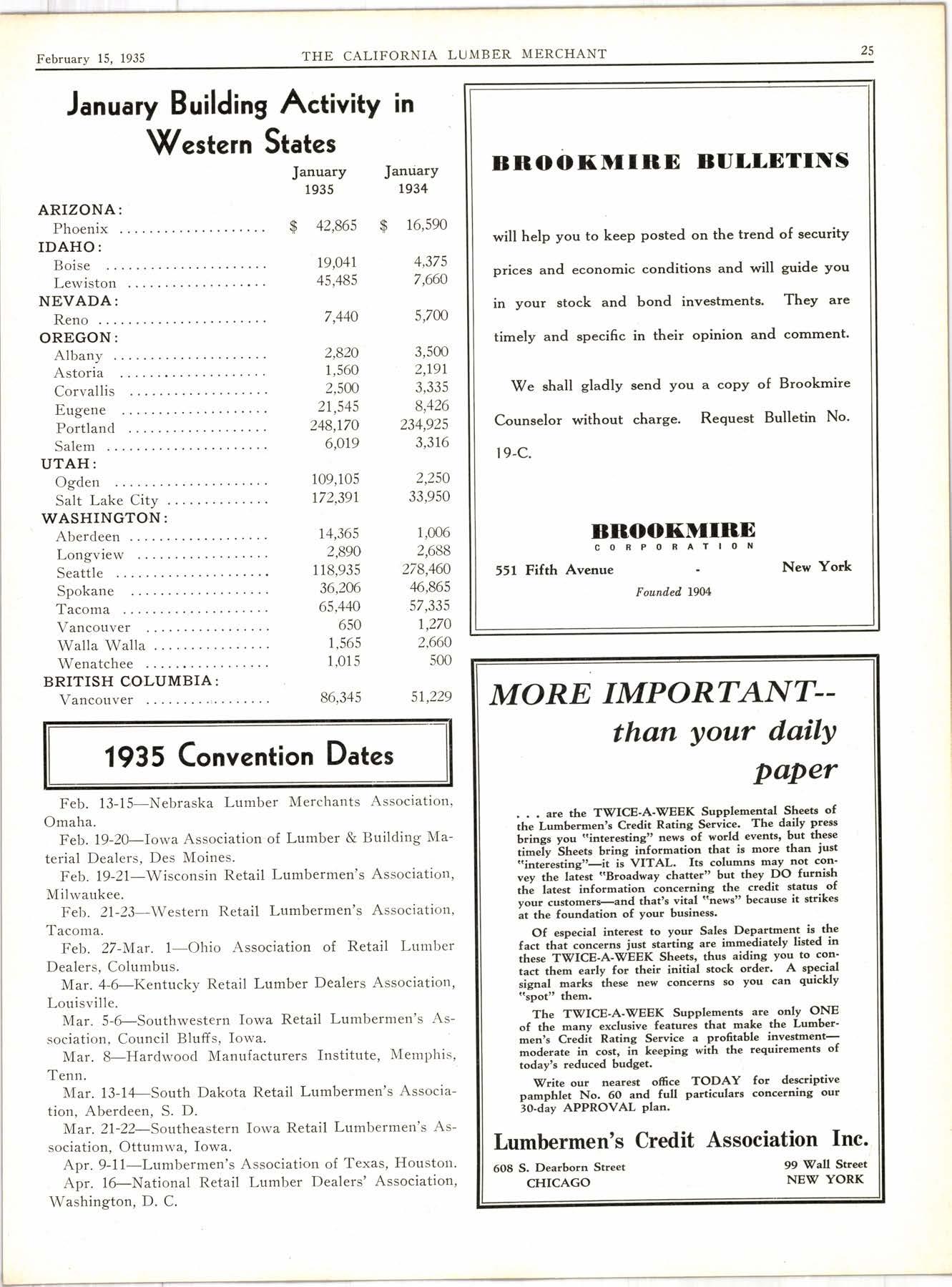 And fond hopes for 1935 are also being sounded from all the convention halls. Everyone tells of the great NEED for new buildings and for building improvements in HIS territory; and with the prospect of ready cash and credit with which to finance these needs, most dealers can see a' business swing upward that may reach his yard any day' and continue indefinitelY.
