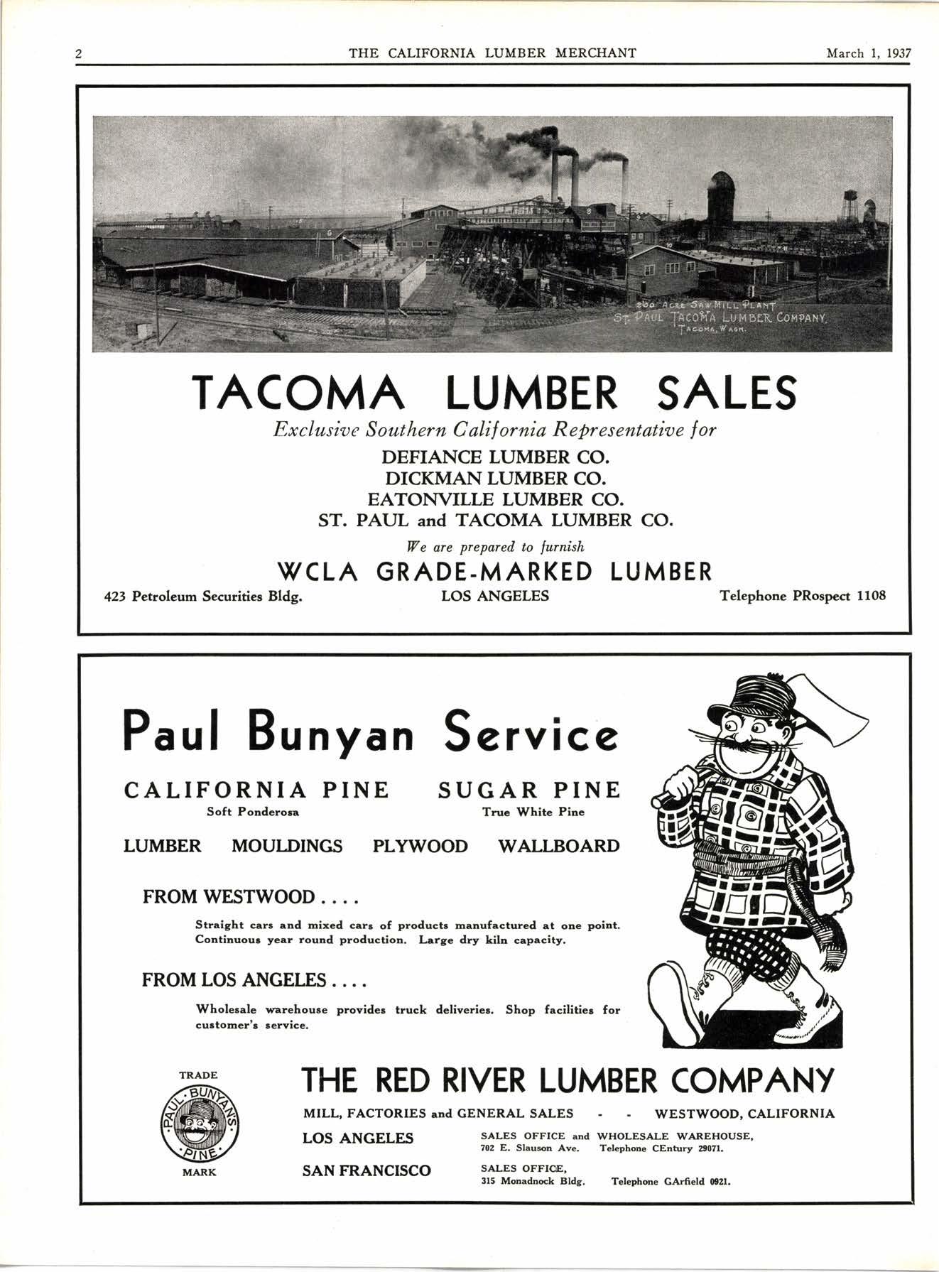 THE CALIFORNIA LUMBER MERCHANT March l. 1937 TACOMA LUMBER SALES Exclusiae Southern Calilornia Reilresentatioe f or DEFIANCE LUMBER CO. DICKMAN LUMBER CO. EATOT{VILLE LUMBER CO. ST. PAUL and TACOMA LUMBER CO. We are prepareil to furnish \TCLA GRADE.MARKED LUMBER 423 Pettoleum Securities Bldg. LOS ANGELES Telephone PRospect 1108 Paul Bunyan Service CALIFORNIA PINE SUGAR PINE Soft Pondcron Tnrc Whitc Pinc LUMBER MOULDINGS PLYWOOD WALLBOARD FROMWESTWOOD.... Straight crrr and ni:cd cerr of productr manufactured at one point. Continuout ycar round production. Lergc dry kiln capacity. FROM LOS ANGEIJ,S. .. Wholesalc *erehoure providcr truck dclivcricr. Shop facilitier for cuttomcrtr rervice. TRADE 6ffi \Mry,/ \ otrtts , MARK THE RED RIVER LUMBER COMPANY MILL, FACTORIES and GENERAL SALES WESTWOOD, CALTFORNIA LOS ANGELES SAN FRANCISCO SALES OFFICE and WHOLESALE WAREHOUSE, 702 E. Slauon Ave. Tclephoc CEnttrry 2904. SALES OFFTCE, 315 Moadnck Bldg. Tclephone GArftGld DZf.