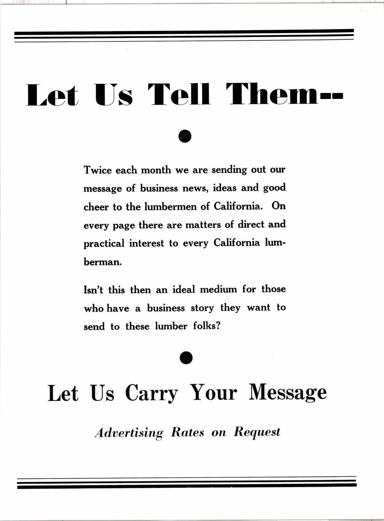 Twice each month we are sending out our message of business news, ideas and good cheer to the lumbermen of California. On every page there are matters of direct and practical interest to every California lum' berman.