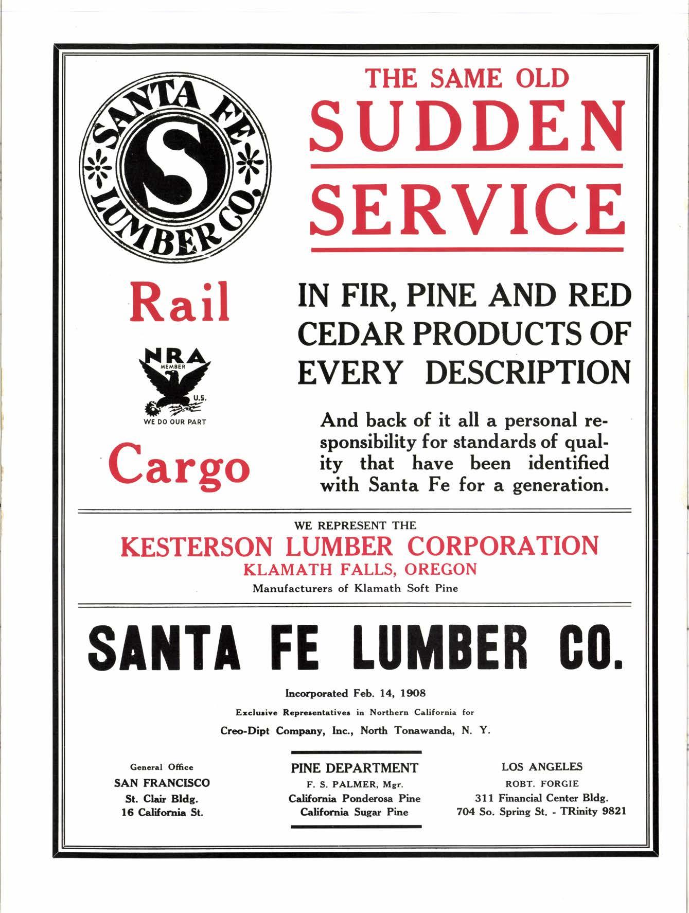 WE DO OUR PART WE REPRESENT THE KESTERSON LUMBER CORPORATION KLAMATH FALLS, OREGON Manufacturers of Klamath Soft Pine PINE DEPARTMENT F. S. PALMER, Mgr. California Ponderora Pine C.alifornia Swar Pine LOS ANGELES ROBT. FORGIE 3ll Financial Center Bldg. 7O4 So. Sp"ing St. - TRinity 9821 SA]ITA FE LUMBER Gt|. Incoraorated Feb. 14, l9O8 Erclurivc Rcprcrcntativcr in Northem California for Crco-Dipt Company, lnc", North Tonawanda, N. Y. Gcncral Office SAN FRANCISCO St. Clair Bldg. 16 C-alifornh St.