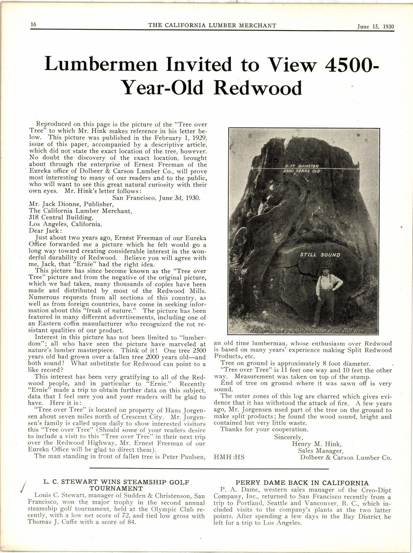 Reproduced on this page is the picture of the "Tree over Tree" to whi'ch Mr. Hink inakes reference in his letter be- low. This picture was published in the February I, 1929, issue of this paper, accorrpanied by a,descriptive article, which did not state the exact location of the tree, however. No doubt the discovery of the exact location, brought about through thb enterprise of Ernest Freeman of ihe ' Eureka office of Dolbeer & Carson Lumber Co., will prove most interesting to many of our readers and to the public, who will want to see this g'reat natural curiosity with their own eyes. Mr. Hink's letter follows: