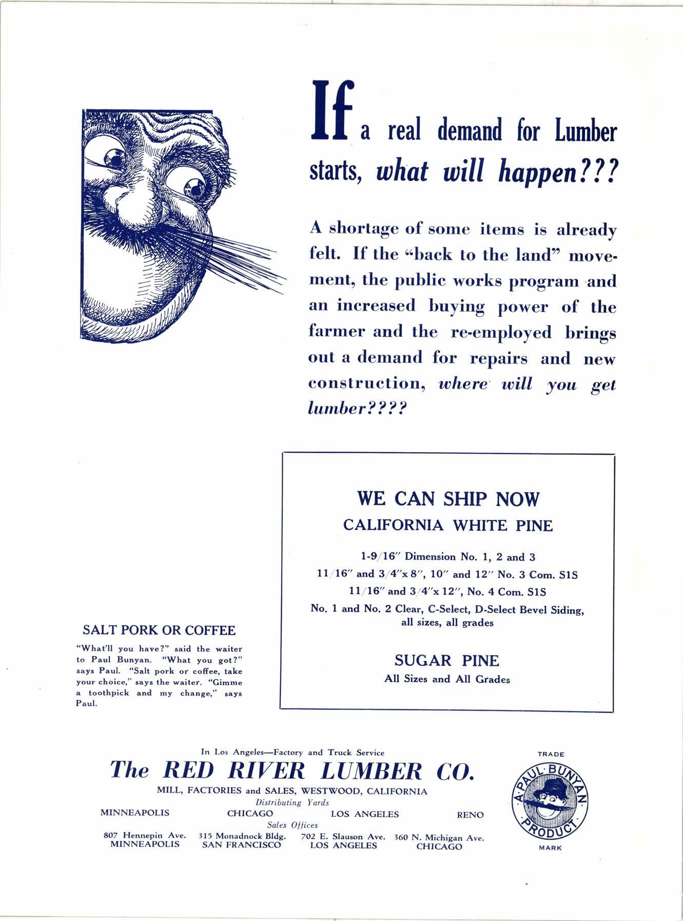 The REI) MINNEAPOLIS 8O7 Hennepin Ave. MTNNEAPOLIS LT]MBER CO. MILL, FACTORIES and SALES, WESTVOOD, CALIFORNIA Distributing Yard,s CHICAGO LOS ANGELES RENO Sales Oljices lll -l!o1ad19:t_n!4g. 7o2 E. Slauson Ave. i60 N. Michigan Ave. sAN FRANcrsco Los ANGELES cHrc.aGo Los Angeles-Factory RIVER