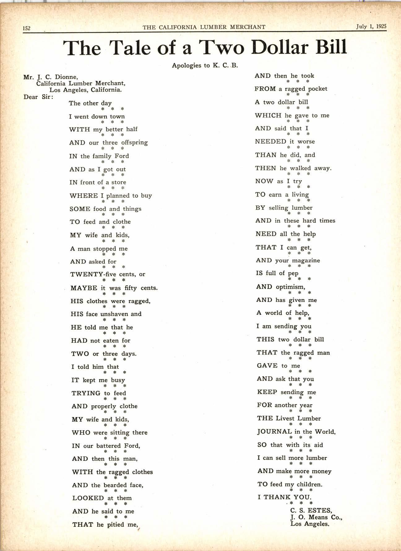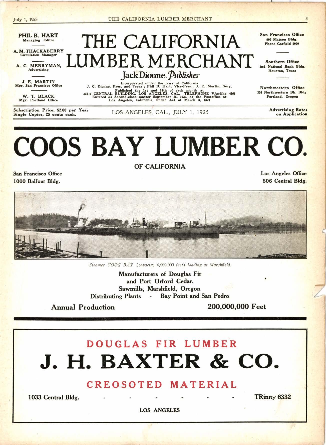 July 1, 1925 THE CALIFORNIA LUMBER MERCHAN? THE CALIFOR}-IIA A. M. THACK.A,BERRY ";:H;;, LUMBE R ME RCHANT .,'iri3"1r"t"ri",., Advcrtirlng /t: Horton, Tcxar r.E.MARrrN J.::"*"k**kk Mrr. su Fructaco ofnce J. c. Diouc, ";."";:l5t;11,."X"1m-i::;:;*:;.1-."8. Mar'n, scv. Northw*tcrnpf*: w. r. BLACK 3.s'ecENrRAL,i"!!lP-:'Hl*:.*{!"",::f:,entr,'-,#ldlr."U3..L*""1i * * ";::X".:?.?;''o"' Mfr. Portl.nd Offic. Lor Angeler, Cdiforrie, undcr Act of March 3, lt79 PHTL B. HART Murfin|| Edltor San Francirco Ofice 91f, Matron Bldg. Phona Crerfiold 500e Subrcription Price, f2.00 pcr Year Singlc Copicrr 25 ccmtr crchr LOS ANGELES, CAL., JULY 1, 1925 Advcrtiring Ratcr oa Applicatic COOS BAY LUMBER CO. OF CALIFORNIA San Francirco Office 100O Balfour Bldg. Manufacturers of Douglas Fir and Port Orford Cedar. Sawmills, Marshfiel4 Oregon Distributing Plants - B"y Point and San Pedro Annual Production 200'000'000 Feet Los Angeler Office 806 Centrd Bldg. Stearner