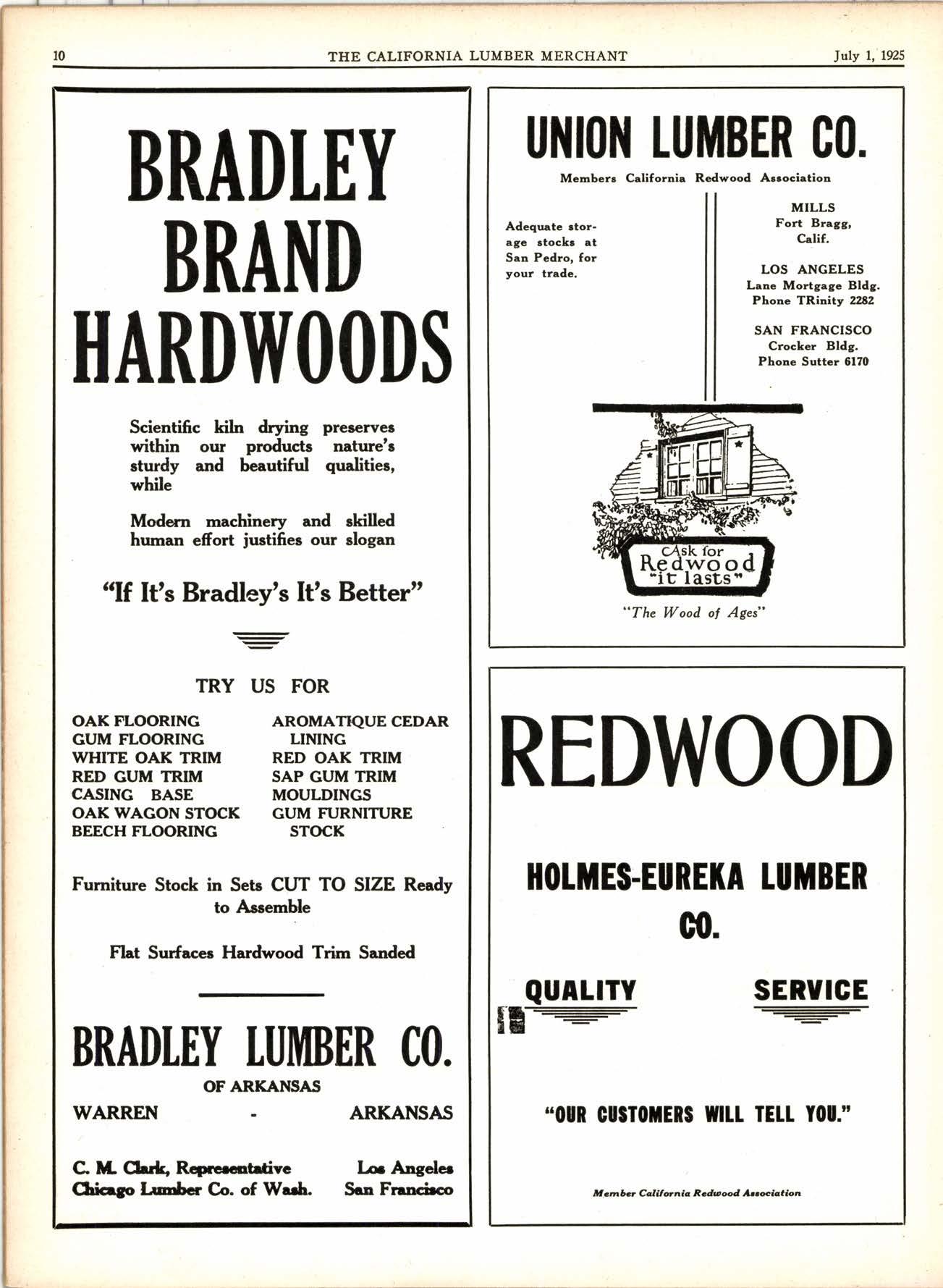 BRADTEY TUMBER C(). WARREN OF ARKAI{SAS ARKANSAS C M. Out, RQrcctdvc La AngCc. Cficr3o Ldcr Co. of Wr.L Srn Frurdro t|l{t0tt IUMBER c0. Mcmbcrc Celifornia Rcdwood Arociation Adcqrntc rtoragc rtockr et Sen Pcdro, for your tradc. MILLS Fort Bragg, cdif. LOS ANGELES Lenc Mortgagc Bldg. Phone TRiairy 21182 SA,N FRANCTSCO Croclccr Bldg. Phonc Suttcr 6170