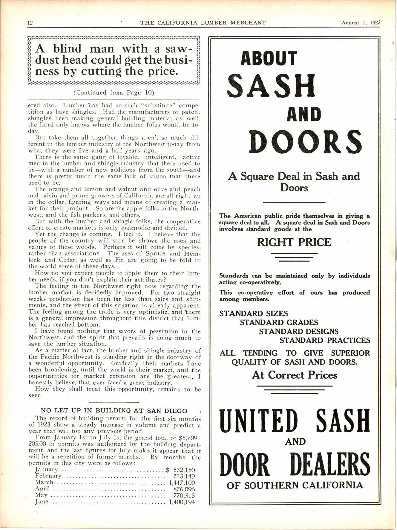 While it ir a fect that sdec have been eluggish for the p'aet two weekr, and that prices have been rather rmcertain, a rtudy of various other conditions might tend to Put a different light on the future prorpects, for the wholemle markeL It is the opinion of practically everyone that the bottom on 6r pricec has becsr reached, and that the reaction will rtart, not in the Fall, but within a very few dayr. Dealers have not been buying, at least not as freely as is ordinary when the building has been what California has reen in the l,aet rixty daye. Small cargoee of a few can, heve beerr rold in lome c,a!e! at pricec that would reem ridiculous compared' to t'he pricer arked just three weeks ago. Wholesalcre admit smlll lst"o on tome rales made in tte pest few dayr, thir on tfie erna[er rhipmentr, how' ever. Large cargoer, erpecially when well a.esorted, do not reern to go begging very long. The dockr at San Pedro are crowded, and wharfage is mighty tcarce. The car rituation rGernr much bctter, and ahould tf,ire be a let up in rhipping for e few dayr, ttir port could be cleaned up of moet of the mrer rtockr, leaving the way clear for future rhipmentr. In our opinion the meat of thc ritrntion lier in the fact that buildins HAS NOT LET UP. In Lor Angeler up to the night of July 27th, over forty-two hundred building permitr had bccn authorized, there to a total v'aluation of $13'718rtO2.0O. It ir rafe to ny that by thc end of the month thcee figurer will be brought over the total for Jrure which wa! a little ovcr $l5rdDrOOO.OO. In rix monthr, Lor Angeler her taken permitr aggregating a monttly ayerage of $15r6(X),O,0O.(X), and when the urual rloweet month of the year, July, rhowr e total up to the hdf year'r ayerage, it doer not indicate a rlowing up. It ir not pooible to obtain building figurer for San Francirco rmtil the end of the month. In Jrurc the perrnitr reached well over $4'(XX)'OOO.OO, and indicationr are that July will not be below thir figure.. T'he atire Bay dirtrict ie buey and feeling highly optomirtic.