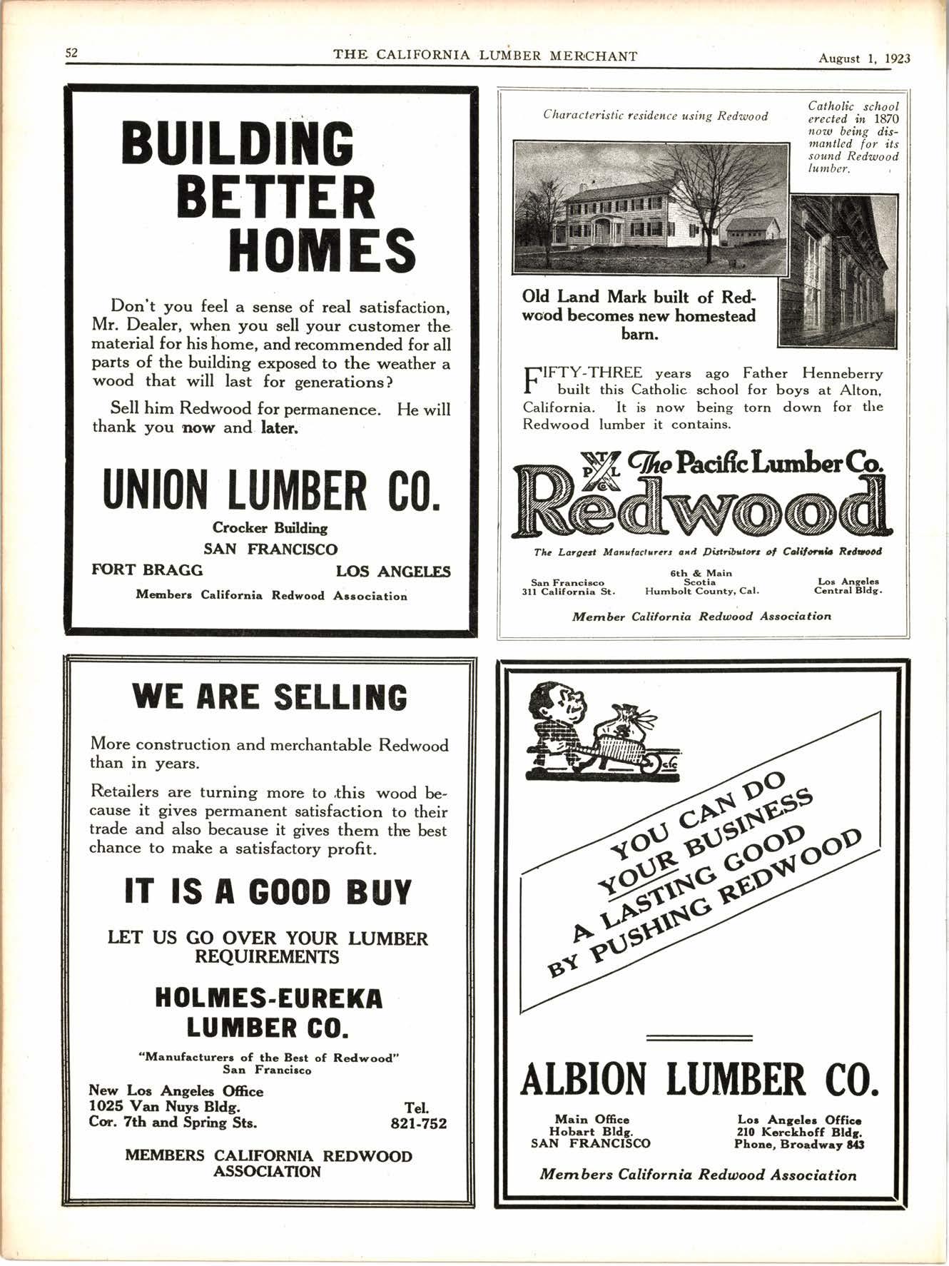 The redwood mills have held their cut to practically the same figures a5 on the laet report, however, they show rales romewhat under. Orderr received for tte two weekr' total, 6134OrOOO feet, and' their production reached l0r596rO0O feet. To the 21rt of July thece millr bave eold @Vo of theh normd production, ar compared with 637o rold in June. California taker the lergelt rhare of the rcdwood cut, a5 s3r'41, of the above raleq thie rtate reccivcr over 5,0(X),O(X) feet.