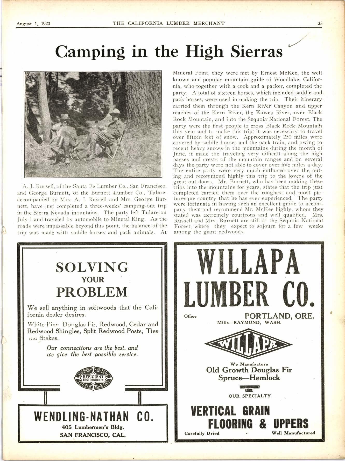 ,,4,. J. Russell, of the Santa Fe Lumber Co., San Francisco, is attending the ten days Bohemian Club Encampment at the Bohemian Club Grove among the. Redwoods. The play, which was written by Mr. Redding, will be staged on August 5. Mr. Russell is accompanied, by Preston W. Smith, his old boyhood chum of Portland, Oregon. Mr. Smith is secretary of the Kern-Gifford Co., of Portland, who are big dealers of grain and wheat in the northwest.
