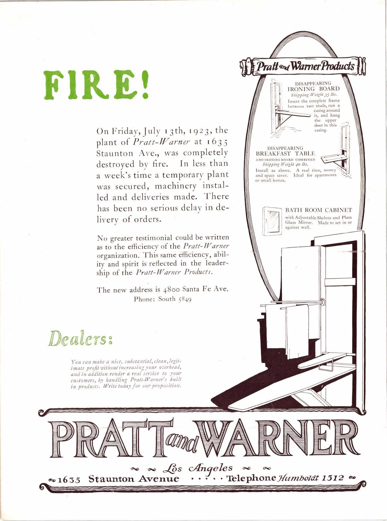 On FridayrJuly r3th, rg23, the plant of Pratt-Warner at t635 Staunton Ave., wascompletely destroyed by fire. In less than a week's time a temporarY Plant was secured, machinery installed and deliveries made. There has been no serious delay in delivery of orders.