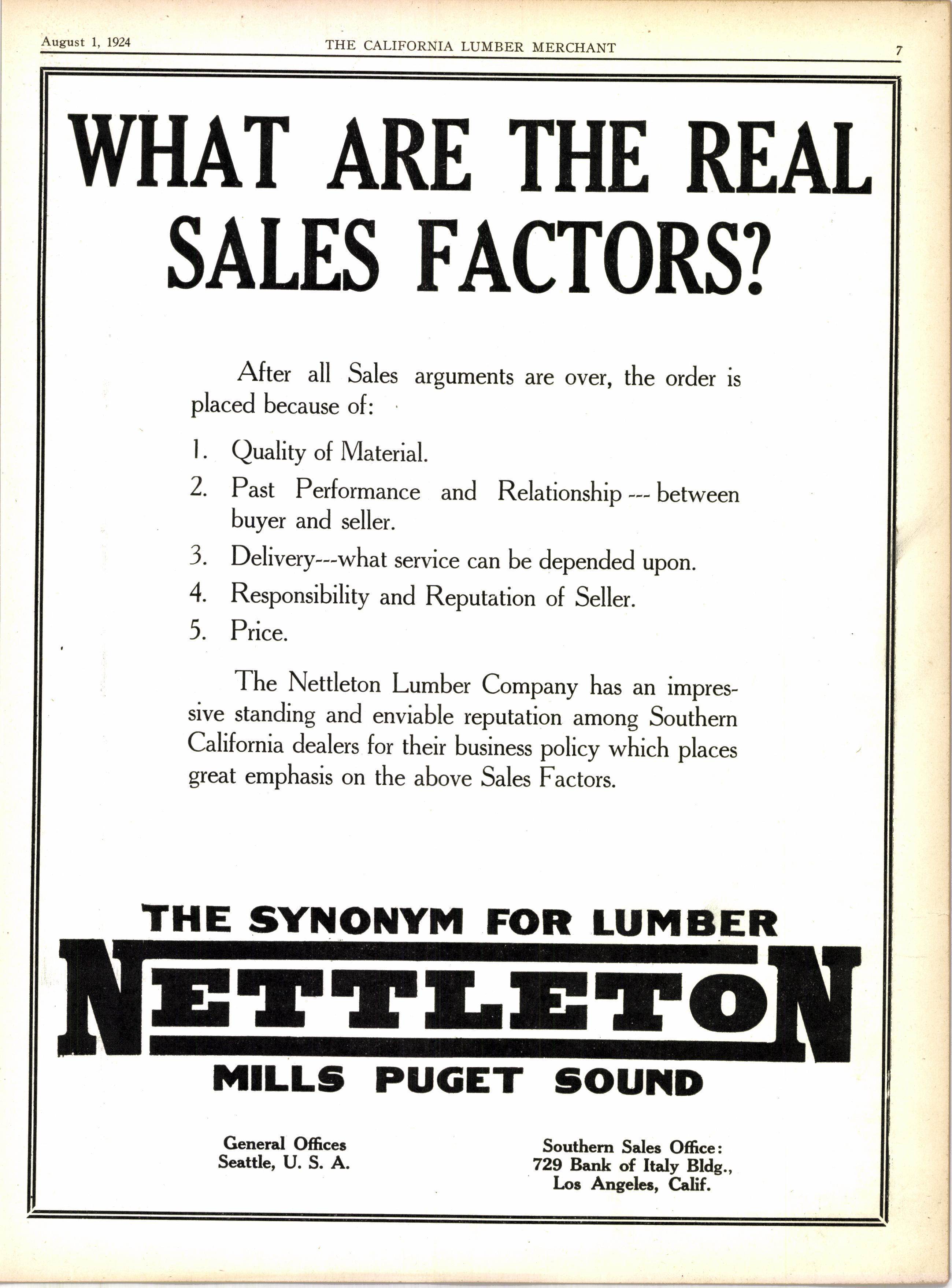 The Nettleton Lumber Company has an impressive standing and enviable reputation among Southern California dealers for their business policy which places great emphasis on the above Sales Factors.