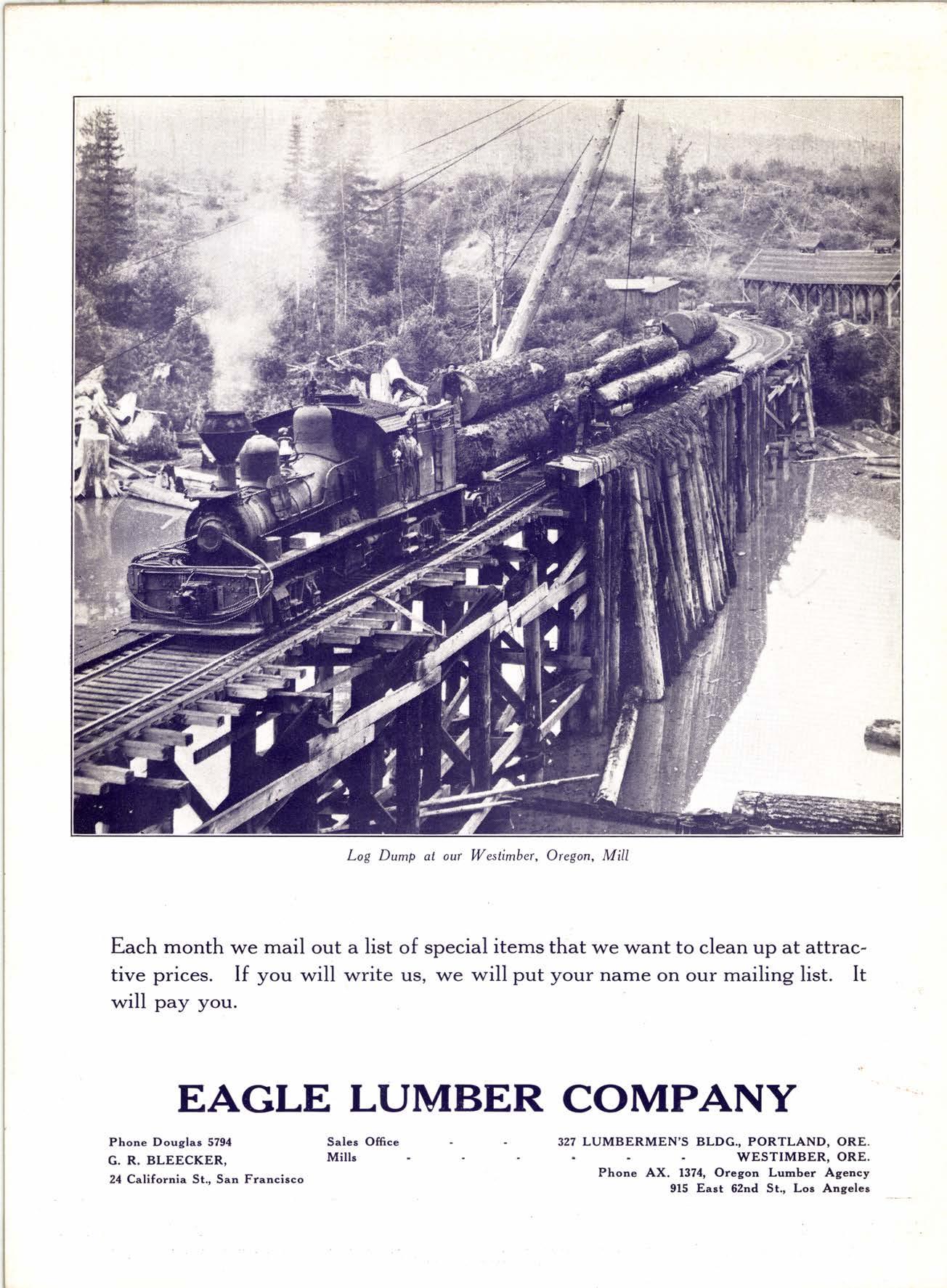 Log Dump at our Westimber, Oregon, MiII Each month we mail out a list of special items that we want to clean up at attractive prices. If you will write us, we will put your name on our mailing list. It will pay you. EAGLE LUMBER COMPANY Phone Douglas 579{ Sales Office c. R. BLEECKER, Mills 24 California St., San Francisco 327 LUMBERMEN'S BLDG., PORTLAND, ORE. . WESTIMBER, ORE. Phone AX. 1374, Oregon Lurnber Agency 915 Eart 62nd St., Lor Angelce