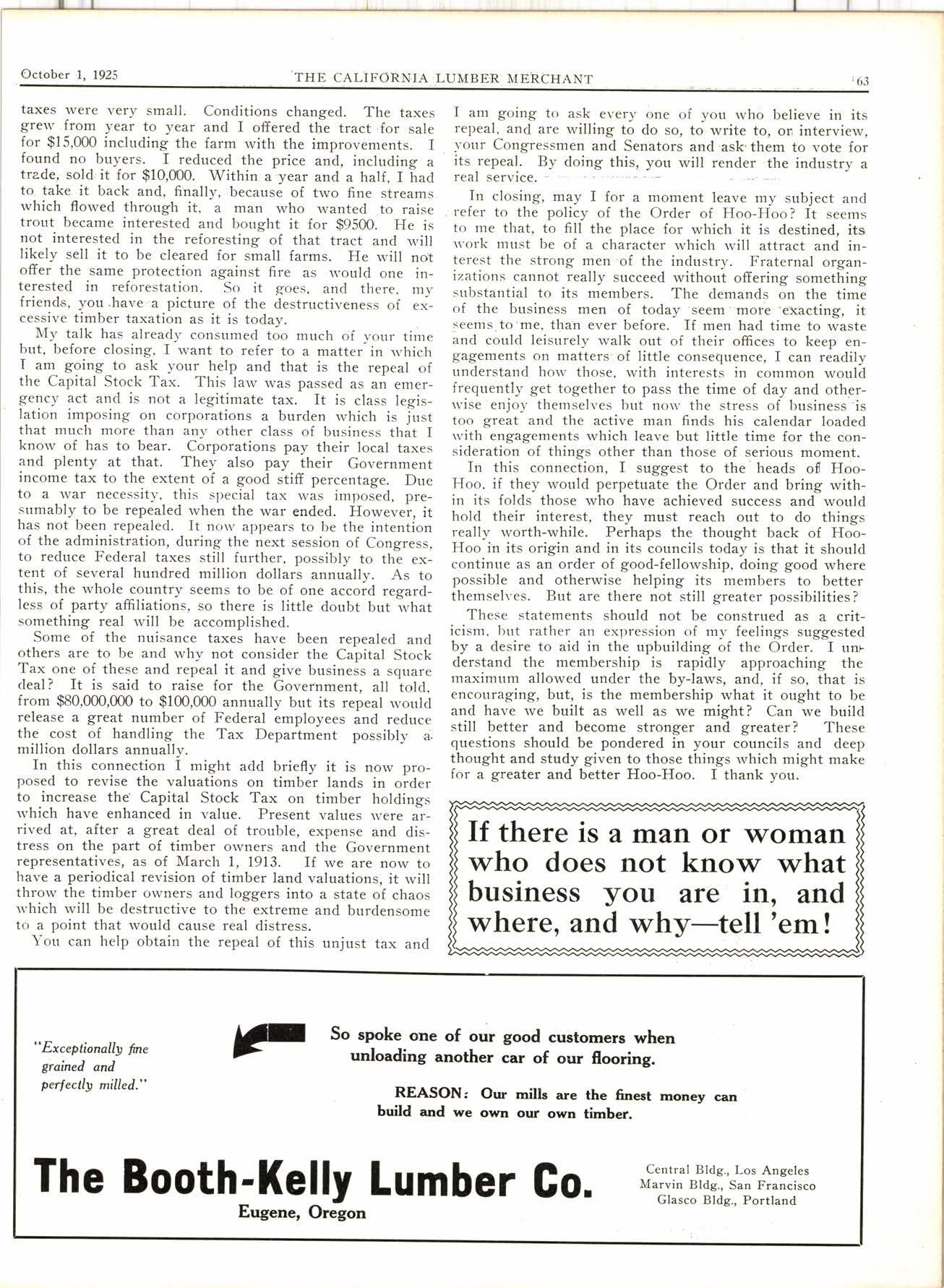 Mytalk has already consumed too much of your time but, before closing, I want.to refer to a matter in r,vhich I am going to ask your help and that is the repeal of the Capital Stock Tax. This law was passed as a; emergency act and isnota legitimate tax. It is class legis- lation imposing on corporations a burden which is just that mucl'r more than any other class of business that I know of has to bear. Corporations pay their local taxes and plenty at that. They also pay their Government income tax to the extent of a good stifi percentage. Due to a _war necessity, this special tax was imposed, presumably to be repealed when the war ended. However. it has not been repealed. It norv appears to be the intention of the administration, during the next session of Congress, to reduce Federal taxes still further, possibly to the extent of several hundred million dollars gnnually. As to this, the whole country seems to be of one accord regardless of party affiliations, so there is little doubt but what something real will be accomplished.