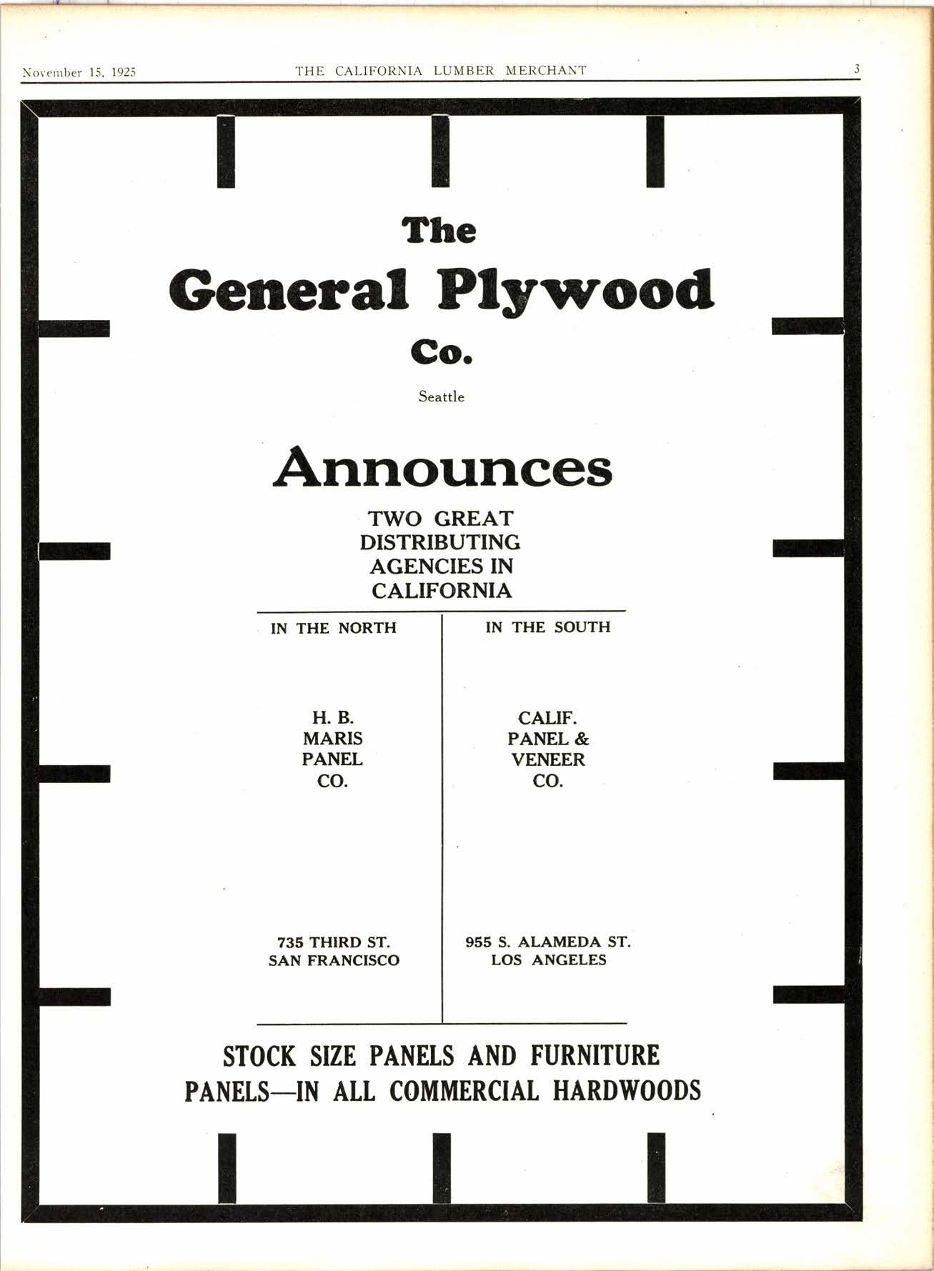 Seattle ^A,nnounces TWO GREAT DISTRIBUTING AGENCIES IN CALIFORNIA IN THE NORTH H. B. MARIS PANEL co. CALIF. PANEL & VENEER co. 735 THIRD ST. SAN FRANCISCO 955 S. ALAMEDA ST. LOS ANGELES STOCK SIZE PANELS AND FURNITURE PANELS-IN ALL COMMERCIAT HARDWOODS