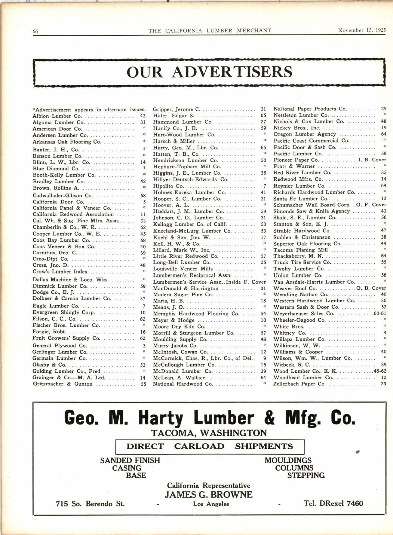 Golding Lumber Co., Fred Grainger & Co.-M. A. Ltd. Gritzmacher & Gunton Gripper,JeromeC..... 3l Hafer, Edgar S.'.... 65 Hammond Lumber Co. 27 Hanify Co., J. R. 59 Hart-Wood Lumber Co. t( Harsch & Miller Harty, Geo. M., Lbr. Co. ... 66 Hatten, T. B., Co. * Hendrickson Lumber Co. 50 Hepburn-Topham Mill Co. * Higgins, J. E., Lumber Co. 38 Hillyer-Deutsch-Edwards Co. * HipolitoCo.... 7 Holmes-Eureka Lumber Co. 4l Hooper, S, C,, Lwnber Co. 31 Hoover, A. L, * Huddart, J. M,, Lumber Co. . 59 Johnson, C. D., Lumber Co. . 31 Kellogg Lumber Co. of Calif. 53 Knecland-Mclurg Lumber Co. 53 Koehl & Son, Jno. W. ... 17 Koll, H. W., & Co. 'k Lillard, Mark W., Inc. :F Little River Redwood Co. 57 Long-Bell Lumber Co. 25 Louisville Veneer Mills * Lumbermen's Rcciprocal Assn* Lurnbermen's Service Assn..Inside F. Covcr MacDonald & Harrington 31 Madera Sugar Pine Co. r* Maris, H. B. ........ 18 Means, J. O. .. * Memphis Hardwood Flooring Co. ..... 54 Meyer & Hodge ........ l0 Moore Dry Kiln Co. * Morrill & Sturgcon Lumber Co. ....... 57 Moulding Supply Co. ... 48 MurryJacobsCo.... * Mclntosh, Cowan Co. 12 McCormick, Chas. R., Lbr. Co., of Del.. 9 McCulloughLumberCo.... 15 McDonald Lumber Co. 39 Mclean. A. Wallace 64 NationalHardwoodCo.... * National Paper Products Co. 29 NettletonLumberCo.... ;3 Nichols & Cox Lumber Co. 48 Nickey Bros., Inc. 19 Oregon Lumber Agency & Pacific Coast Commercial Co. :F Pacific Door & Sash Co. :3 PacificLumberCo.... ......... 58 Pioneer Paper Co. .......I. B. Cover Pratt & Vllarner ......., * Red River Lumber Co. 35 Redwood Mfrs. Co. 14 Reynier Lumber Co. 64 Richards Hardwood Lumber Co. :r' Santa Fe Lumber Co, 13 Schumacher Wall Board Corp...O. F. Cover Simonds Saw & Knife Agency 43 Slade, S. E., Lumber Co. 56 Stanton & Son, E. J. . {< Strable Hardwood Co. 47 Sudden & Christenson 38 Superior Oak Flooring Co. ... 44 Tacoma Planing Mill Thackaberry, M. N. 64 Truck Tire Service Co. . 55 Twohy Lumber Co. Union Lumber Co. 56 Van Arsdale-Harris Lumber Co. ... . * Weaver Roof Co. .......O. B. Covcr \il/endling-Nathan Co. ........-:. 40 Western Hardwood Lumber Co. 36 Western Sash & Door Co, 52 'Weyerhaeuser Sales Co. ... ....60-61 Wheeler-Osgood Co. * White Bros. * Whitney Co. ... 4 Willapa Lumber Co. ... Wilkinson, W. W. * Williams & Cooper 40 Wilson, Wm. W., Lurnbcr Co. * Witbeck, R. C. 39 Wood Lurnber Co.. E. K. .....46-62 Woodhead Lumbcr Co. 12 Zelletbach Paper Co. 29 * 1+ * Ak 42 * 58 5 * 1l JJ 62 45 58 40 39 48 59 * 5t l0 62 * l6 62 3 :* ,r 53 * 14 55 Geo. M. Harty Lumber & TACOMA, W.ASHINGTON a SANDED FINISH CASING BASE Cdifornia Representative JAMES G. BROWNE 715 So. Berendo St. - Los Angeler lllfg. Go. DIRECT C^A.RLOAD SHIPMENTS MOULDINGS COLUMNS STEPPING - Tel. DRexel 74ffi