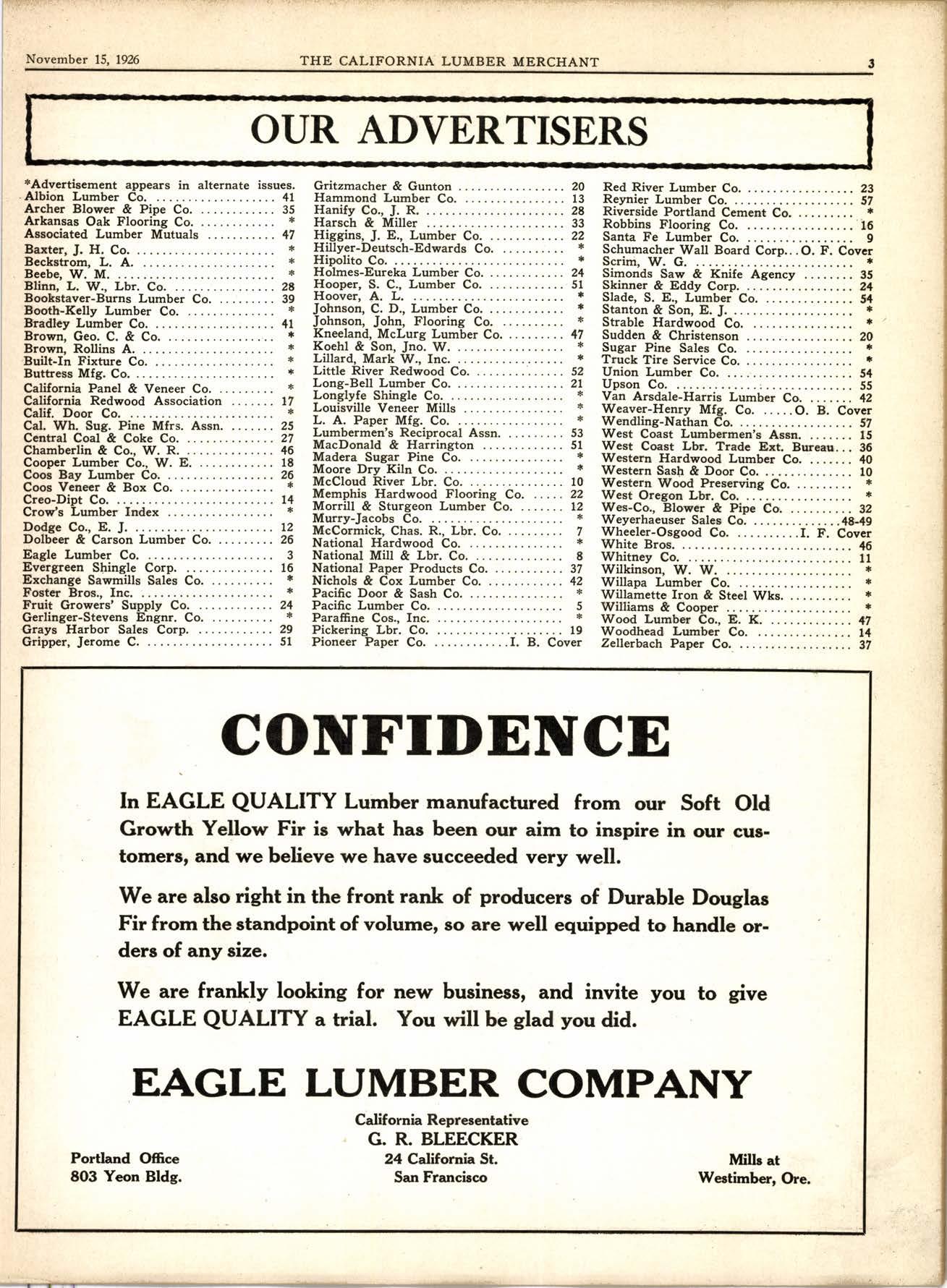 47 It r* I * * * 7 13 5 :l * 24 I t * Red River Lumber Co. ...., 23 Reynier Lumber Co. . ....... .. 57 Rivcrside Portland Ccmcnt Co.......... I Robbins Flooring Co. .. . ... i6 Santa F'e Lumber Co 9 Sch-umacher Wall Board Corp...O. F. Covcr Scrim, W. G. .. I imonds Saw & Knife Agency ... 35 Skinner & Eddy Corp. ...-. ......... A Slade, S. E., Lurnber Co. . g Stanton & Son, E. J. Strable Hardwood Co. l Suddcn & Christenson .....20 Sugar Pinc Sales Co. I Truck Tire Service Co. t Union Lumber Co. . 54 Upson Co. ..... .: ....... 55 Van Arsdale-Harris Lumber Co, .,, 42 Weaver-Hcnry Mfg. Co. .....O. B. Covcr Wendling-Nathan Co. ... 57 Wcst Coast Lumbcrrren's Acm. ..... 15 West Coast Lbr. Trede Ert. Bsrcsll,. , :16 Westcrn Hardwood Lurnbcr Co. ., 40 'Westcrn Sash & Door Co. ....... lO 'Western Wood Prcgcrving Co * West Oregon Lbr. Co. .:. . I Wes-Co., Blowcr & Prp. Co, .. . gz Weyerhaeuser Salcr Co, ..49-,+9 Wheeler-Osgood Co ...f. F. Cover YlfhiteBros. ..;..........46 Whitney Co. ....... lt Wilkinson, W. W. * Willapa Lumber Co. ... Willamette Iron & Stccl Wks. * Williams & Coopcr * Woo'd Lumber Co., E. K. ............, 47 Woodhcad Lumber Co. . ... .. li Zellerbach Papcr Co. .. 37 CONF'IDENCE