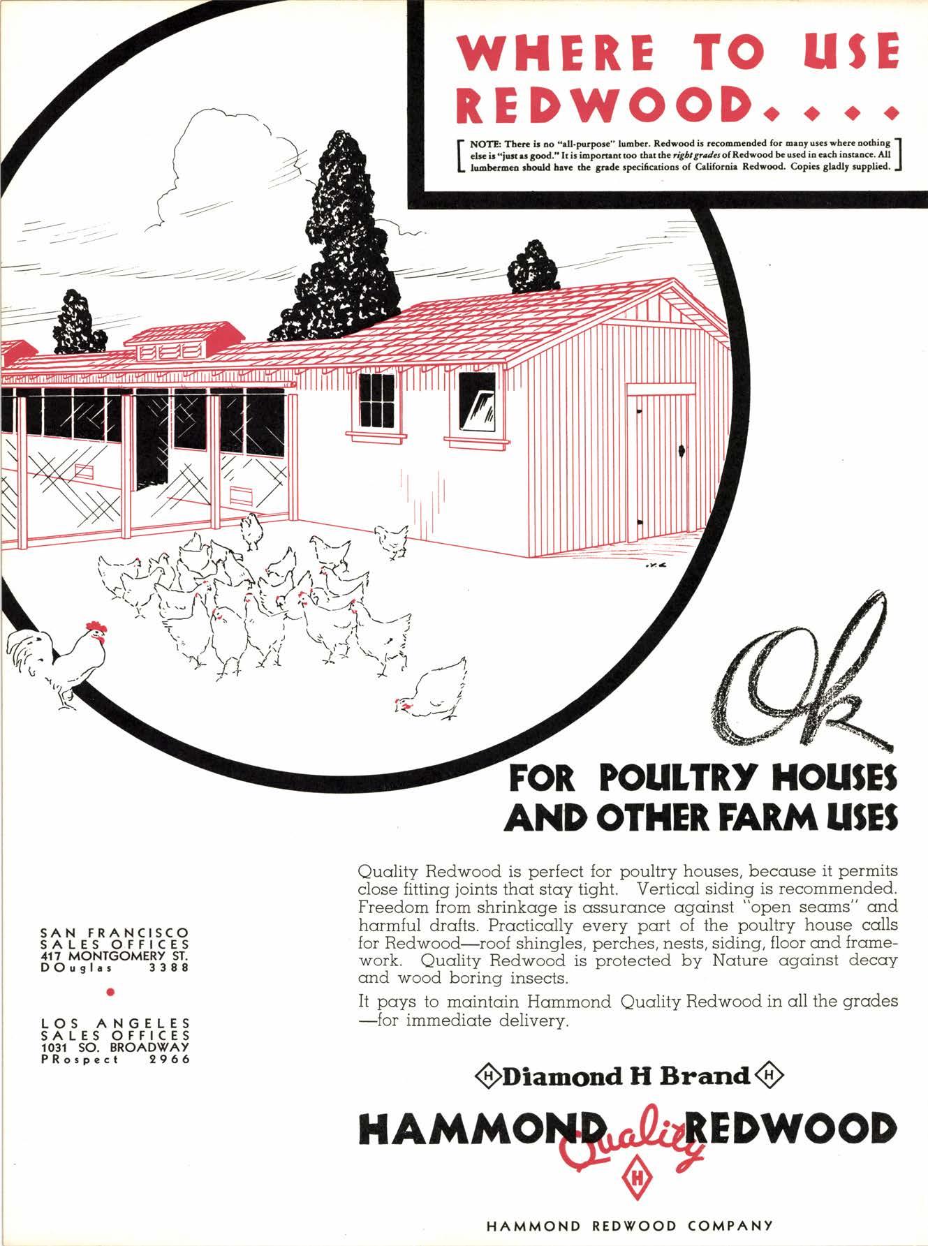Qucrlity Redwood is perfect {or poultry houses, becouse it permits close fitting joints thot stoy tight. Verticcl siding is recommended. Freedom from shrinkcrge is qssuronce qgqinst "open seqms" ctrld hormfui drofts. Procticolly every port of the poultry house cclls {or Redwood-roof shingles, perches, nests, siding, floor qnd fromework. Quolity Redwood is protected by Noture ogoinst decoy ond wood boring insects.