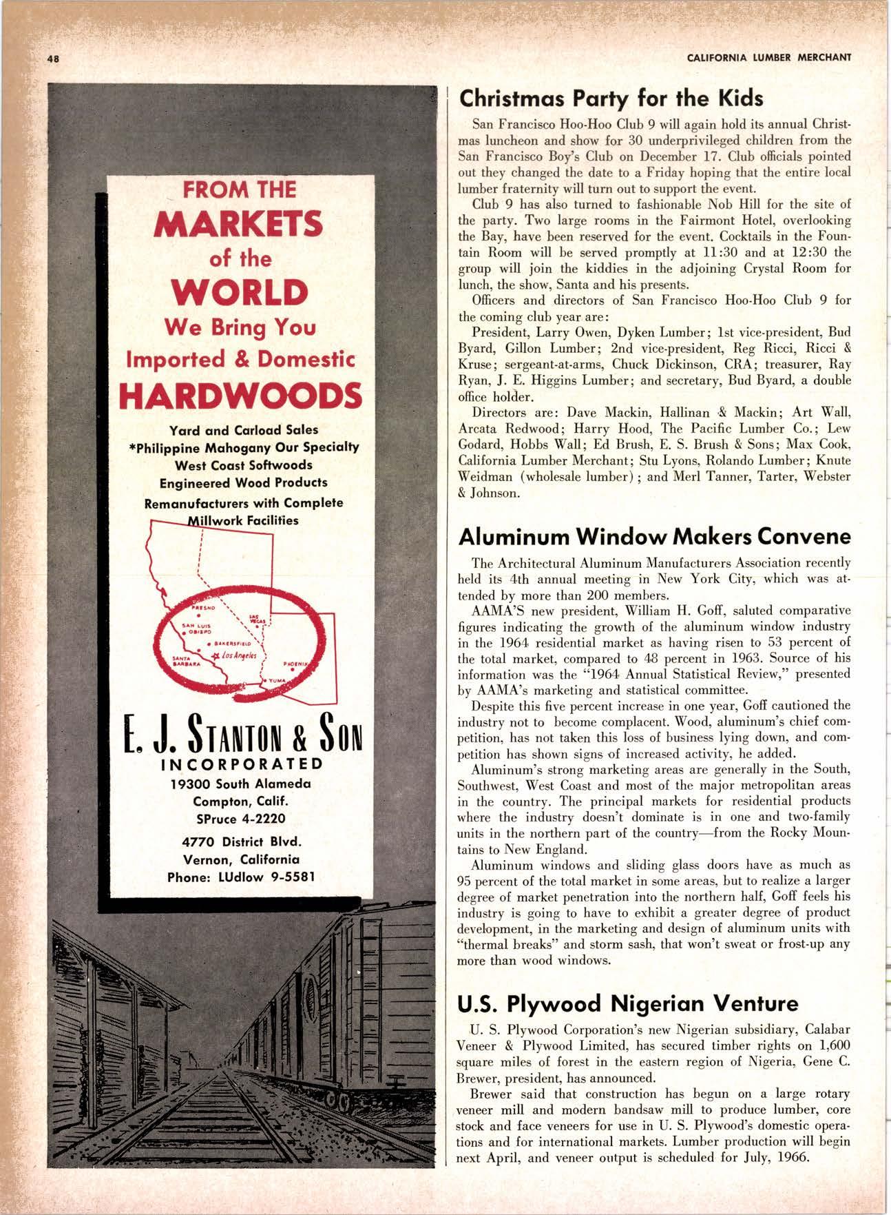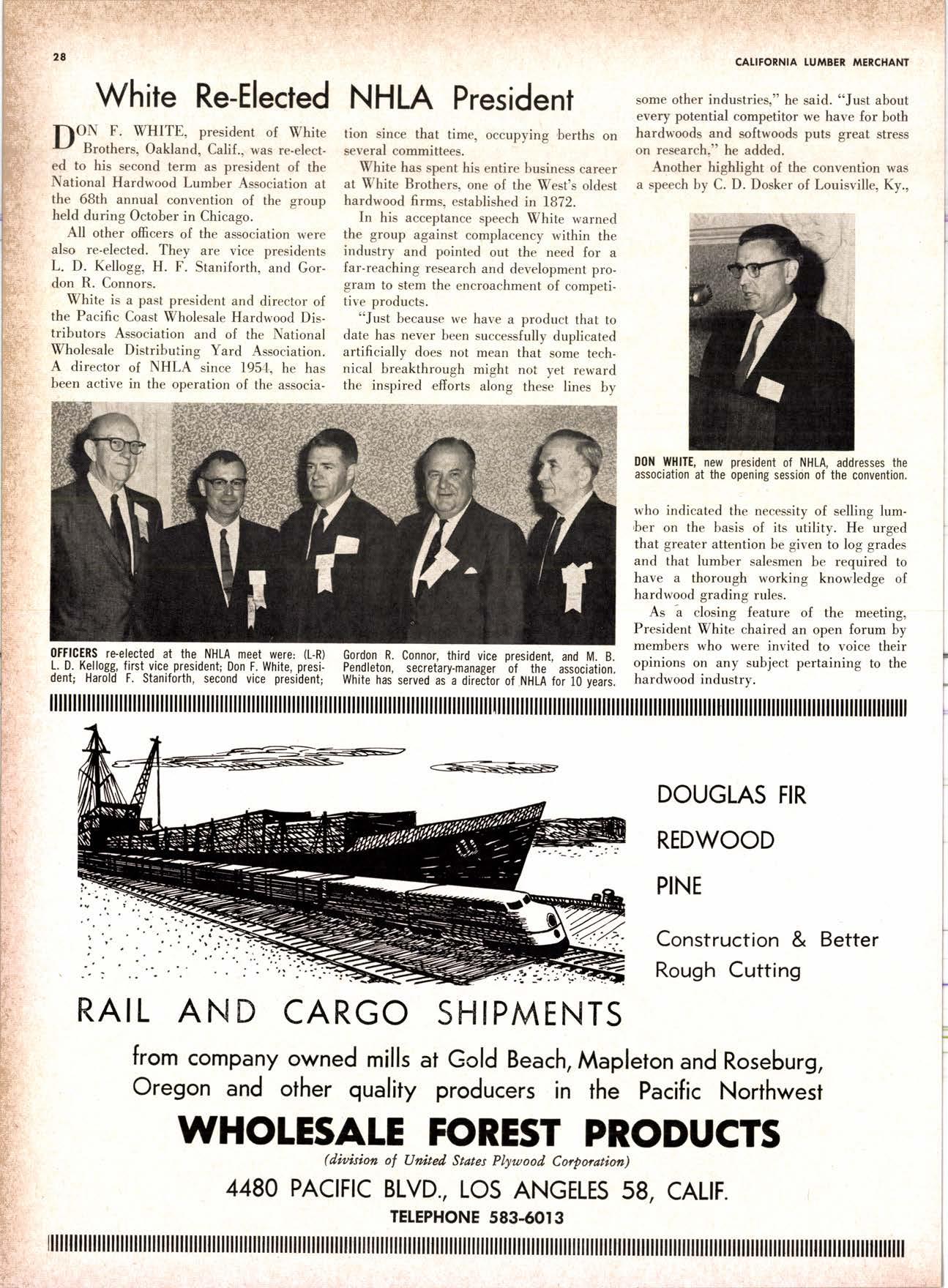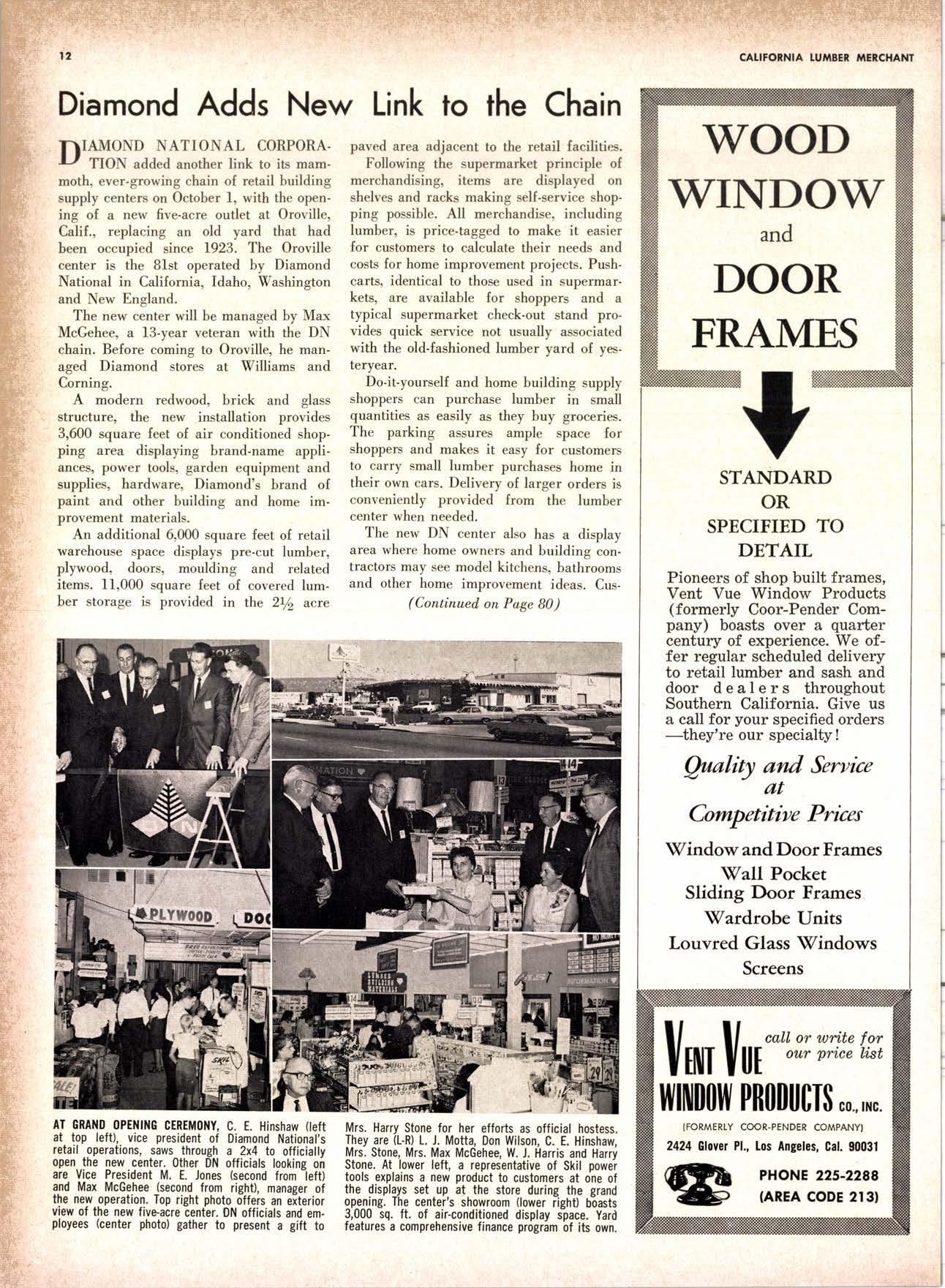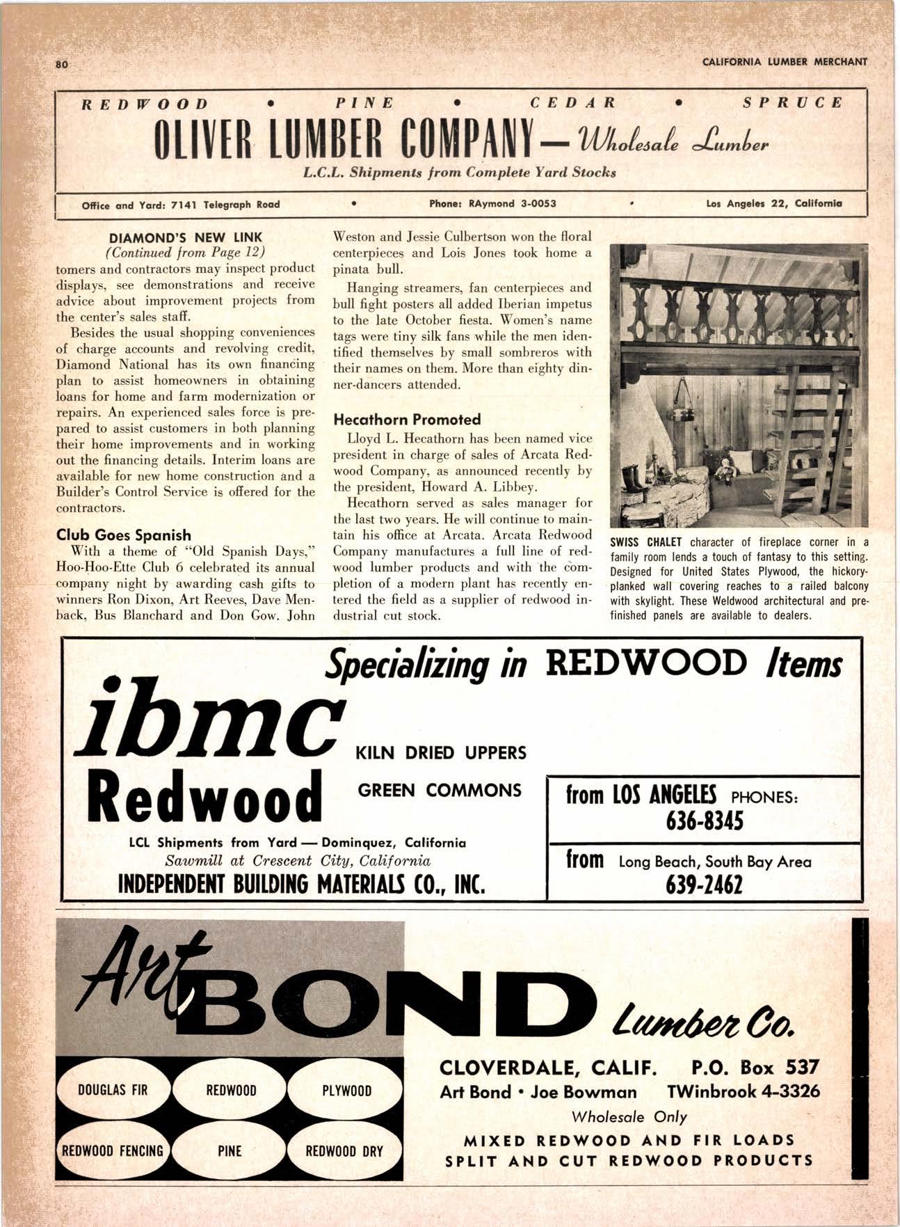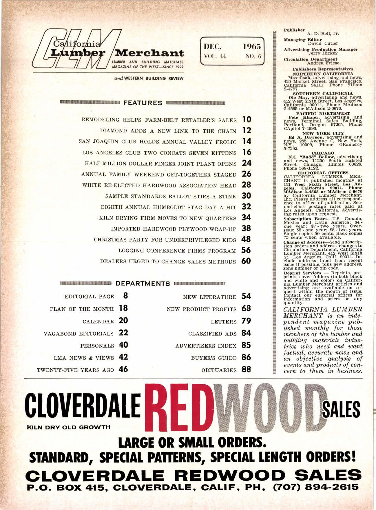 SALES DIAMOND ADDS A NEW LINK TO THE CHAIN SAN JOAQUIN CLUB HOLDS ANNUAL VALLEY FROLIC LOS ANGELES CLUB TWO CONCATS SEVEN KITTENS HALF MILLION DOLLAR FINGER JOINT PLANT OPENS ANNUAL FAMILY WEEKEND GET-TOGETHER STAGED WHITE RE-ELECTED HARDWOOD ASSOCIATION HEAD SAMPLE STANDARDS BALLOT STIRS A STTNK EIGHTH ANNUAL HUMBOLDT STAG DAY A HIT KILN DRYING FIRM MOVES TO NEW QUARTERS IMPORTED HARDWOOD PLYWOOD WRAP-UP CHRISTMAS PARTY FOR UNDERPRIVILEGED KIDS LOGGING CONFERENCE FIRMS PROGRAM DEALERS URGED TO CHANGE SALES METHODS DEPARTMENTS 8 r0 12 14 l5 24 26 28 30 32 34 38 48 56 50 EDITORIAL PAGE PLAN OF THE MONTH CALENDAR VAGABOND EDITORIALS PERSONALS LMA NEWS & VIEWS TWENTY-FIVE YEARS AGO NEW NEW LITERATURE PRODUCT PROFITS 54 68 79 84 85 85 88 r8 20 22 40 42 45 LETTERS CLASSIFIED ADS ADVERTISERS INDEX BUYER'S GUIDE OBITUARIES