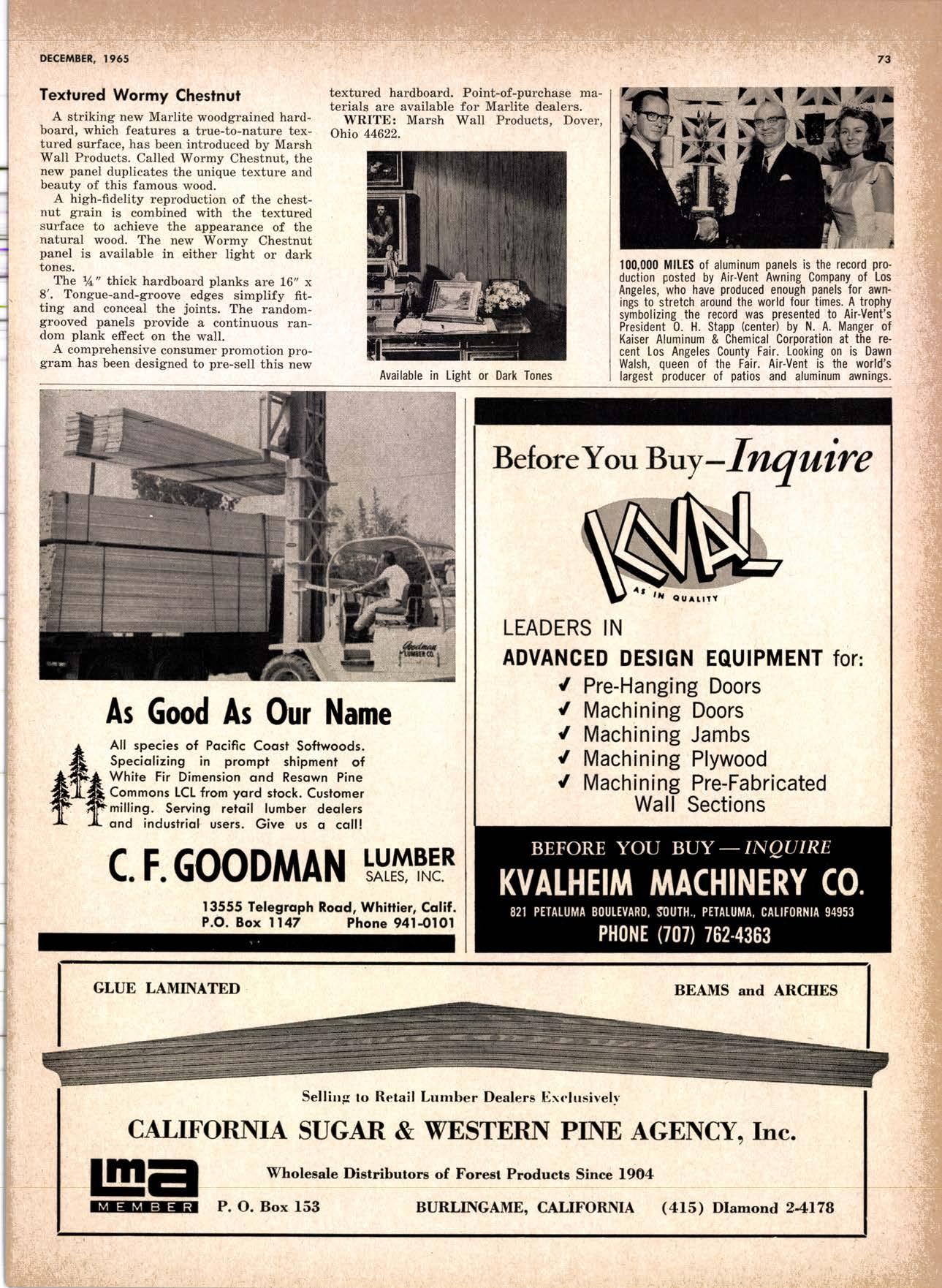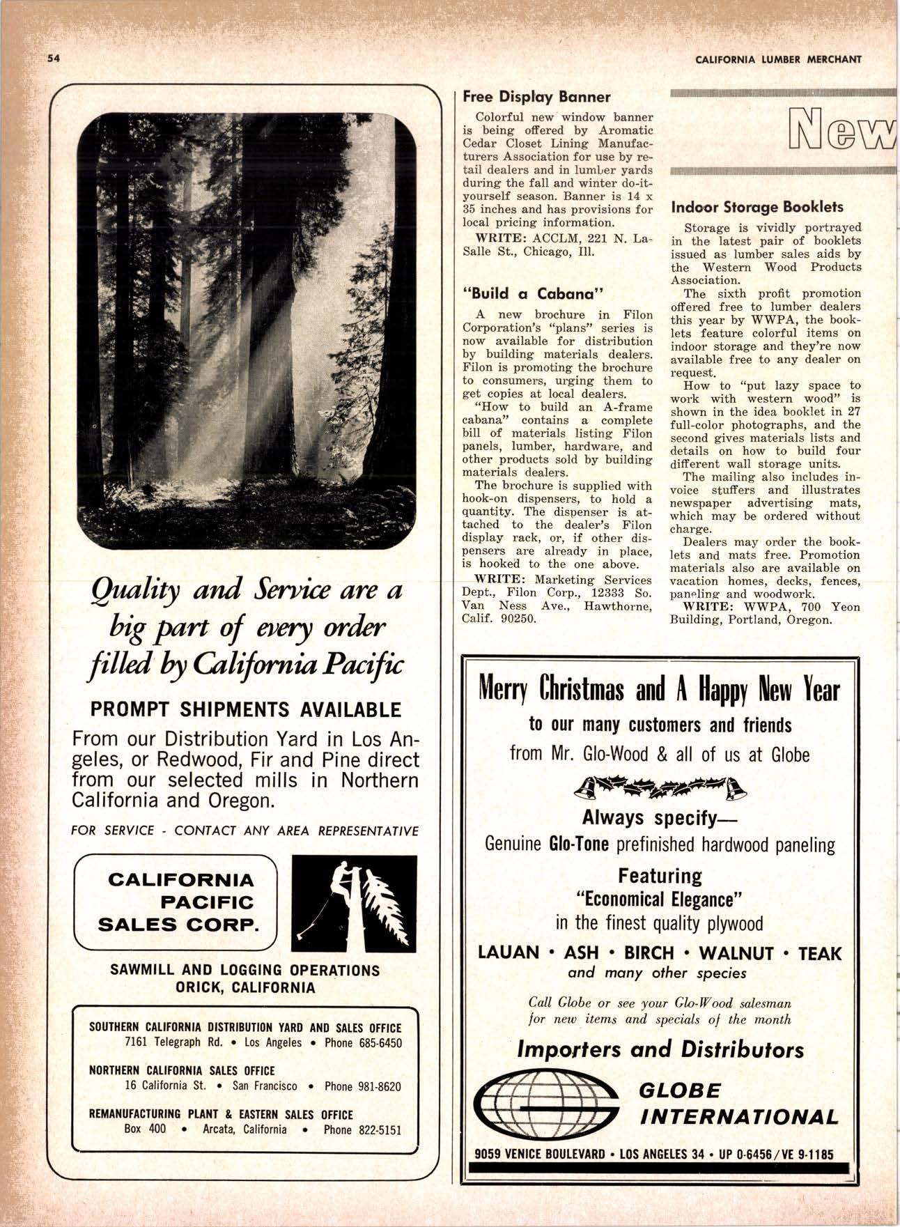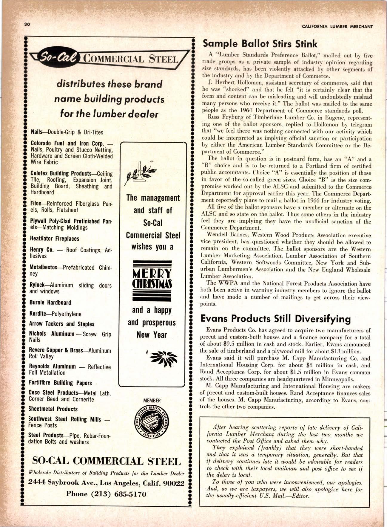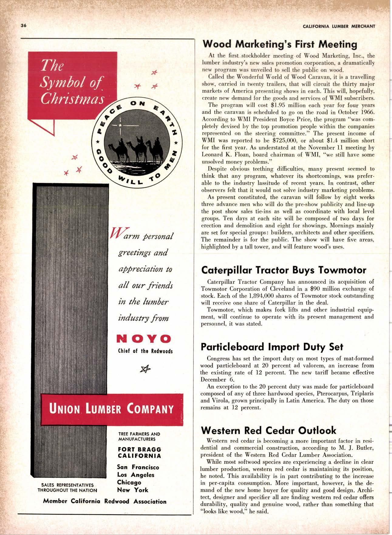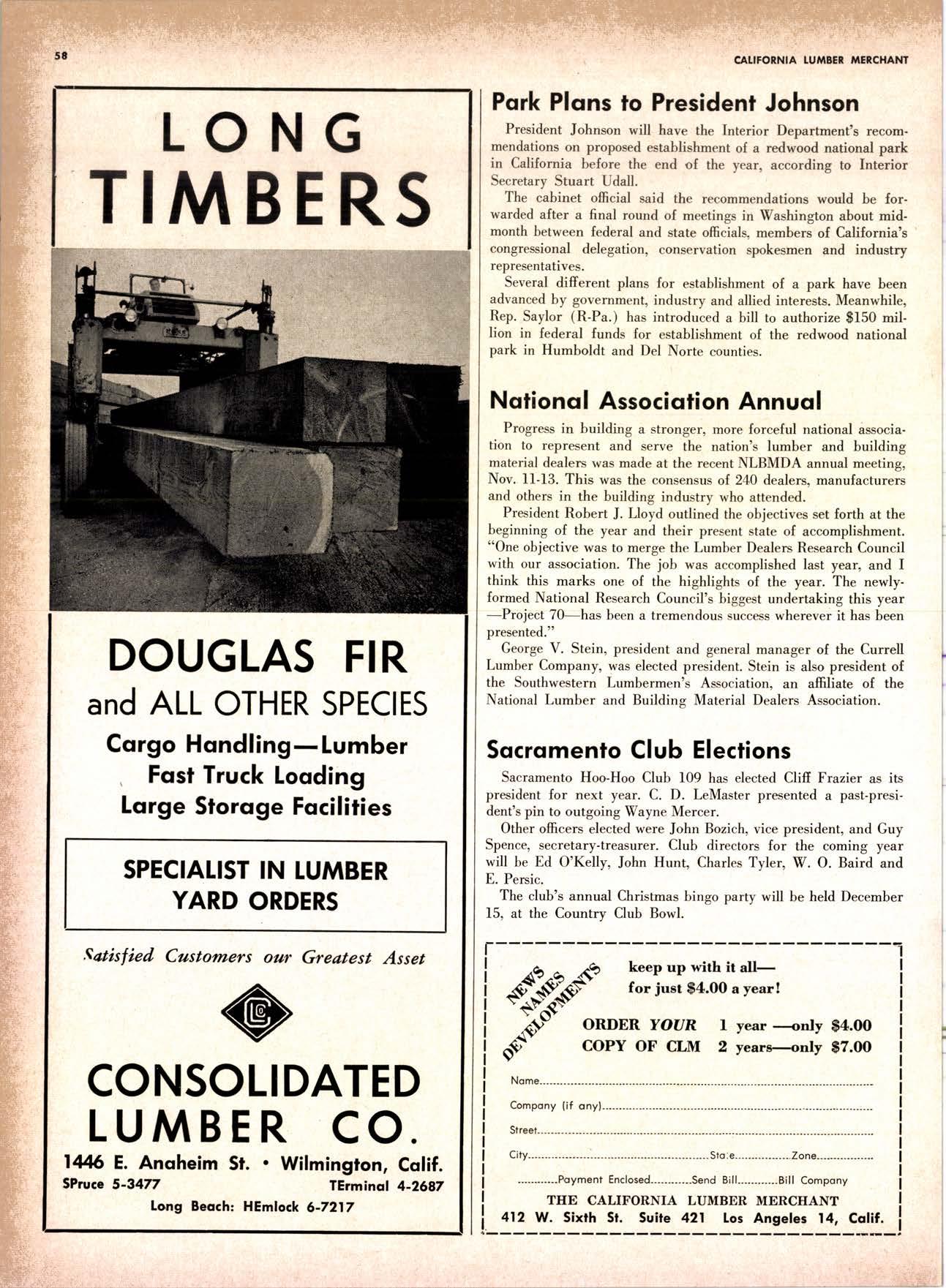 SALES DIAMOND ADDS A NEW LINK TO THE CHAIN SAN JOAQUIN CLUB HOLDS ANNUAL VALLEY FROLIC LOS ANGELES CLUB TWO CONCATS SEVEN KITTENS HALF MILLION DOLLAR FINGER JOINT PLANT OPENS ANNUAL FAMILY WEEKEND GET-TOGETHER STAGED WHITE RE-ELECTED HARDWOOD ASSOCIATION HEAD SAMPLE STANDARDS BALLOT STIRS A STTNK EIGHTH ANNUAL HUMBOLDT STAG DAY A HIT KILN DRYING FIRM MOVES TO NEW QUARTERS IMPORTED HARDWOOD PLYWOOD WRAP-UP CHRISTMAS PARTY FOR UNDERPRIVILEGED KIDS LOGGING CONFERENCE FIRMS PROGRAM DEALERS URGED TO CHANGE SALES METHODS DEPARTMENTS 8 r0 12 14 l5 24 26 28 30 32 34 38 48 56 50 EDITORIAL PAGE PLAN OF THE MONTH CALENDAR VAGABOND EDITORIALS PERSONALS LMA NEWS & VIEWS TWENTY-FIVE YEARS AGO NEW NEW LITERATURE PRODUCT PROFITS 54 68 79 84 85 85 88 r8 20 22 40 42 45 LETTERS CLASSIFIED ADS ADVERTISERS INDEX BUYER'S GUIDE OBITUARIES