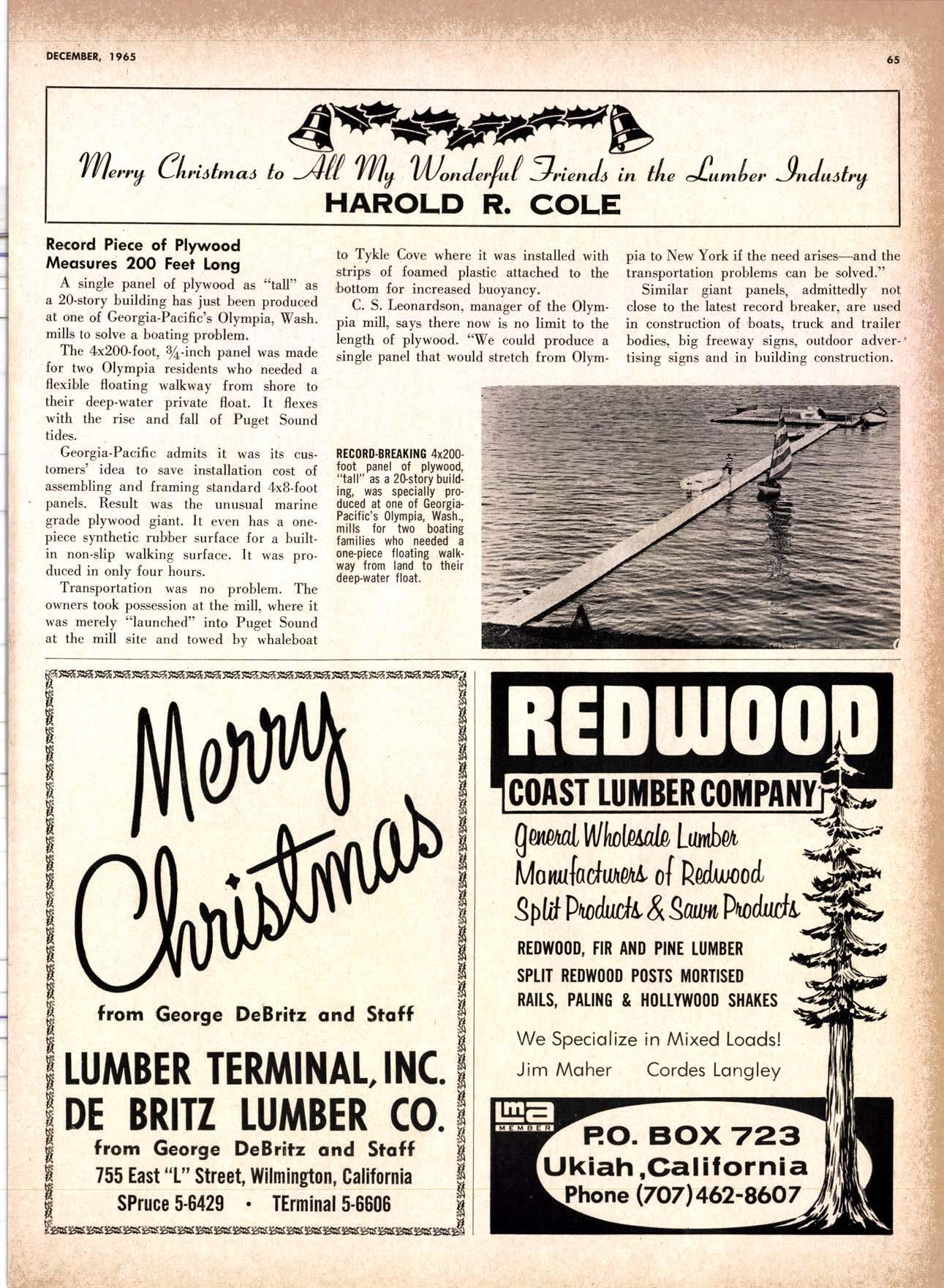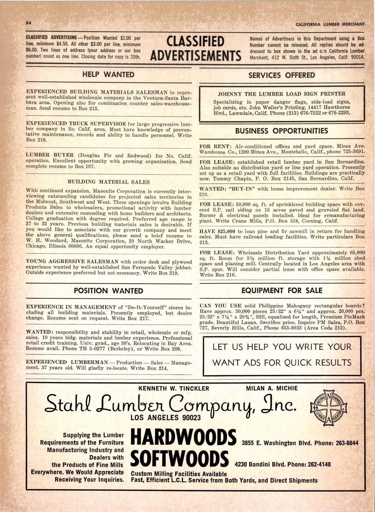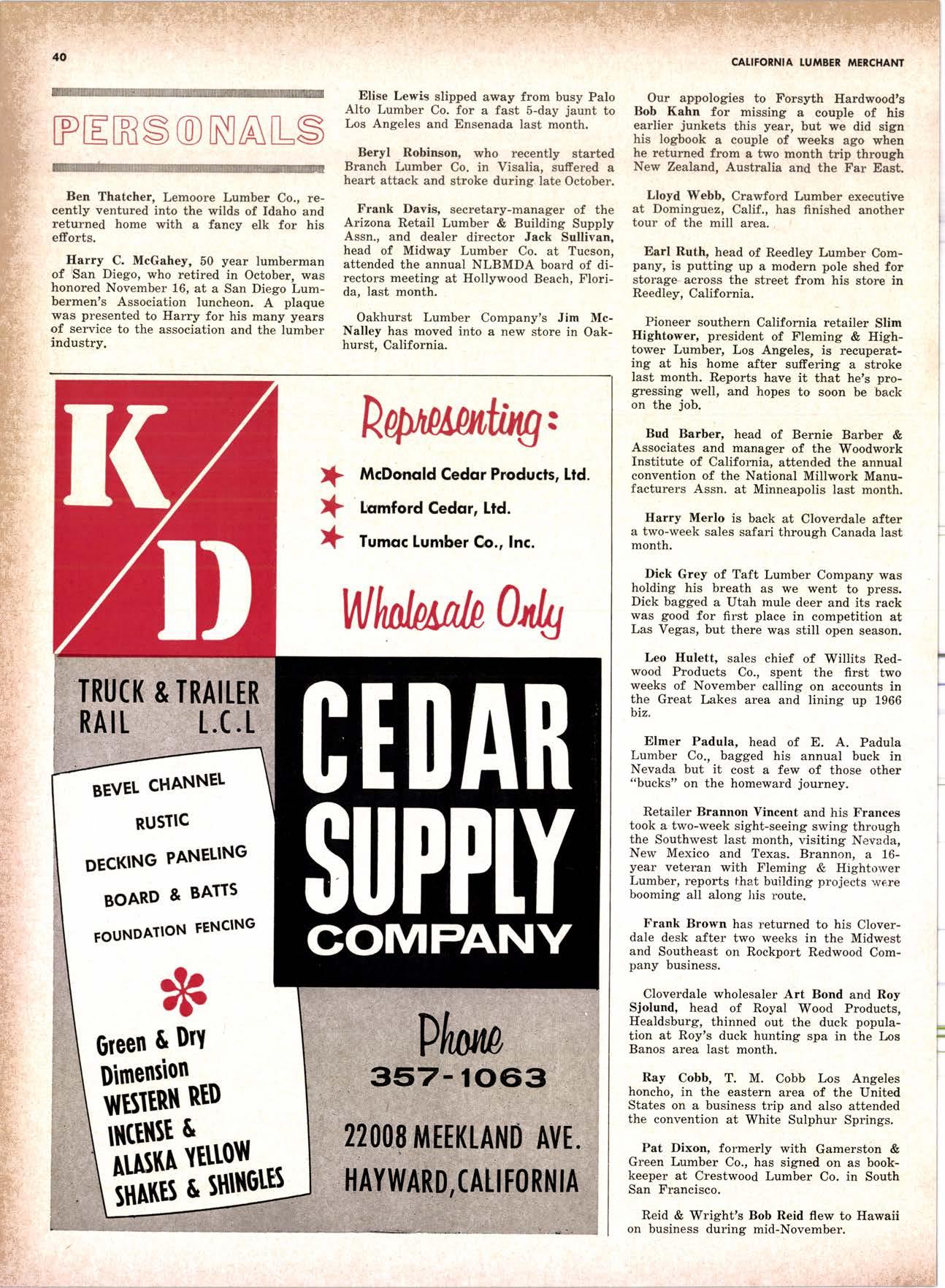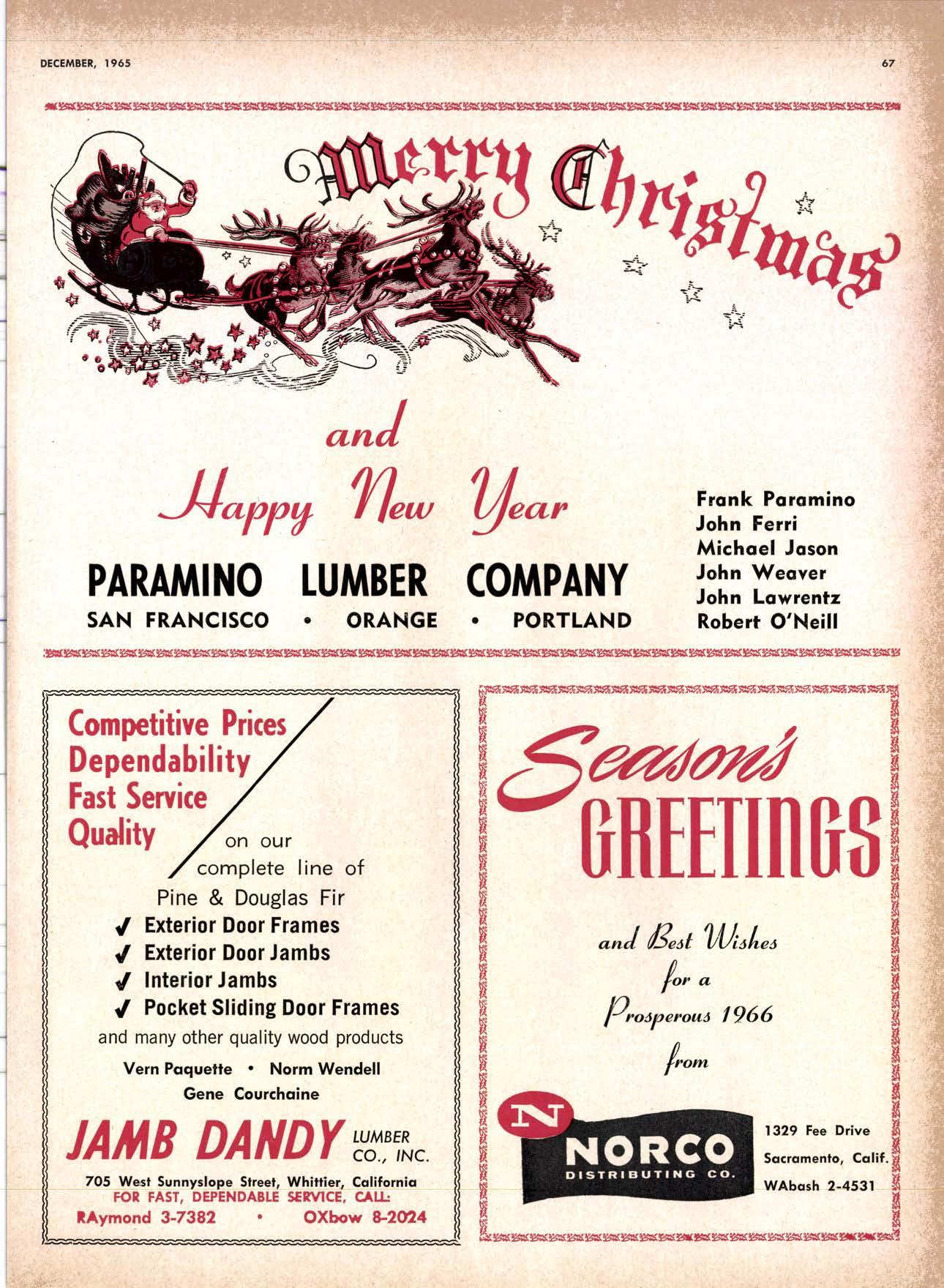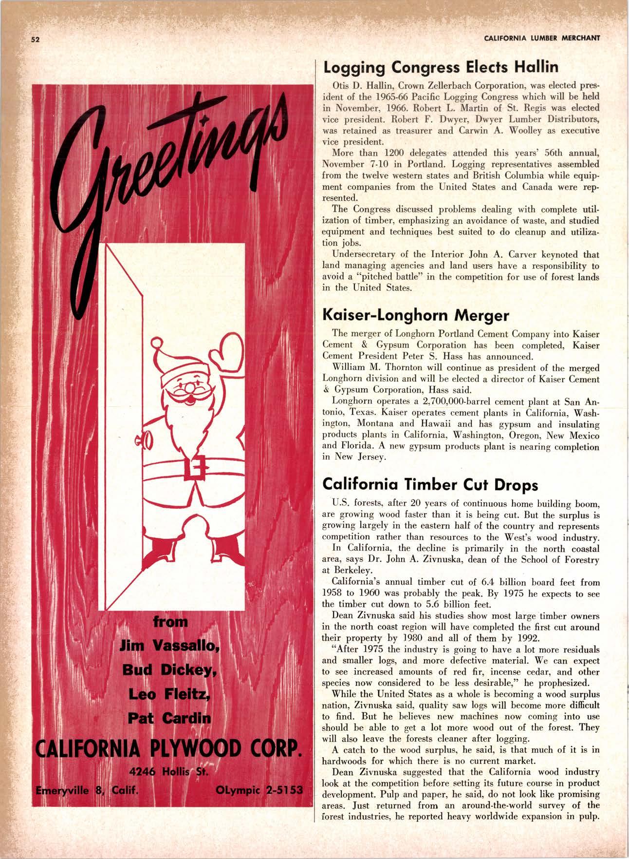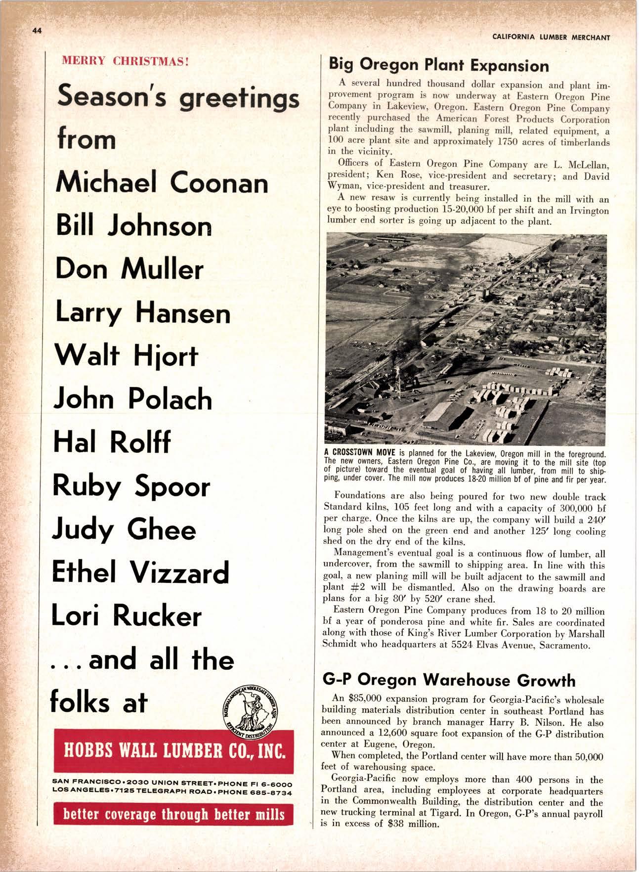 SALES DIAMOND ADDS A NEW LINK TO THE CHAIN SAN JOAQUIN CLUB HOLDS ANNUAL VALLEY FROLIC LOS ANGELES CLUB TWO CONCATS SEVEN KITTENS HALF MILLION DOLLAR FINGER JOINT PLANT OPENS ANNUAL FAMILY WEEKEND GET-TOGETHER STAGED WHITE RE-ELECTED HARDWOOD ASSOCIATION HEAD SAMPLE STANDARDS BALLOT STIRS A STTNK EIGHTH ANNUAL HUMBOLDT STAG DAY A HIT KILN DRYING FIRM MOVES TO NEW QUARTERS IMPORTED HARDWOOD PLYWOOD WRAP-UP CHRISTMAS PARTY FOR UNDERPRIVILEGED KIDS LOGGING CONFERENCE FIRMS PROGRAM DEALERS URGED TO CHANGE SALES METHODS DEPARTMENTS 8 r0 12 14 l5 24 26 28 30 32 34 38 48 56 50 EDITORIAL PAGE PLAN OF THE MONTH CALENDAR VAGABOND EDITORIALS PERSONALS LMA NEWS & VIEWS TWENTY-FIVE YEARS AGO NEW NEW LITERATURE PRODUCT PROFITS 54 68 79 84 85 85 88 r8 20 22 40 42 45 LETTERS CLASSIFIED ADS ADVERTISERS INDEX BUYER'S GUIDE OBITUARIES