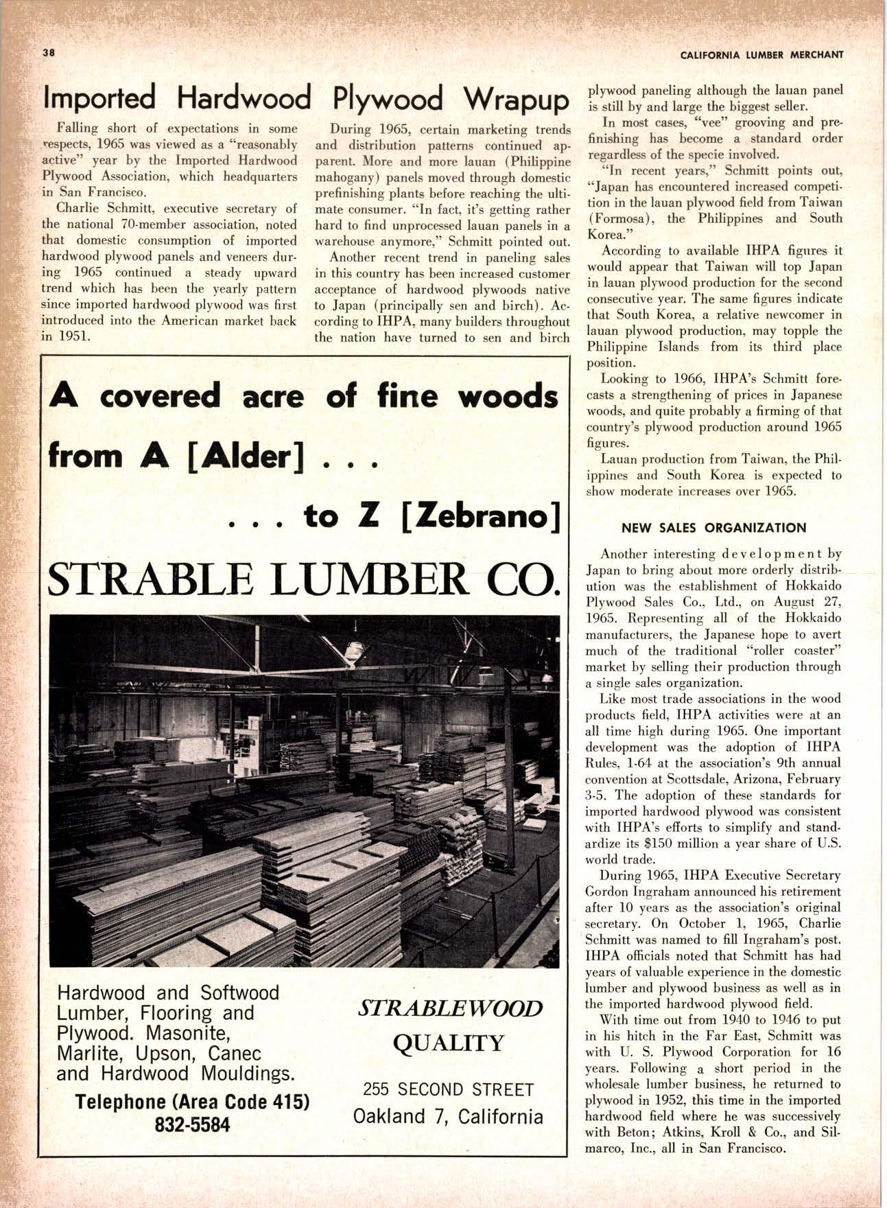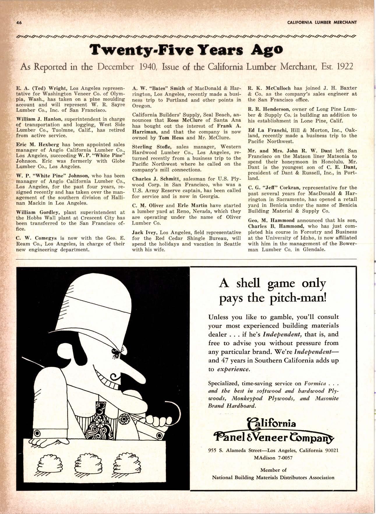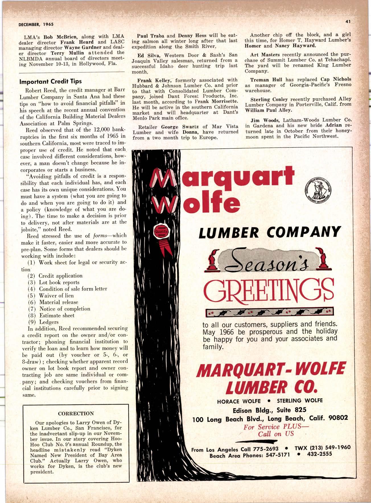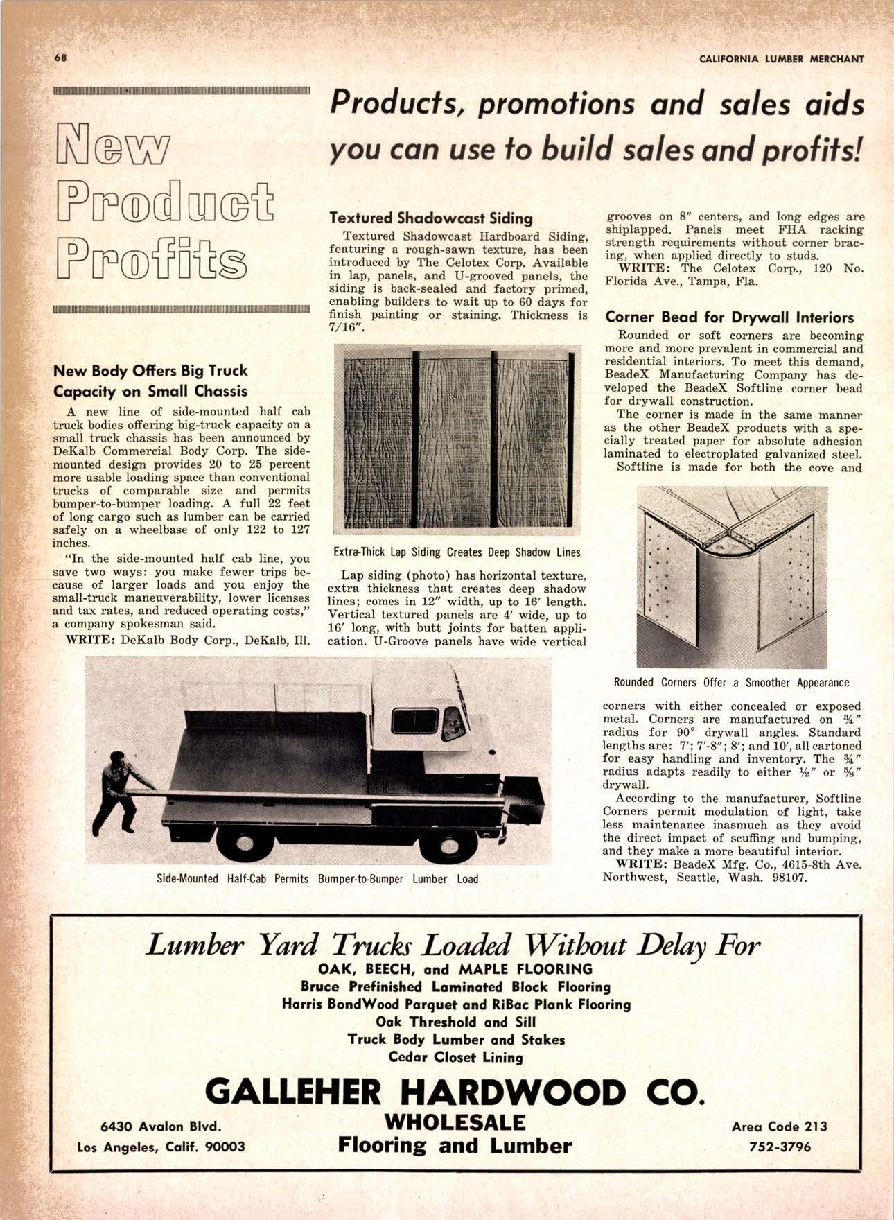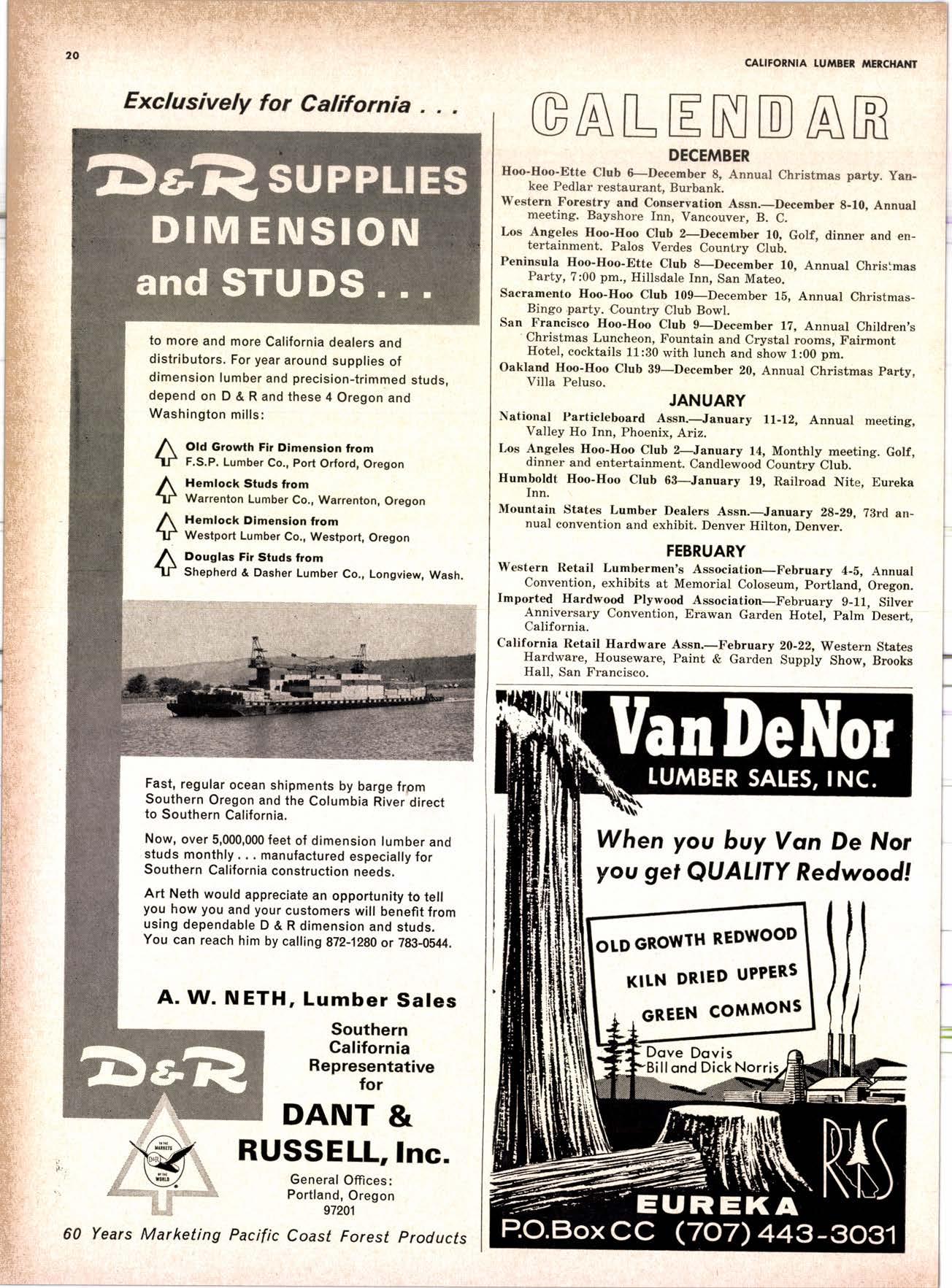 SALES DIAMOND ADDS A NEW LINK TO THE CHAIN SAN JOAQUIN CLUB HOLDS ANNUAL VALLEY FROLIC LOS ANGELES CLUB TWO CONCATS SEVEN KITTENS HALF MILLION DOLLAR FINGER JOINT PLANT OPENS ANNUAL FAMILY WEEKEND GET-TOGETHER STAGED WHITE RE-ELECTED HARDWOOD ASSOCIATION HEAD SAMPLE STANDARDS BALLOT STIRS A STTNK EIGHTH ANNUAL HUMBOLDT STAG DAY A HIT KILN DRYING FIRM MOVES TO NEW QUARTERS IMPORTED HARDWOOD PLYWOOD WRAP-UP CHRISTMAS PARTY FOR UNDERPRIVILEGED KIDS LOGGING CONFERENCE FIRMS PROGRAM DEALERS URGED TO CHANGE SALES METHODS DEPARTMENTS 8 r0 12 14 l5 24 26 28 30 32 34 38 48 56 50 EDITORIAL PAGE PLAN OF THE MONTH CALENDAR VAGABOND EDITORIALS PERSONALS LMA NEWS & VIEWS TWENTY-FIVE YEARS AGO NEW NEW LITERATURE PRODUCT PROFITS 54 68 79 84 85 85 88 r8 20 22 40 42 45 LETTERS CLASSIFIED ADS ADVERTISERS INDEX BUYER'S GUIDE OBITUARIES