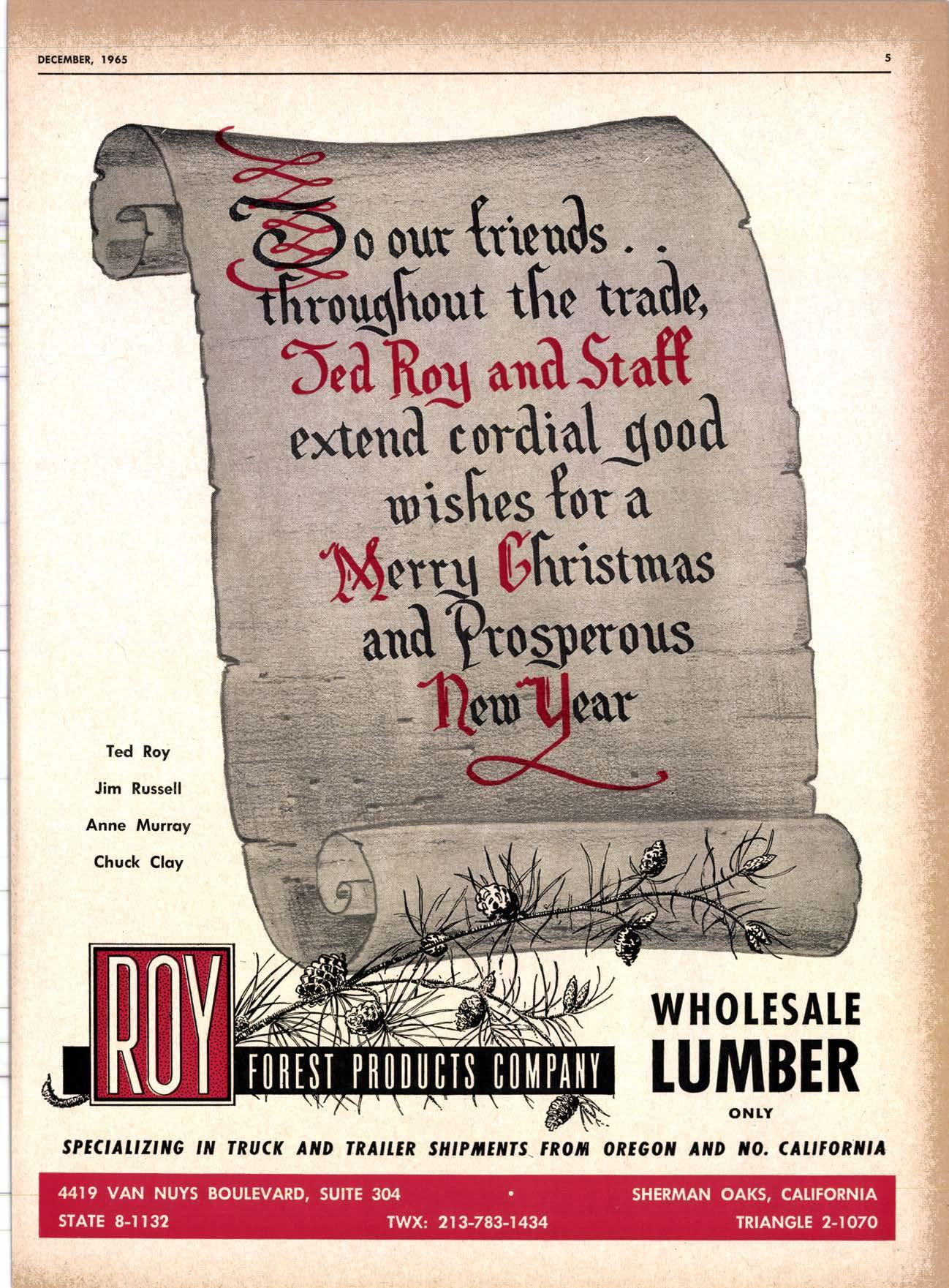 DECEMBER, I965 \ \ ,irA # ; ,trjj ' I t ,:t;:ll ..**td j ..: .x'.i;: i ".:.il*i;*; .r".1,i' rl!::il ,, '.:;i:,; , " q ';].i.i::::.&::';::.': s;qsi*:*; ittt:: r.:;: 1;::'.1 .:r:: is#.s 6o outtt,eolt . . ffiuq[out the ttailo, ?I-ilRs -T1 Stafft.uiiil ioril1al1tool tfuIry,$hrutwils -*t?toqlsrous *. -r. t ',t--' Ted Roy Jim Russell Anne Mr.lrroy Chuck Cloy WHOI.ESATE TUMBER ONLY 0REGON AHD lt0. CAlrFORlltA SPEC'AT,ZING 'N TRUCK AND TRA'TIR SHIPITENrS FRON