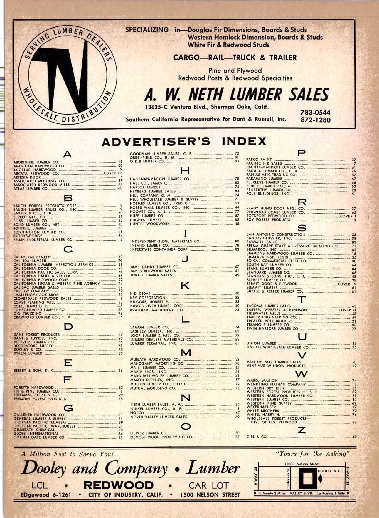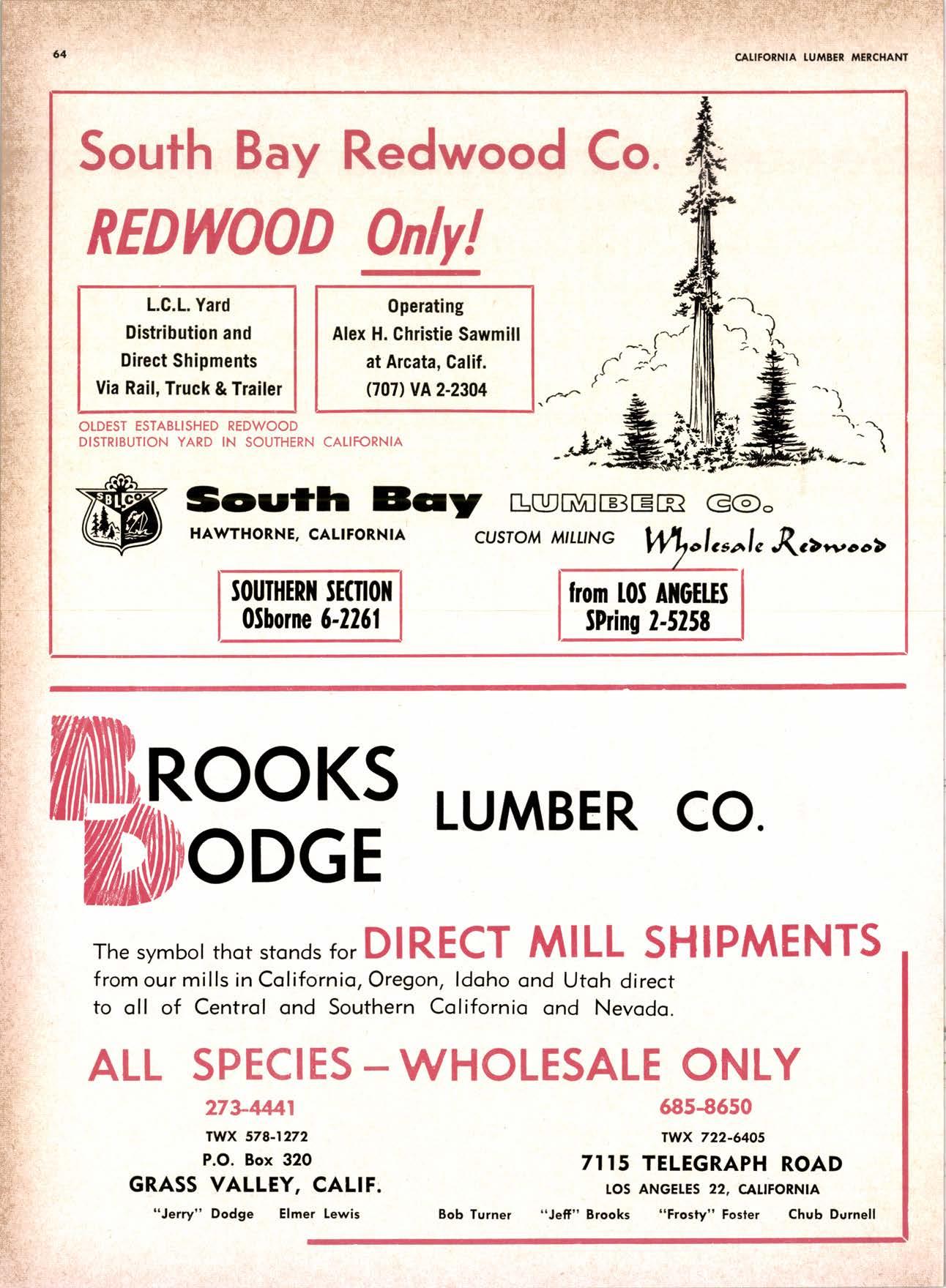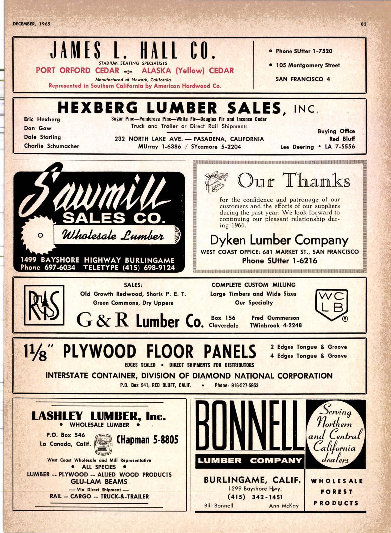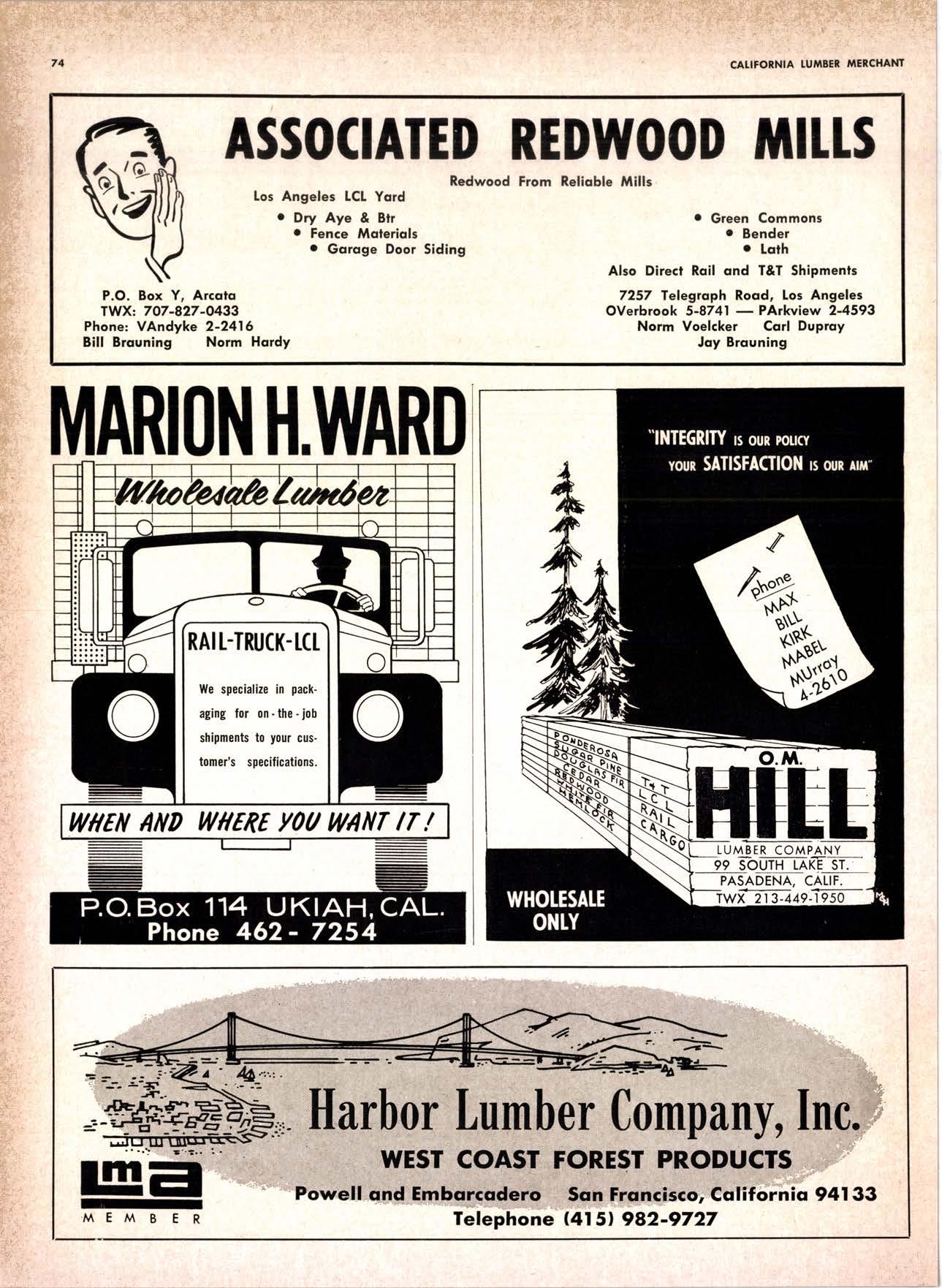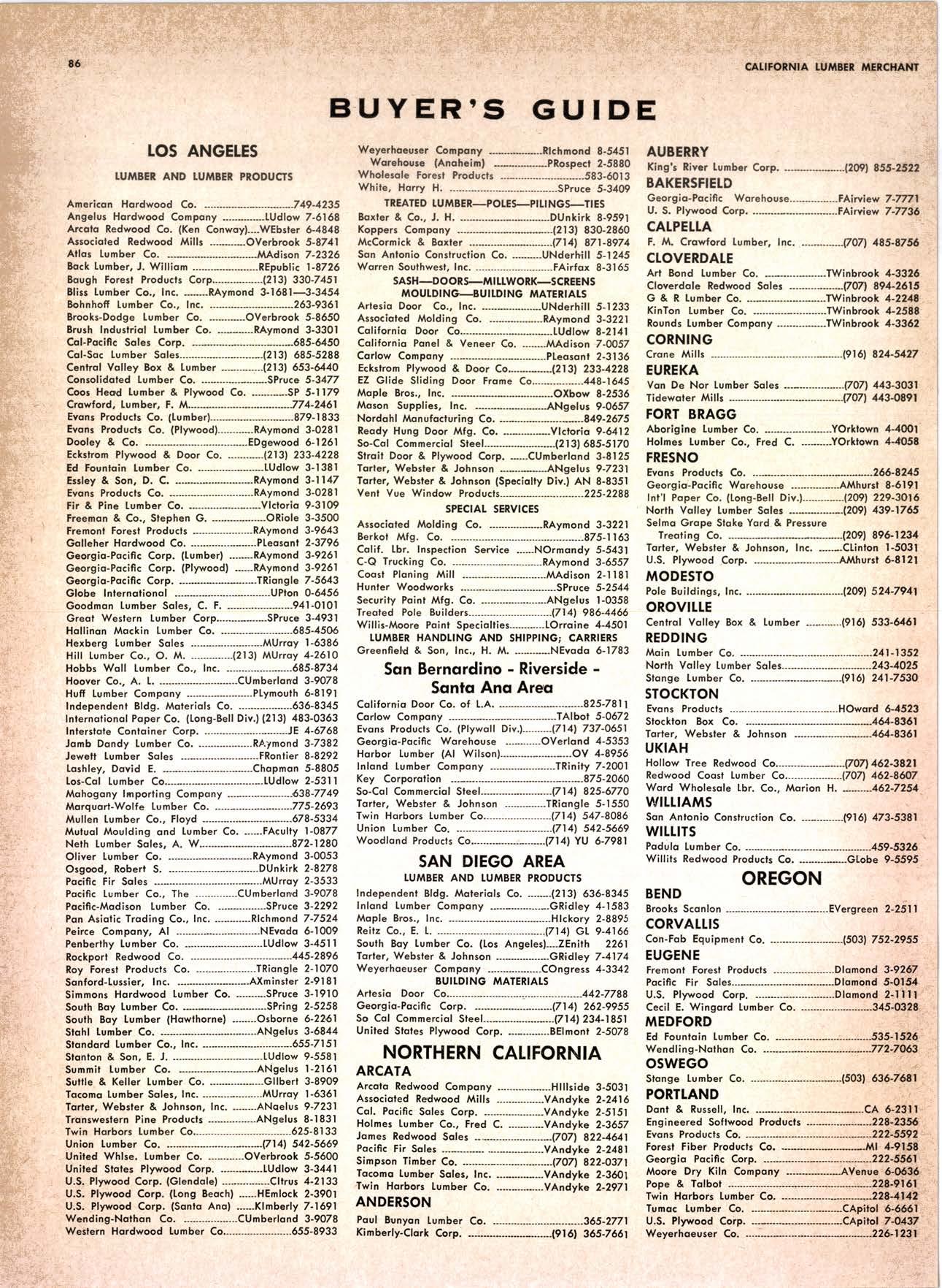 22940ff North Volley lunbcr Soler -------------(209) 139-176 Selmo Gropc Sloke Yord & Pressure Treofins Co. .-.----------------.----..-(2091 89&1231 rreorng lo. .-.----------Tqrter, Webster & Johnson, Inc, ----.--Clinlon t-503t U.S. Plywood Corp. .--.----------...-----.-.-Alihurrt 6812I MODESTO Huntcr Woodworks .--...------...-..-....-------SPruce 5-2544 pole Buildings, Inc. ...-___._._-_-._-_-__..-.....(2Og) 521-7911 Security Point Mfg. Co, ---------..-.ANgelus l-0358 ADArrrrrE 9E19.||I'g||l|,vrlv.swlvE|g'|-vgJgoIov|LtE Treoled Pole Builders------------------.----17141 986-446 Wiffis-lr{oore Point Speciolties.....-.-....!Orroine 4-45O1 Centrol Vclley Box & Lumber -.--.-...--(9161 533'6|,6l tUT BER HANDLING AND SHIPPING; CARRIEnS REDDING Greenfield & Son, Inc., H. M. .--....--.-NEvodo 6-1783 Moin Lumber Co. ._---.._-.._-___-...-__-..__.-.-..-.-..-...2/+l-1352 SOn BefnOrdinO - RiVefSideNorth Volley lumber Sqles----.-.-.-..-..-.-------------213-1OU Sonto ano lieo _ _;Tet*?6i:' Co. .-.---.---........-....-..--.(916) 21|.75*Cofifornio Door Co. of !.A. .--..-.--.-------r:T:--S29-Zql! fron, products .....-....HOword &152g Corlow Compony -------------..-....--.---TAlbot 5-0672 Srockron Box Co. --..--__---_--.._-._--_-__.-_-..:it_Stei Evons Producls Co. (Plywoll Div.l-----.--.-(7141 737-0651 ; Georsic-pocific woiehouse .--'------di";;-Jd;i ['[il"*'ou"' & Johnson ""--""-"-"---""''f61-83:l Horbor Lumber (Al Wilson)-.--.-...-.-.-..-.-..-OV 4-8956 tnlond f.umber c'orpony -.-.-..-..-.....--.-..rninity 7-2001 Hollow Tree Redwood co.--.--..-----------..uon16?tl2_! Key Corporofion -_-_---_.___.__...----_------____---__-gzs-zooo Redwood coosl lumber Co.------------------l7o7l 152.86f. So-Cof Commerciol Steel--------.-.-.--.--...-.l7l11 825-6770 Word Wholesole [br. Co., A{orion H. ---.---162-7251-. Torfer, Websler & Johnson .---...----.-TRiongle 5-1550 WlttlAMS Twin Horbors [umber Co.-------...-.--.--.---.17141 547-8086 Sqn Antonio Construction Co. -------------(9161 473-5381.]Union Lumber Co. ------.--..-.------------------17141 512-#69 WILUTS Woodfond Producrs Co.---------.---.--------V11lYU 6-7981 podulo lumber Co. .--__--_--_-----__--.-_-_--_.-*___45C-5E!At, SAN DIEGO AREA wiilits Redwood producls Co. ---_----___--Grobe 9-{t95,: tui BER AND lur/tBER PRoDucTs OREGON ;' 't Independenl Bldg. itcteriols Co. ----.--.(2131 636-8345 BEND lnlond lumber Compony -------.-----.-.--GRidley 4-1583 Brooks Sconlon _----_--EVergreen 2-i5.ll Mopfe Bros., Inc. .-------.----.-----:-Il:.kojl ?-l?11 CORVALLIS Reitz Co., E. t. -..---....-.--.-.---.-..-.-----..17141 Gt 9-4166 :-lt^--tt: - - .-South Boy lumber Co. tror lig"i"rf----Zl"it ZZZi Con'Fob Equipment Co. --------------...-------(5031 752'2955 Torler, Websler & Johnson ..-.-.....--.----cRidley 7-4174 EUGENE Weyerhoeuser Compony -----..-.----COngress 1-3342 Fremont Foresl Producfs -----------..-..----Dlomond 3-f2ff. : BUltDlNc I ATERIALS Pocific Fir Sotes...--..--...-..-.-.-..........--Dlomond 5.(N{ll. ..-: Arfesio Door Co.--------.-----."-.-- --......-,...----------112-7755 U.S. Plyrood Corp. ....-.--.--......-.-..-..Dlomortd t.t?t+ t': Georgio-Pocific Corp. ....-.---.-.-..---------17111 262-9955 Cecil E. Wingord lumber Co. .-..--.-...-.....-...-345e"f*:l So Col Commerciol Sleel-.---....-*-----:(7111234-1851 MEDFORD :;:i ." Uniled Stotes Plywood Corp. ...-.----.-.-BElmonr 2-5078 Ed Fountoin Lumber Co. NORTHERN CAUFORNIA wendrins-Norhon co. ARCATA L')wE(,Lt .-^^. ---'rt l' m*"*;ru*.lTi_ill::::::::.rlll*: l:ilil ;'ffiirlil,T'co ' .'.""'--r50sr ul'ff;,, Col, Pqcific Soles Corp. .-.-.-...-........--VAnayfe Z-StSt Donl & Rusself Inc..-------------*-C.4.,-}I,S|Y' Hofmes Lurnber Co., ired C.