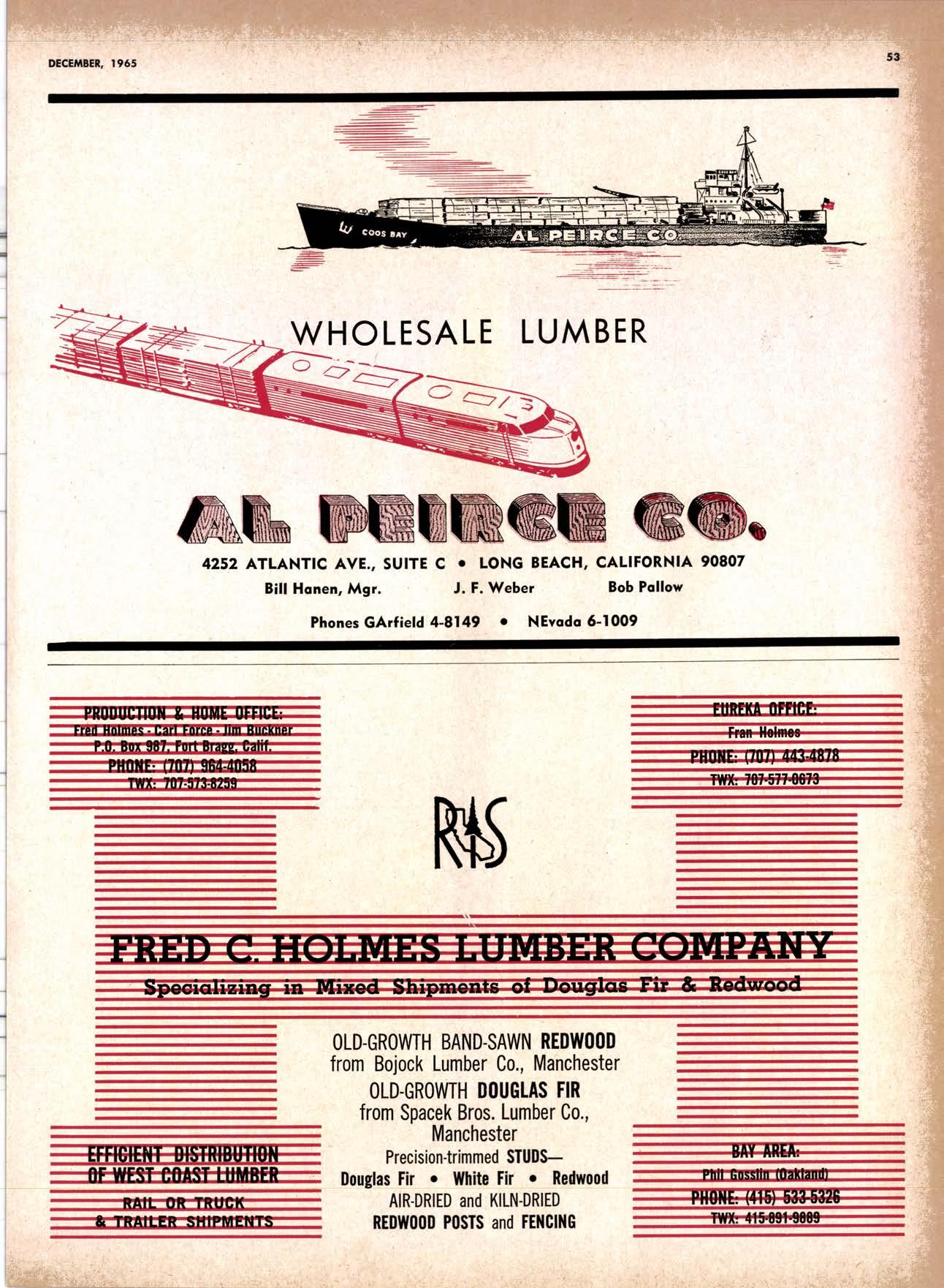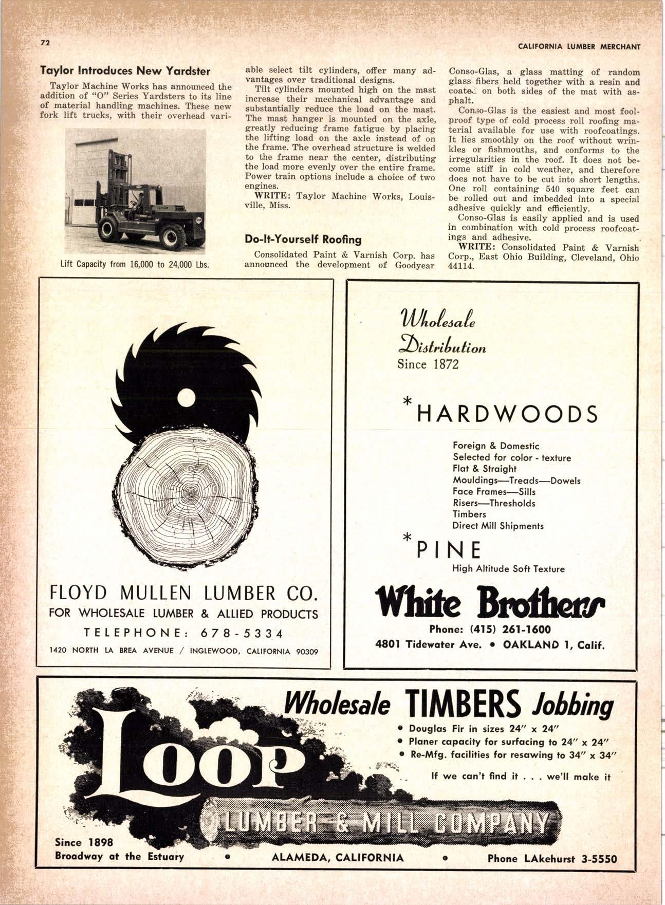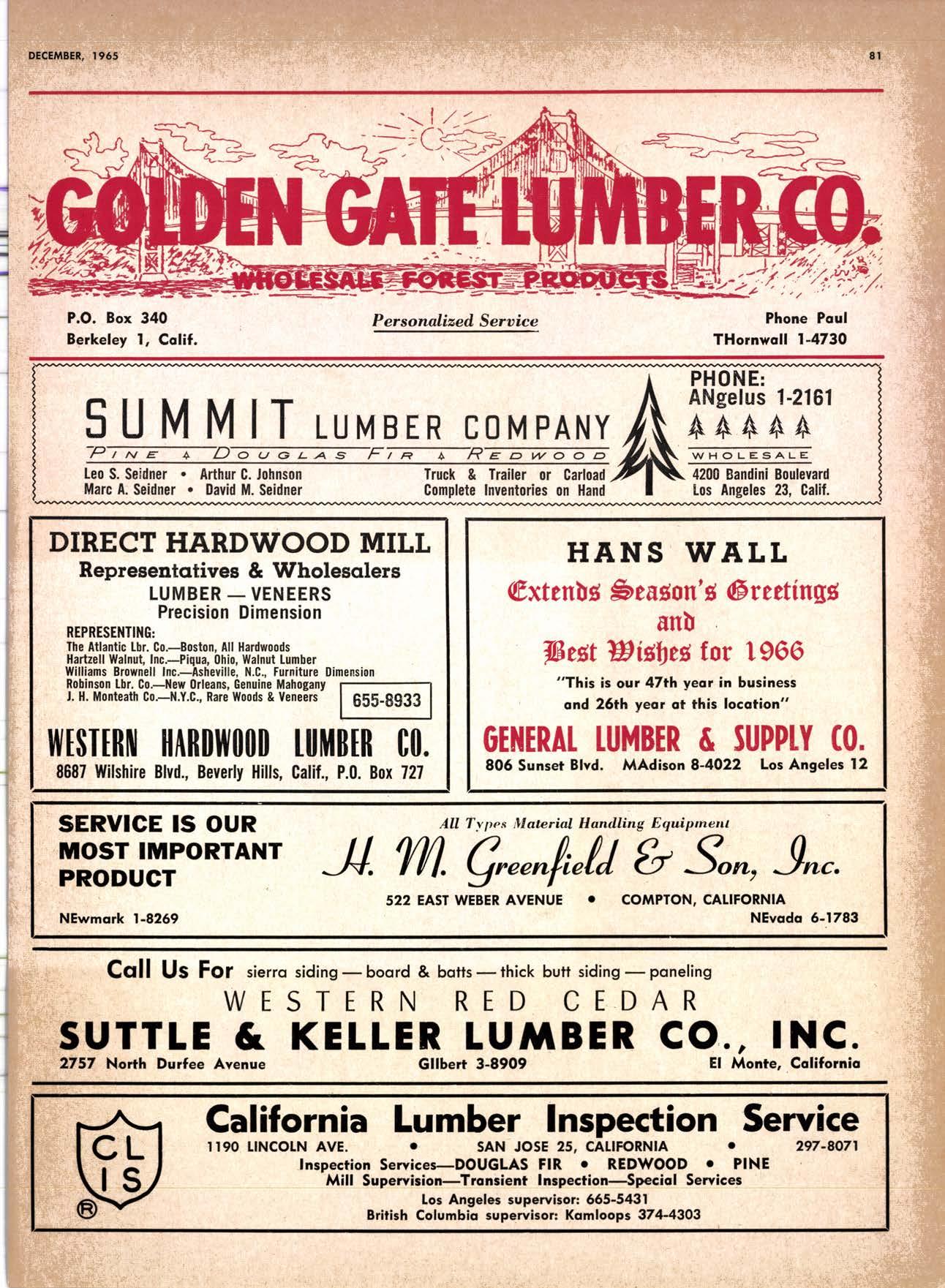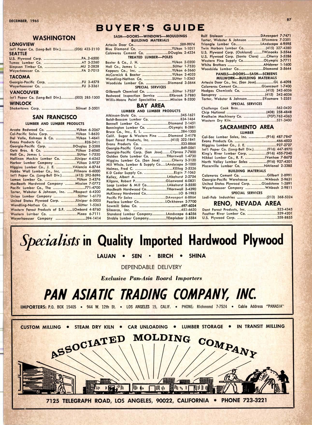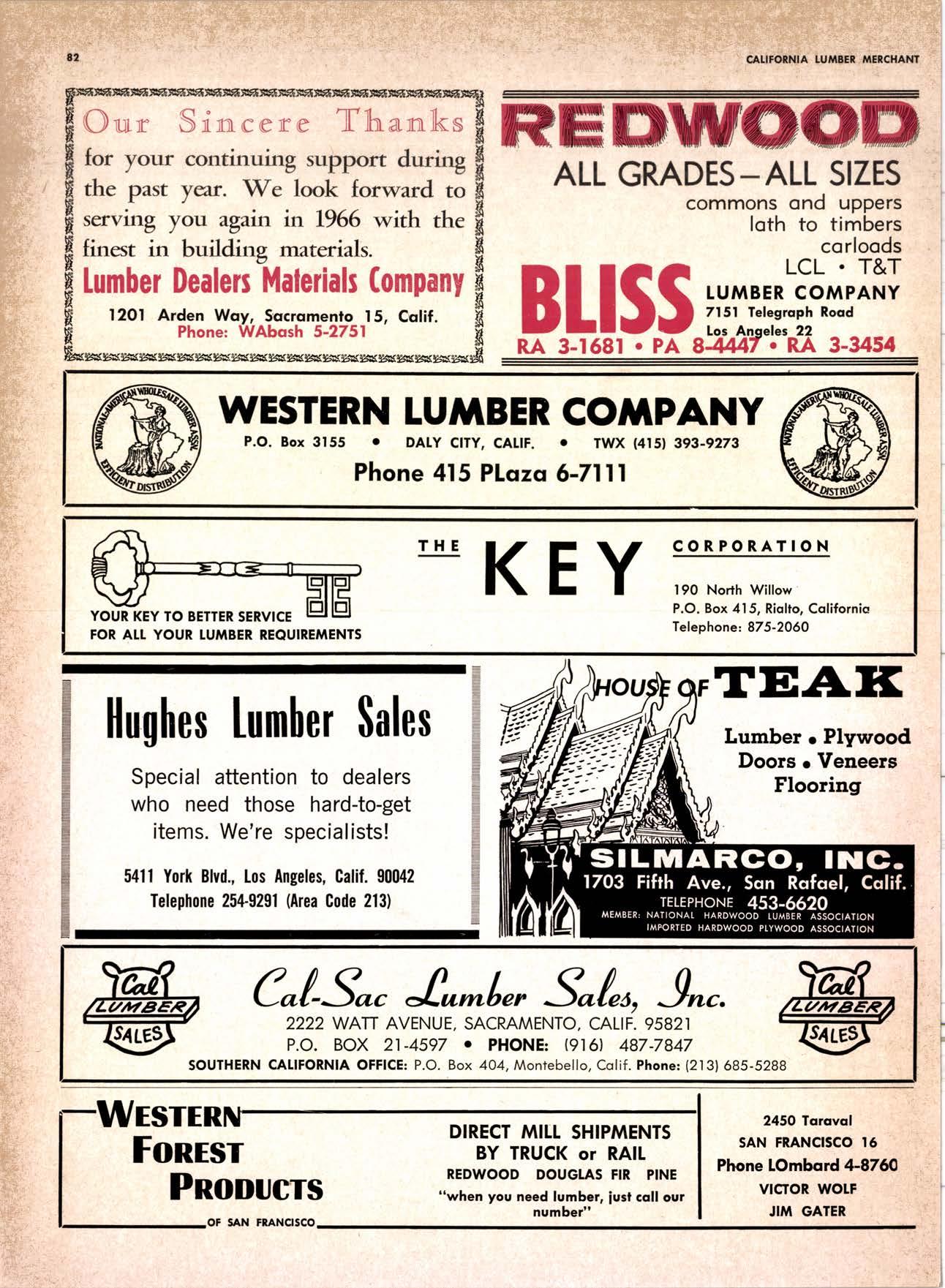 22940ff North Volley lunbcr Soler -------------(209) 139-176 Selmo Gropc Sloke Yord & Pressure Treofins Co. .-.----------------.----..-(2091 89&1231 rreorng lo. .-.----------Tqrter, Webster & Johnson, Inc, ----.--Clinlon t-503t U.S. Plywood Corp. .--.----------...-----.-.-Alihurrt 6812I MODESTO Huntcr Woodworks .--...------...-..-....-------SPruce 5-2544 pole Buildings, Inc. ...-___._._-_-._-_-__..-.....(2Og) 521-7911 Security Point Mfg. Co, ---------..-.ANgelus l-0358 ADArrrrrE 9E19.||I'g||l|,vrlv.swlvE|g'|-vgJgoIov|LtE Treoled Pole Builders------------------.----17141 986-446 Wiffis-lr{oore Point Speciolties.....-.-....!Orroine 4-45O1 Centrol Vclley Box & Lumber -.--.-...--(9161 533'6|,6l tUT BER HANDLING AND SHIPPING; CARRIEnS REDDING Greenfield & Son, Inc., H. M. .--....--.-NEvodo 6-1783 Moin Lumber Co. ._---.._-.._-___-...-__-..__.-.-..-.-..-...2/+l-1352 SOn BefnOrdinO - RiVefSideNorth Volley lumber Sqles----.-.-.-..-..-.-------------213-1OU Sonto ano lieo _ _;Tet*?6i:' Co. .-.---.---........-....-..--.(916) 21|.75*Cofifornio Door Co. of !.A. .--..-.--.-------r:T:--S29-Zql! fron, products .....-....HOword &152g Corlow Compony -------------..-....--.---TAlbot 5-0672 Srockron Box Co. --..--__---_--.._-._--_-__.-_-..:it_Stei Evons Producls Co. (Plywoll Div.l-----.--.-(7141 737-0651 ; Georsic-pocific woiehouse .--'------di";;-Jd;i ['[il"*'ou"' & Johnson ""--""-"-"---""''f61-83:l Horbor Lumber (Al Wilson)-.--.-...-.-.-..-.-..-OV 4-8956 tnlond f.umber c'orpony -.-.-..-..-.....--.-..rninity 7-2001 Hollow Tree Redwood co.--.--..-----------..uon16?tl2_! Key Corporofion -_-_---_.___.__...----_------____---__-gzs-zooo Redwood coosl lumber Co.------------------l7o7l 152.86f. So-Cof Commerciol Steel--------.-.-.--.--...-.l7l11 825-6770 Word Wholesole [br. Co., A{orion H. ---.---162-7251-. Torfer, Websler & Johnson .---...----.-TRiongle 5-1550 WlttlAMS Twin Horbors [umber Co.-------...-.--.--.---.17141 547-8086 Sqn Antonio Construction Co. -------------(9161 473-5381.]Union Lumber Co. ------.--..-.------------------17141 512-#69 WILUTS Woodfond Producrs Co.---------.---.--------V11lYU 6-7981 podulo lumber Co. .--__--_--_-----__--.-_-_--_.-*___45C-5E!At, SAN DIEGO AREA wiilits Redwood producls Co. ---_----___--Grobe 9-{t95,: tui BER AND lur/tBER PRoDucTs OREGON ;' 't Independenl Bldg. itcteriols Co. ----.--.(2131 636-8345 BEND lnlond lumber Compony -------.-----.-.--GRidley 4-1583 Brooks Sconlon _----_--EVergreen 2-i5.ll Mopfe Bros., Inc. .-------.----.-----:-Il:.kojl ?-l?11 CORVALLIS Reitz Co., E. t. -..---....-.--.-.---.-..-.-----..17141 Gt 9-4166 :-lt^--tt: - - .-South Boy lumber Co. tror lig"i"rf----Zl"it ZZZi Con'Fob Equipment Co. --------------...-------(5031 752'2955 Torler, Websler & Johnson ..-.-.....--.----cRidley 7-4174 EUGENE Weyerhoeuser Compony -----..-.----COngress 1-3342 Fremont Foresl Producfs -----------..-..----Dlomond 3-f2ff. : BUltDlNc I ATERIALS Pocific Fir Sotes...--..--...-..-.-.-..........--Dlomond 5.(N{ll. ..-: Arfesio Door Co.--------.-----."-.-- --......-,...----------112-7755 U.S. Plyrood Corp. ....-.--.--......-.-..-..Dlomortd t.t?t+ t': Georgio-Pocific Corp. ....-.---.-.-..---------17111 262-9955 Cecil E. Wingord lumber Co. .-..--.-...-.....-...-345e"f*:l So Col Commerciol Sleel-.---....-*-----:(7111234-1851 MEDFORD :;:i ." Uniled Stotes Plywood Corp. ...-.----.-.-BElmonr 2-5078 Ed Fountoin Lumber Co. NORTHERN CAUFORNIA wendrins-Norhon co. ARCATA L')wE(,Lt .-^^. ---'rt l' m*"*;ru*.lTi_ill::::::::.rlll*: l:ilil ;'ffiirlil,T'co ' .'.""'--r50sr ul'ff;,, Col, Pqcific Soles Corp. .-.-.-...-........--VAnayfe Z-StSt Donl & Rusself Inc..-------------*-C.4.,-}I,S|Y' Hofmes Lurnber Co., ired C.