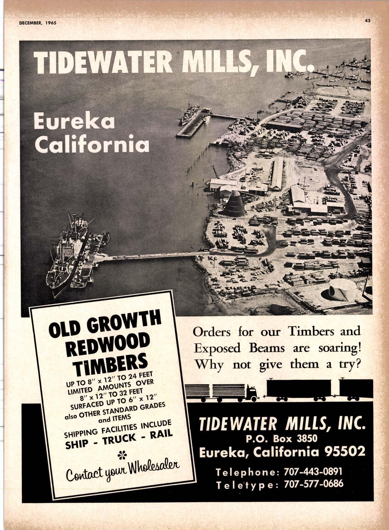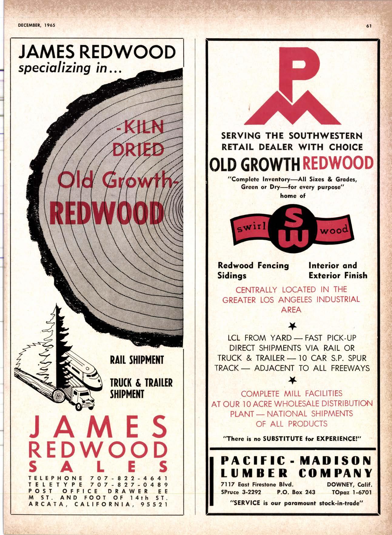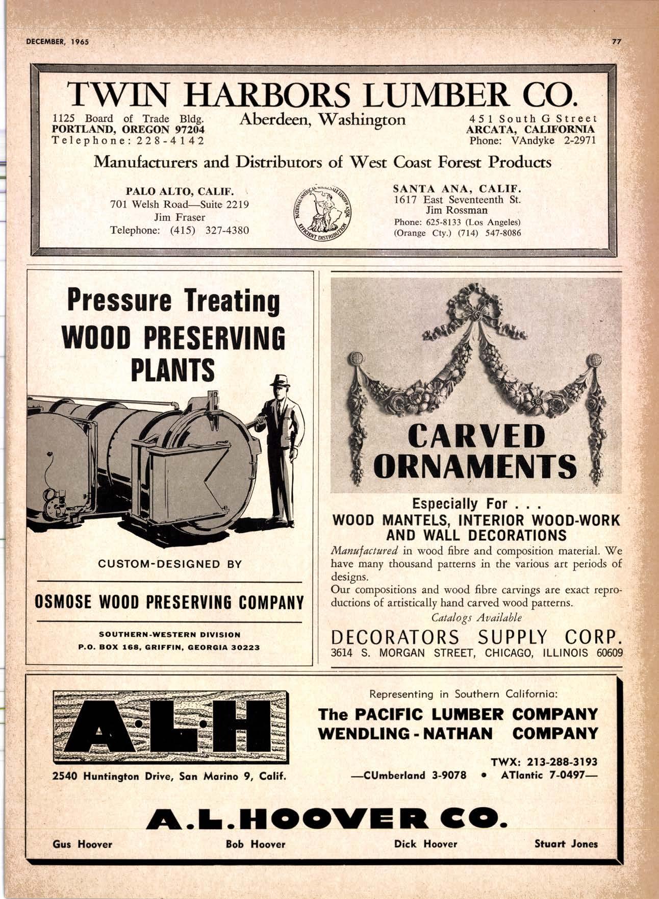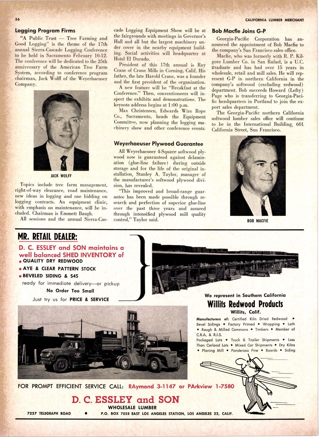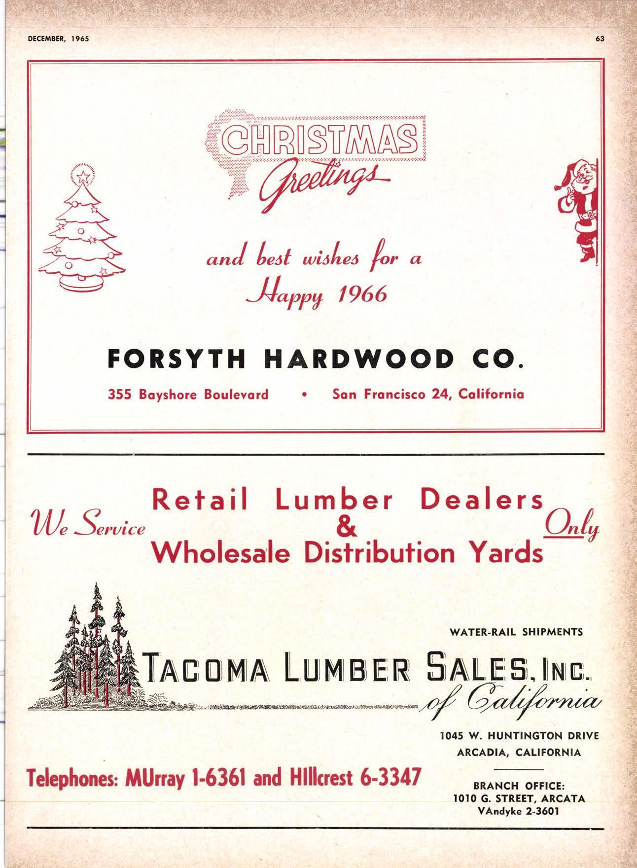 22940ff North Volley lunbcr Soler -------------(209) 139-176 Selmo Gropc Sloke Yord & Pressure Treofins Co. .-.----------------.----..-(2091 89&1231 rreorng lo. .-.----------Tqrter, Webster & Johnson, Inc, ----.--Clinlon t-503t U.S. Plywood Corp. .--.----------...-----.-.-Alihurrt 6812I MODESTO Huntcr Woodworks .--...------...-..-....-------SPruce 5-2544 pole Buildings, Inc. ...-___._._-_-._-_-__..-.....(2Og) 521-7911 Security Point Mfg. Co, ---------..-.ANgelus l-0358 ADArrrrrE 9E19.||I'g||l|,vrlv.swlvE|g'|-vgJgoIov|LtE Treoled Pole Builders------------------.----17141 986-446 Wiffis-lr{oore Point Speciolties.....-.-....!Orroine 4-45O1 Centrol Vclley Box & Lumber -.--.-...--(9161 533'6|,6l tUT BER HANDLING AND SHIPPING; CARRIEnS REDDING Greenfield & Son, Inc., H. M. .--....--.-NEvodo 6-1783 Moin Lumber Co. ._---.._-.._-___-...-__-..__.-.-..-.-..-...2/+l-1352 SOn BefnOrdinO - RiVefSideNorth Volley lumber Sqles----.-.-.-..-..-.-------------213-1OU Sonto ano lieo _ _;Tet*?6i:' Co. .-.---.---........-....-..--.(916) 21|.75*Cofifornio Door Co. of !.A. .--..-.--.-------r:T:--S29-Zql! fron, products .....-....HOword &152g Corlow Compony -------------..-....--.---TAlbot 5-0672 Srockron Box Co. --..--__---_--.._-._--_-__.-_-..:it_Stei Evons Producls Co. (Plywoll Div.l-----.--.-(7141 737-0651 ; Georsic-pocific woiehouse .--'------di";;-Jd;i ['[il"*'ou"' & Johnson ""--""-"-"---""''f61-83:l Horbor Lumber (Al Wilson)-.--.-...-.-.-..-.-..-OV 4-8956 tnlond f.umber c'orpony -.-.-..-..-.....--.-..rninity 7-2001 Hollow Tree Redwood co.--.--..-----------..uon16?tl2_! Key Corporofion -_-_---_.___.__...----_------____---__-gzs-zooo Redwood coosl lumber Co.------------------l7o7l 152.86f. So-Cof Commerciol Steel--------.-.-.--.--...-.l7l11 825-6770 Word Wholesole [br. Co., A{orion H. ---.---162-7251-. Torfer, Websler & Johnson .---...----.-TRiongle 5-1550 WlttlAMS Twin Horbors [umber Co.-------...-.--.--.---.17141 547-8086 Sqn Antonio Construction Co. -------------(9161 473-5381.]Union Lumber Co. ------.--..-.------------------17141 512-#69 WILUTS Woodfond Producrs Co.---------.---.--------V11lYU 6-7981 podulo lumber Co. .--__--_--_-----__--.-_-_--_.-*___45C-5E!At, SAN DIEGO AREA wiilits Redwood producls Co. ---_----___--Grobe 9-{t95,: tui BER AND lur/tBER PRoDucTs OREGON ;' 't Independenl Bldg. itcteriols Co. ----.--.(2131 636-8345 BEND lnlond lumber Compony -------.-----.-.--GRidley 4-1583 Brooks Sconlon _----_--EVergreen 2-i5.ll Mopfe Bros., Inc. .-------.----.-----:-Il:.kojl ?-l?11 CORVALLIS Reitz Co., E. t. -..---....-.--.-.---.-..-.-----..17141 Gt 9-4166 :-lt^--tt: - - .-South Boy lumber Co. tror lig"i"rf----Zl"it ZZZi Con'Fob Equipment Co. --------------...-------(5031 752'2955 Torler, Websler & Johnson ..-.-.....--.----cRidley 7-4174 EUGENE Weyerhoeuser Compony -----..-.----COngress 1-3342 Fremont Foresl Producfs -----------..-..----Dlomond 3-f2ff. : BUltDlNc I ATERIALS Pocific Fir Sotes...--..--...-..-.-.-..........--Dlomond 5.(N{ll. ..-: Arfesio Door Co.--------.-----."-.-- --......-,...----------112-7755 U.S. Plyrood Corp. ....-.--.--......-.-..-..Dlomortd t.t?t+ t': Georgio-Pocific Corp. ....-.---.-.-..---------17111 262-9955 Cecil E. Wingord lumber Co. .-..--.-...-.....-...-345e"f*:l So Col Commerciol Sleel-.---....-*-----:(7111234-1851 MEDFORD :;:i ." Uniled Stotes Plywood Corp. ...-.----.-.-BElmonr 2-5078 Ed Fountoin Lumber Co. NORTHERN CAUFORNIA wendrins-Norhon co. ARCATA L')wE(,Lt .-^^. ---'rt l' m*"*;ru*.lTi_ill::::::::.rlll*: l:ilil ;'ffiirlil,T'co ' .'.""'--r50sr ul'ff;,, Col, Pqcific Soles Corp. .-.-.-...-........--VAnayfe Z-StSt Donl & Rusself Inc..-------------*-C.4.,-}I,S|Y' Hofmes Lurnber Co., ired C.