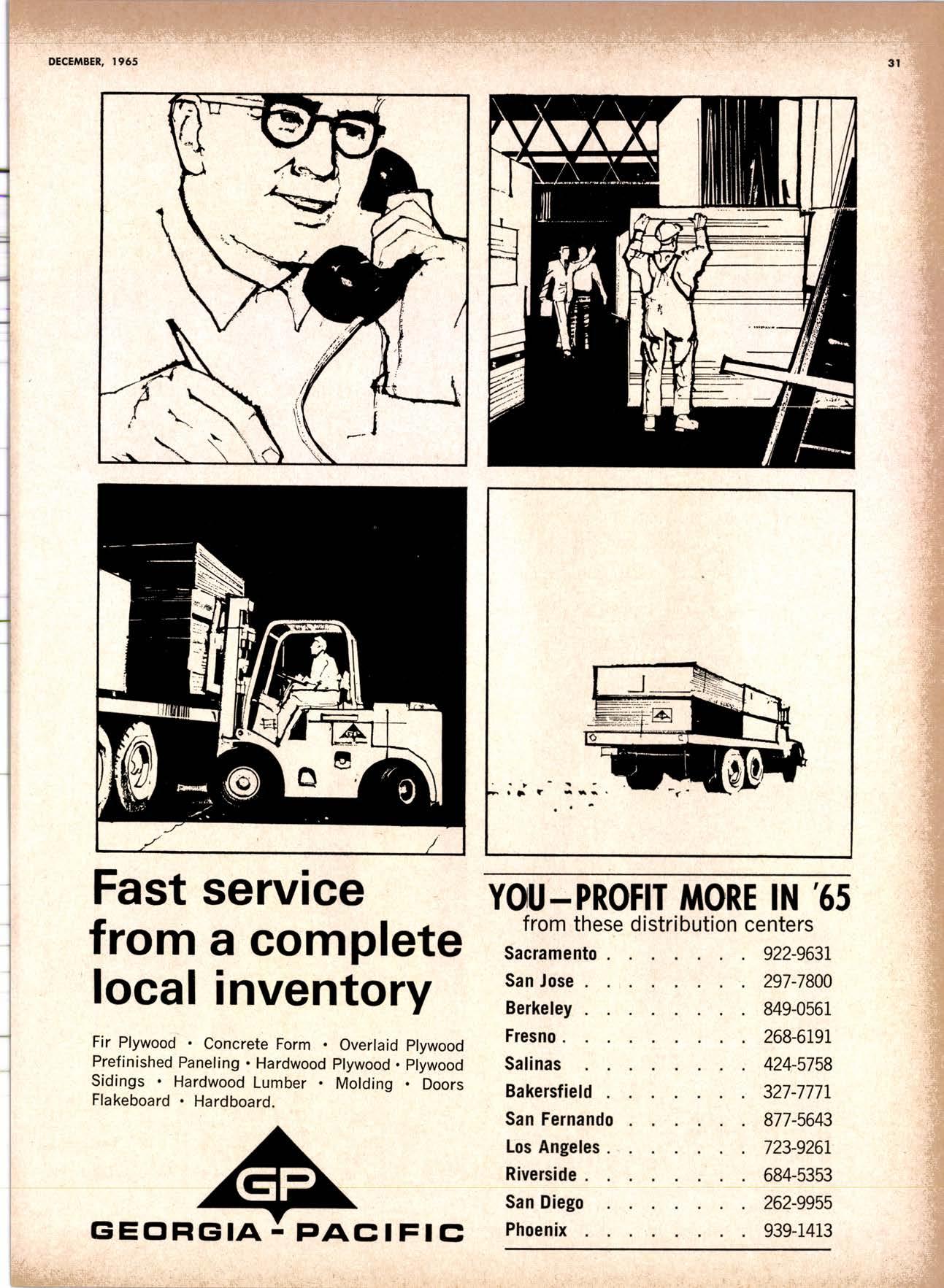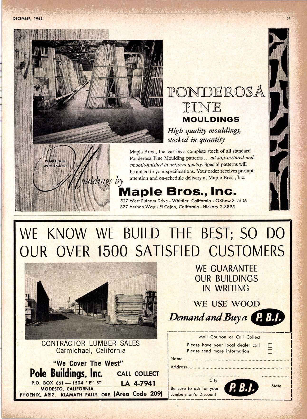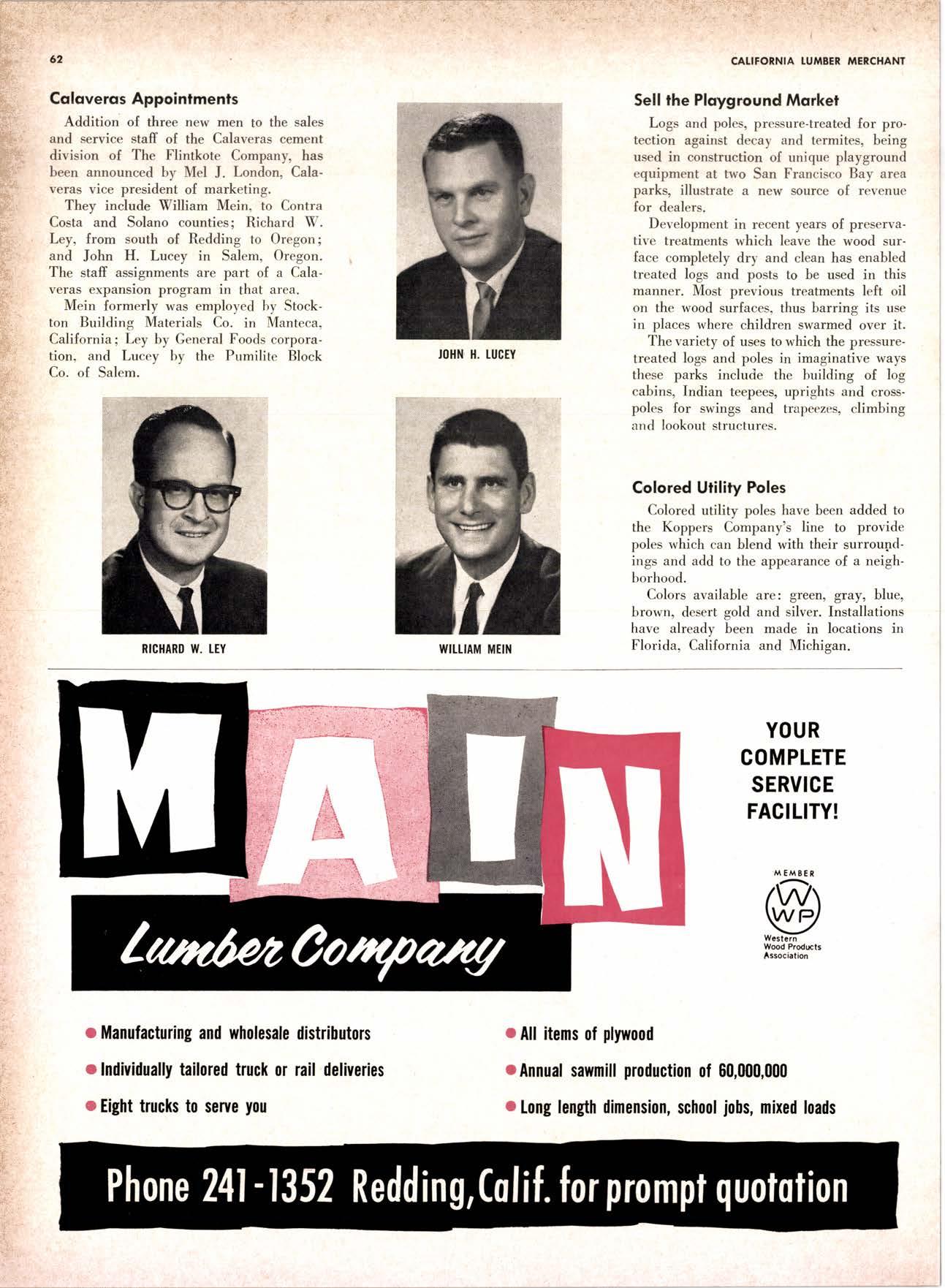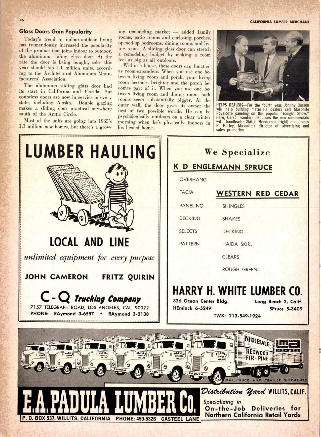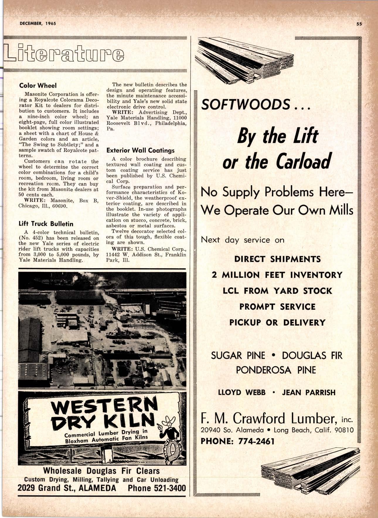 22940ff North Volley lunbcr Soler -------------(209) 139-176 Selmo Gropc Sloke Yord & Pressure Treofins Co. .-.----------------.----..-(2091 89&1231 rreorng lo. .-.----------Tqrter, Webster & Johnson, Inc, ----.--Clinlon t-503t U.S. Plywood Corp. .--.----------...-----.-.-Alihurrt 6812I MODESTO Huntcr Woodworks .--...------...-..-....-------SPruce 5-2544 pole Buildings, Inc. ...-___._._-_-._-_-__..-.....(2Og) 521-7911 Security Point Mfg. Co, ---------..-.ANgelus l-0358 ADArrrrrE 9E19.||I'g||l|,vrlv.swlvE|g'|-vgJgoIov|LtE Treoled Pole Builders------------------.----17141 986-446 Wiffis-lr{oore Point Speciolties.....-.-....!Orroine 4-45O1 Centrol Vclley Box & Lumber -.--.-...--(9161 533'6|,6l tUT BER HANDLING AND SHIPPING; CARRIEnS REDDING Greenfield & Son, Inc., H. M. .--....--.-NEvodo 6-1783 Moin Lumber Co. ._---.._-.._-___-...-__-..__.-.-..-.-..-...2/+l-1352 SOn BefnOrdinO - RiVefSideNorth Volley lumber Sqles----.-.-.-..-..-.-------------213-1OU Sonto ano lieo _ _;Tet*?6i:' Co. .-.---.---........-....-..--.(916) 21|.75*Cofifornio Door Co. of !.A. .--..-.--.-------r:T:--S29-Zql! fron, products .....-....HOword &152g Corlow Compony -------------..-....--.---TAlbot 5-0672 Srockron Box Co. --..--__---_--.._-._--_-__.-_-..:it_Stei Evons Producls Co. (Plywoll Div.l-----.--.-(7141 737-0651 ; Georsic-pocific woiehouse .--'------di";;-Jd;i ['[il"*'ou"' & Johnson ""--""-"-"---""''f61-83:l Horbor Lumber (Al Wilson)-.--.-...-.-.-..-.-..-OV 4-8956 tnlond f.umber c'orpony -.-.-..-..-.....--.-..rninity 7-2001 Hollow Tree Redwood co.--.--..-----------..uon16?tl2_! Key Corporofion -_-_---_.___.__...----_------____---__-gzs-zooo Redwood coosl lumber Co.------------------l7o7l 152.86f. So-Cof Commerciol Steel--------.-.-.--.--...-.l7l11 825-6770 Word Wholesole [br. Co., A{orion H. ---.---162-7251-. Torfer, Websler & Johnson .---...----.-TRiongle 5-1550 WlttlAMS Twin Horbors [umber Co.-------...-.--.--.---.17141 547-8086 Sqn Antonio Construction Co. -------------(9161 473-5381.]Union Lumber Co. ------.--..-.------------------17141 512-#69 WILUTS Woodfond Producrs Co.---------.---.--------V11lYU 6-7981 podulo lumber Co. .--__--_--_-----__--.-_-_--_.-*___45C-5E!At, SAN DIEGO AREA wiilits Redwood producls Co. ---_----___--Grobe 9-{t95,: tui BER AND lur/tBER PRoDucTs OREGON ;' 't Independenl Bldg. itcteriols Co. ----.--.(2131 636-8345 BEND lnlond lumber Compony -------.-----.-.--GRidley 4-1583 Brooks Sconlon _----_--EVergreen 2-i5.ll Mopfe Bros., Inc. .-------.----.-----:-Il:.kojl ?-l?11 CORVALLIS Reitz Co., E. t. -..---....-.--.-.---.-..-.-----..17141 Gt 9-4166 :-lt^--tt: - - .-South Boy lumber Co. tror lig"i"rf----Zl"it ZZZi Con'Fob Equipment Co. --------------...-------(5031 752'2955 Torler, Websler & Johnson ..-.-.....--.----cRidley 7-4174 EUGENE Weyerhoeuser Compony -----..-.----COngress 1-3342 Fremont Foresl Producfs -----------..-..----Dlomond 3-f2ff. : BUltDlNc I ATERIALS Pocific Fir Sotes...--..--...-..-.-.-..........--Dlomond 5.(N{ll. ..-: Arfesio Door Co.--------.-----."-.-- --......-,...----------112-7755 U.S. Plyrood Corp. ....-.--.--......-.-..-..Dlomortd t.t?t+ t': Georgio-Pocific Corp. ....-.---.-.-..---------17111 262-9955 Cecil E. Wingord lumber Co. .-..--.-...-.....-...-345e"f*:l So Col Commerciol Sleel-.---....-*-----:(7111234-1851 MEDFORD :;:i ." Uniled Stotes Plywood Corp. ...-.----.-.-BElmonr 2-5078 Ed Fountoin Lumber Co. NORTHERN CAUFORNIA wendrins-Norhon co. ARCATA L')wE(,Lt .-^^. ---'rt l' m*"*;ru*.lTi_ill::::::::.rlll*: l:ilil ;'ffiirlil,T'co ' .'.""'--r50sr ul'ff;,, Col, Pqcific Soles Corp. .-.-.-...-........--VAnayfe Z-StSt Donl & Rusself Inc..-------------*-C.4.,-}I,S|Y' Hofmes Lurnber Co., ired C.