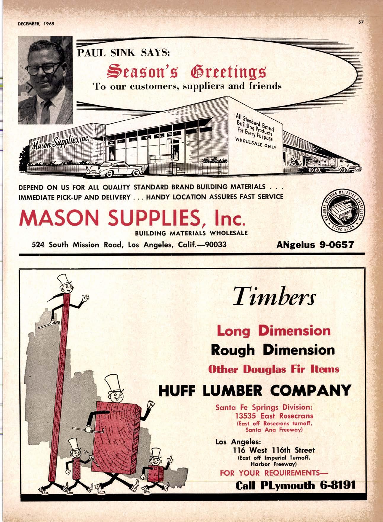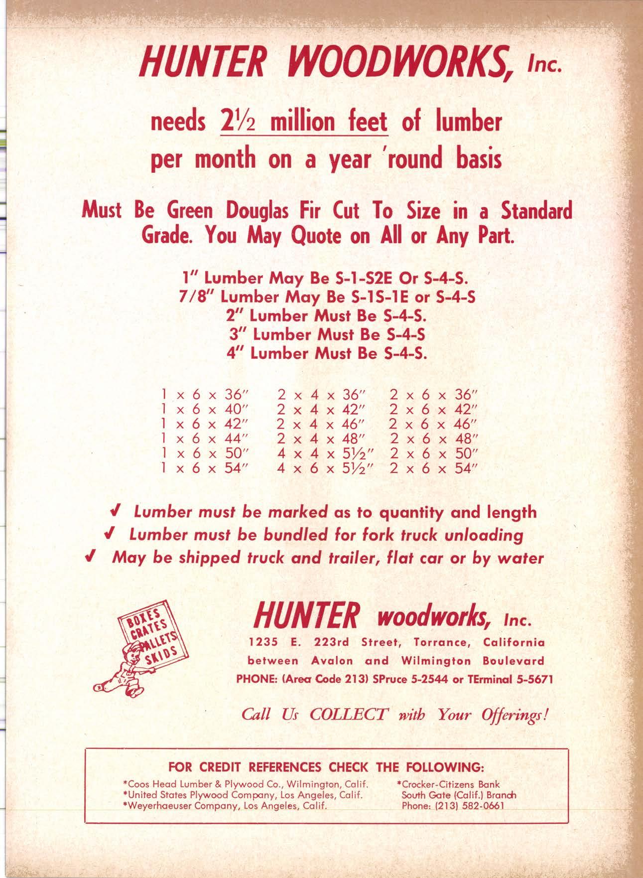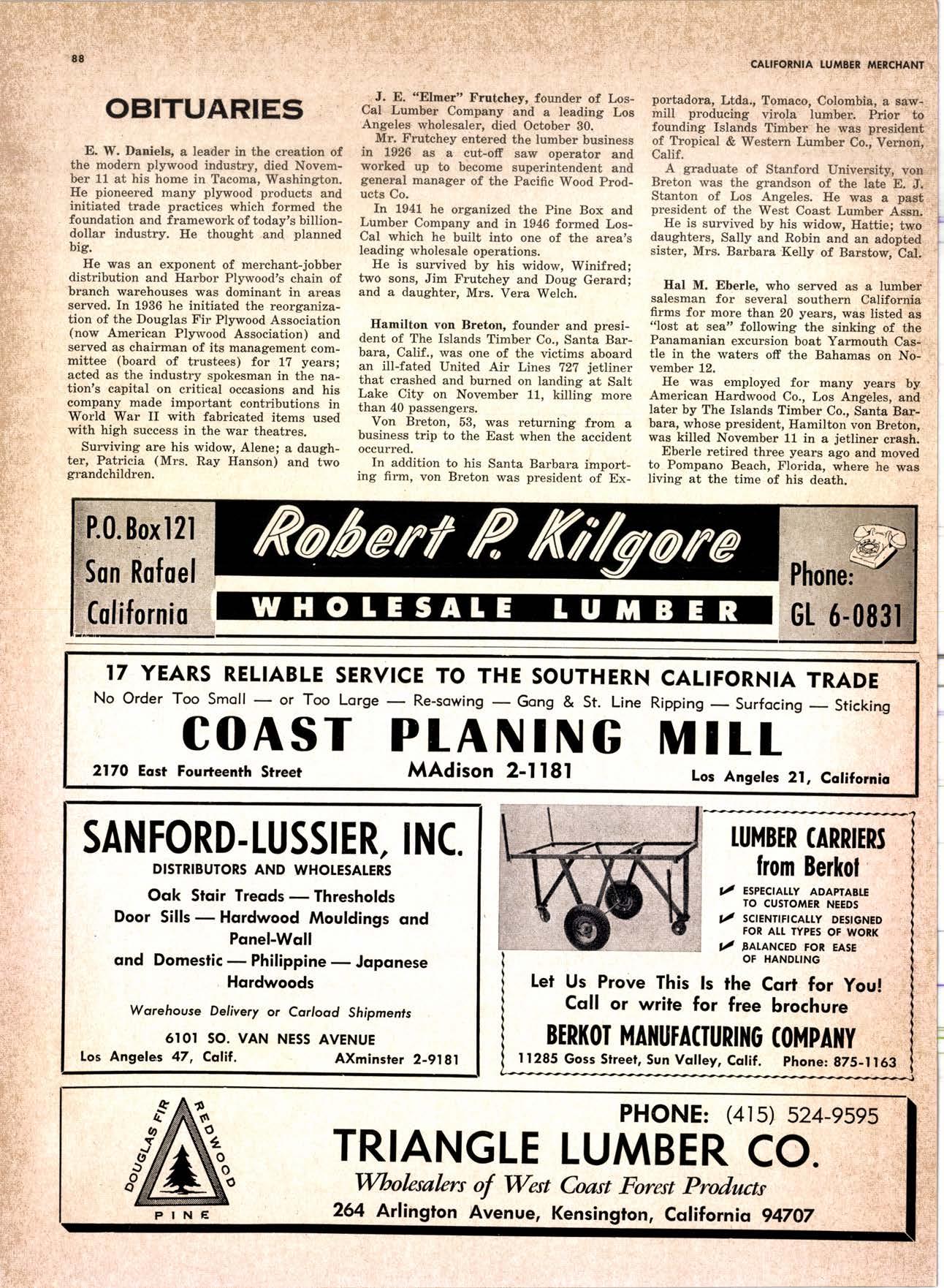 6-083 17 YEARS RELIABLE No Order Too Smollor Too SERVICE TO THE SOUTHERN Lorgefts-5sw|ngGong & St. Line COAST PLANING 2170 Eost Fouileenth Street MAdison 2-l l8l CALIFORNIA TRADE RippingSurfocingSticking MTLL Los Angeles 21, Colifornio SANFORD.IUSSIER, INC. DISTRIBUTORS AND WHOLESALERS Ook Stoir TreodsThresholds Door SillsHordwood Mouldings ond Ponel-Woll ond DomesticPhilippineJoponese Hordwoods Worehouse Delivery or Corlood Shipments 6IOI SO. VAN NESS AVENUE los Angeles 47, Cdlil. AXminster 2-9l1l let Us Prove This Coll or write I.UMBER ORRIERJ fiom Be*ol y' espectarty ADApTABLE TO CUSTOMER NEEDS y' sctrrurtrtcAtty DEstcNED FOR AtT TYPES OF WORK , I/ EATANCED FOR EASE OF HANDI.ING ls fhe Cqrt for You! for free brochure BERKOT MAIIUTA(IURIIIO (OMPAIIY I1285 Goss Street, Sun Volley, Colif. phone: gZS-l163 I TRIANGLE Wbolesalerc of West 264 Arlinoton Avenue, PHONE: (4l s) s24-es95 LUMBER CO. Coast torest Products Kensington, Cqlifornio 94707