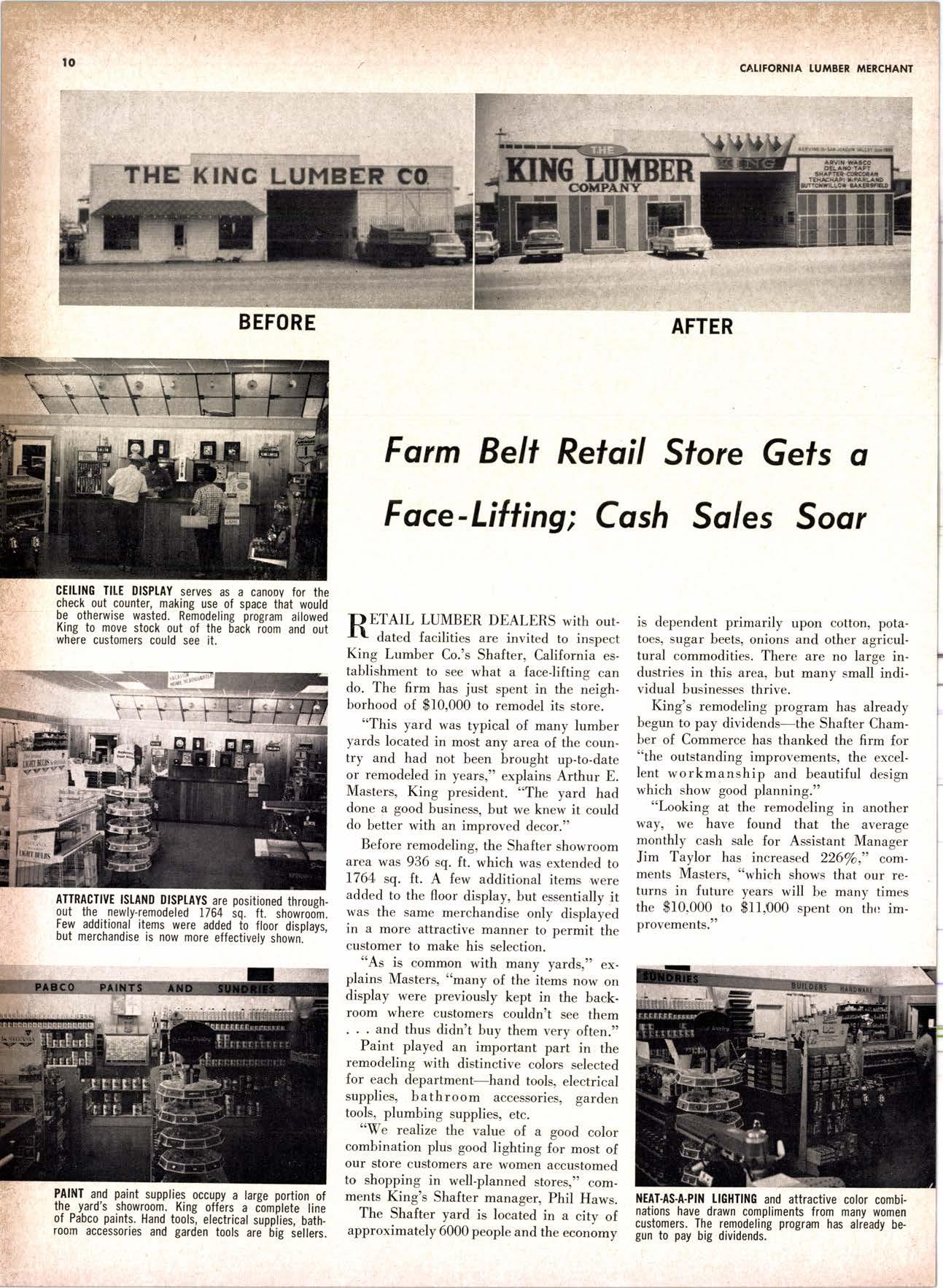 dut"d lacilities are invited to inspecl King Lumber Co.'s Shafter, California establishment to see what a faceliftins can do. The firm has just spent in the neighborhood of $10,000 to remodel its store.