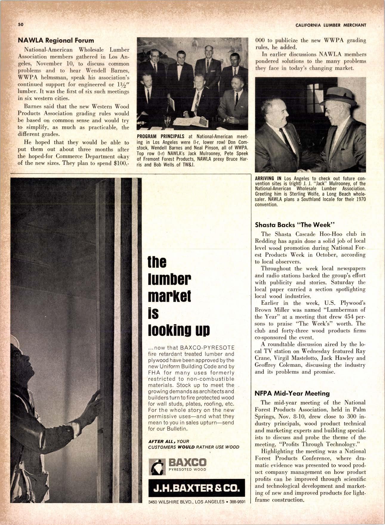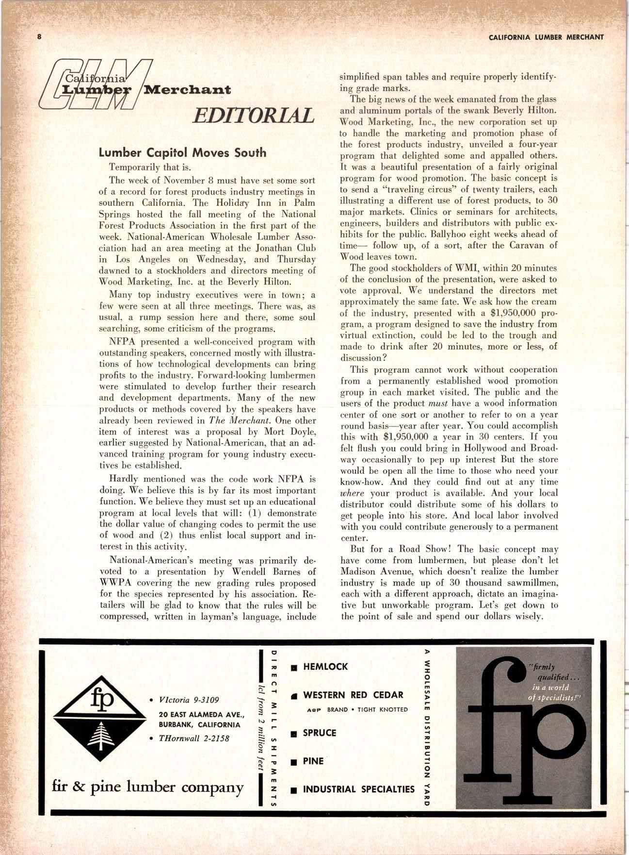 The week of November 8 must have set some sort of a record {or forest products industry meetings in southern California. The Holiday Inn in Palm Springs hosted the fall meeting of the National Forest Products Association in the first part of the week. National-American Wholesale Lumber Association had an area meeting at the Jonathan Club in lros Angeles on Wednesday, and Thursday dawned to a stockholders and directors meetine of Wood Marketing, Inc. at the Beverly Hilton.