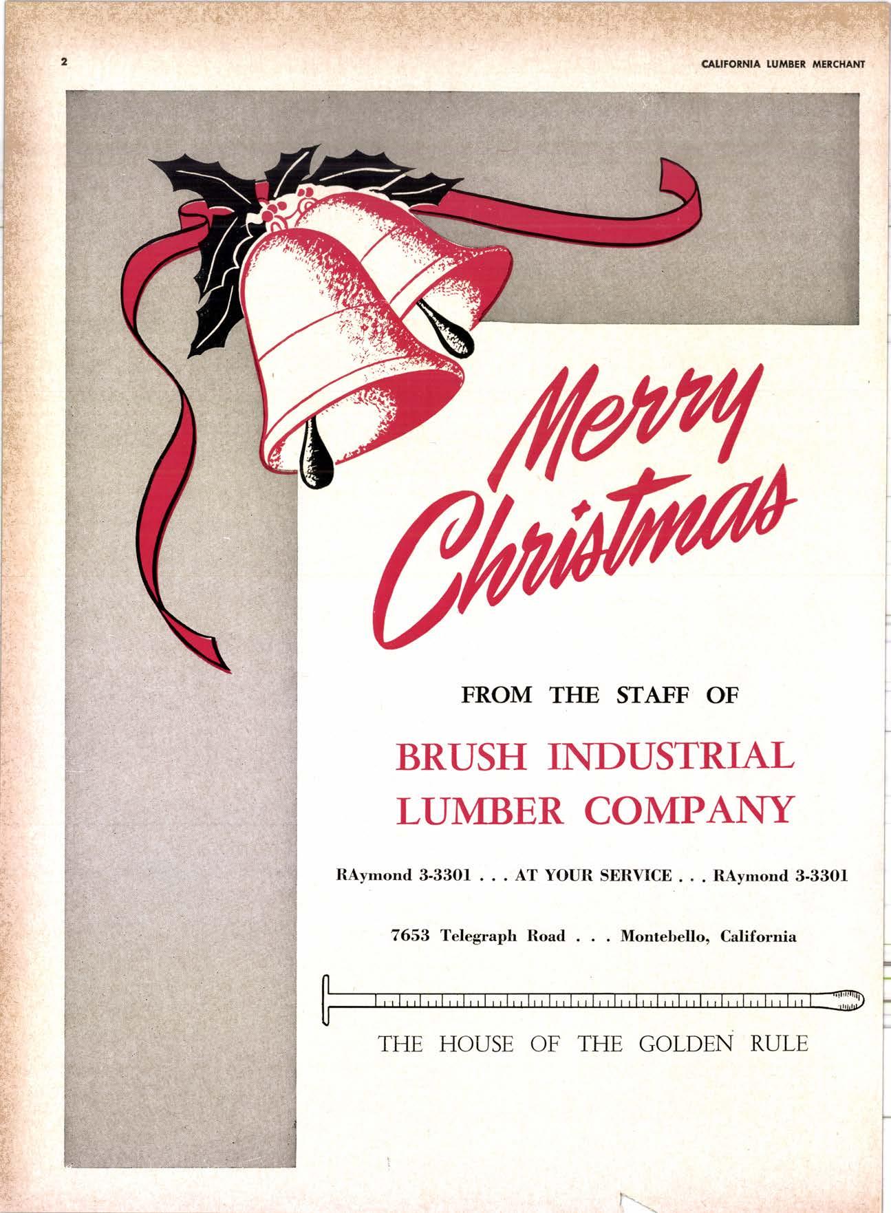 : CAI,|FOT}{A LuI,IBEN ilEICHANT FROM THE STAFF OF BRUSH INDUSTRIAL LUMBER COMPAI\TY RAymond 3-33Of . . . AT YOUR SERVICE . . . RAymond 3-33O1 7653 Telegraph Road .. . Montebello, California THE HOUSE OF THE ;. l-.._ GOLDEN